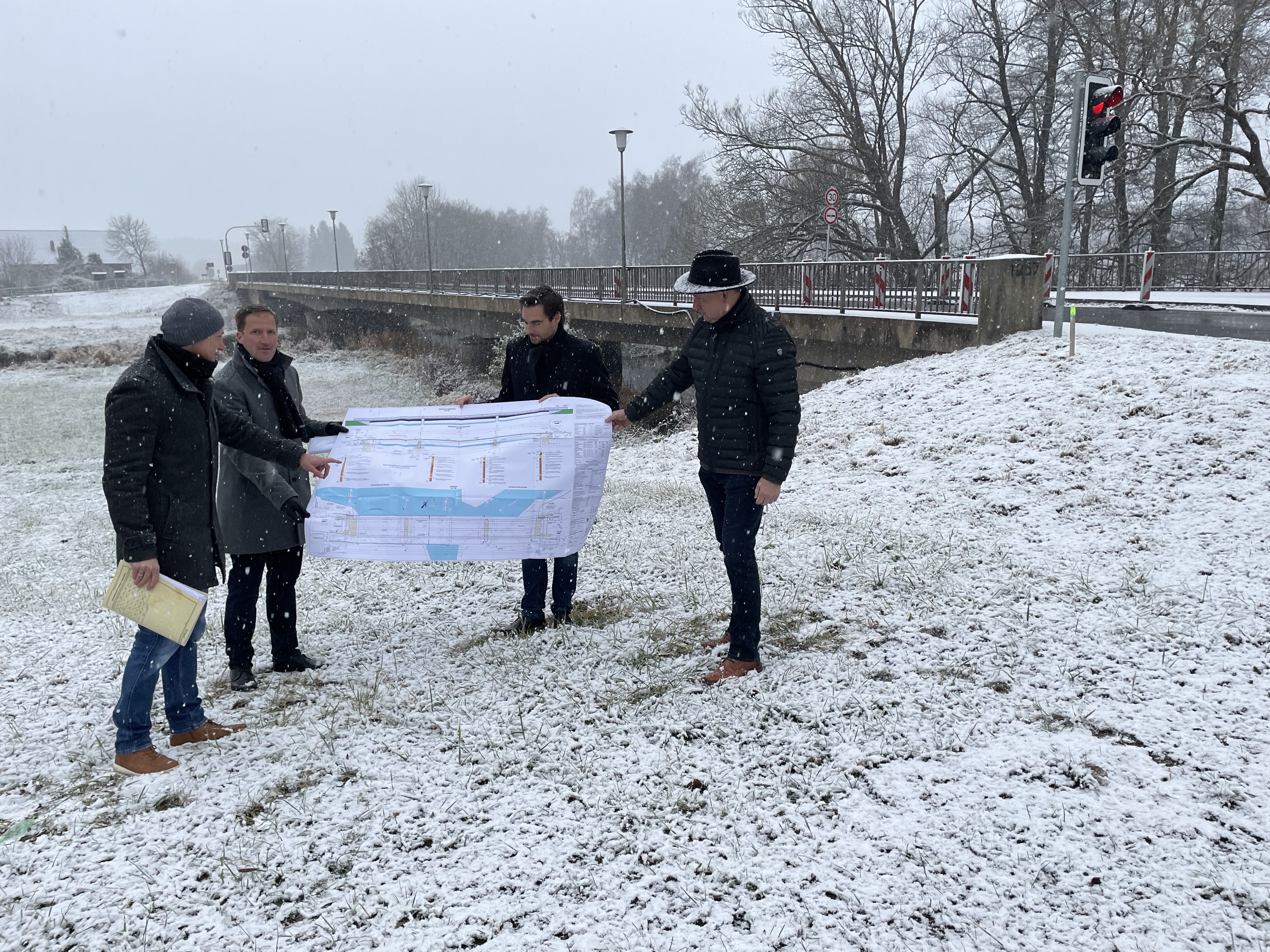 Bild: Andreas Kick und Tobias Bäumler vom Staatlichen Bauamt Amberg-Sulzbach erläutern MdL Dr. Stephan Oetzinger und Bürgermeister Richard Kammerer die aktuellen Pläne der Haidenaabbrücke, deren Neubau im Frühjahr kommenden Jahres beginnen soll.