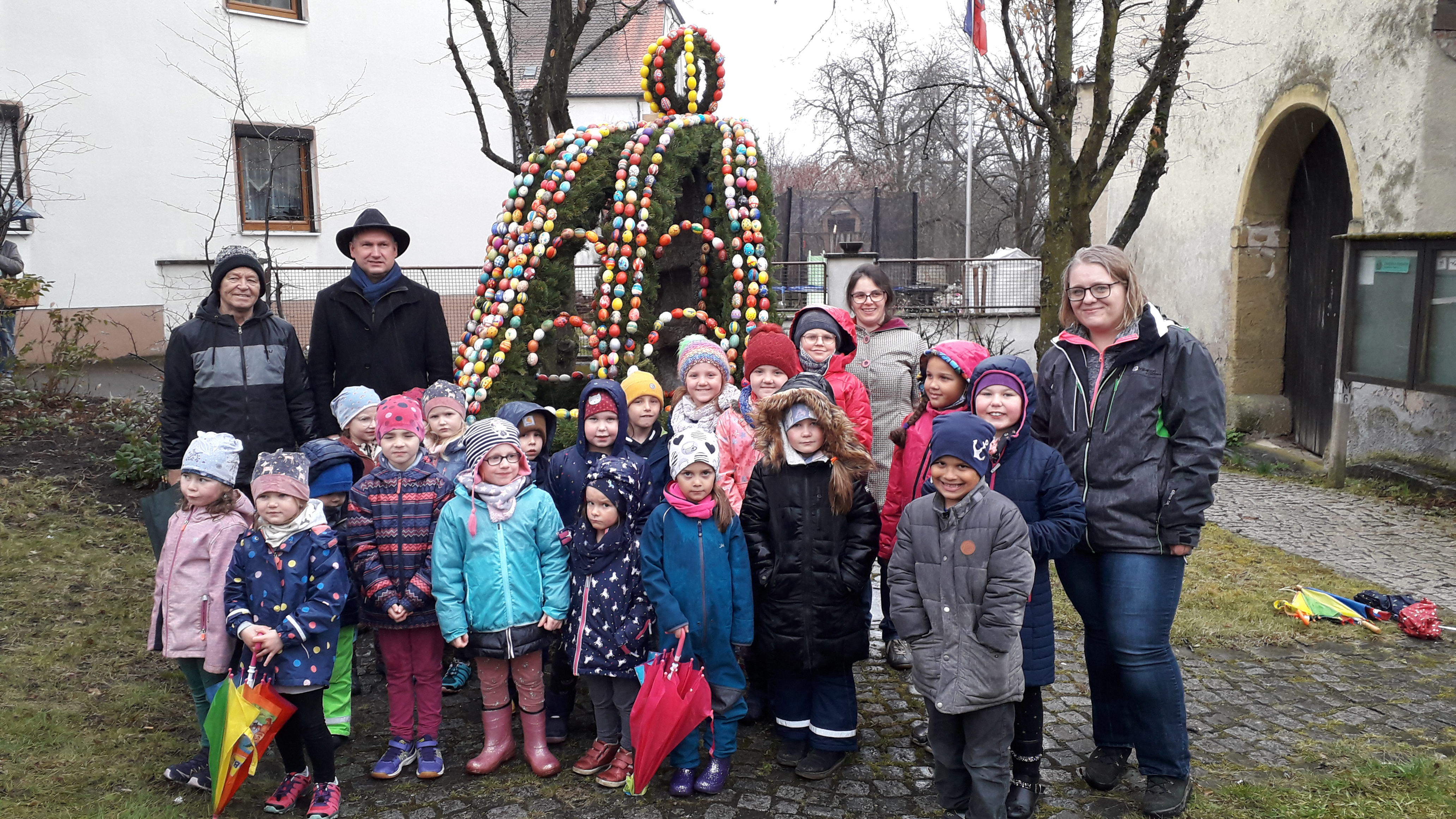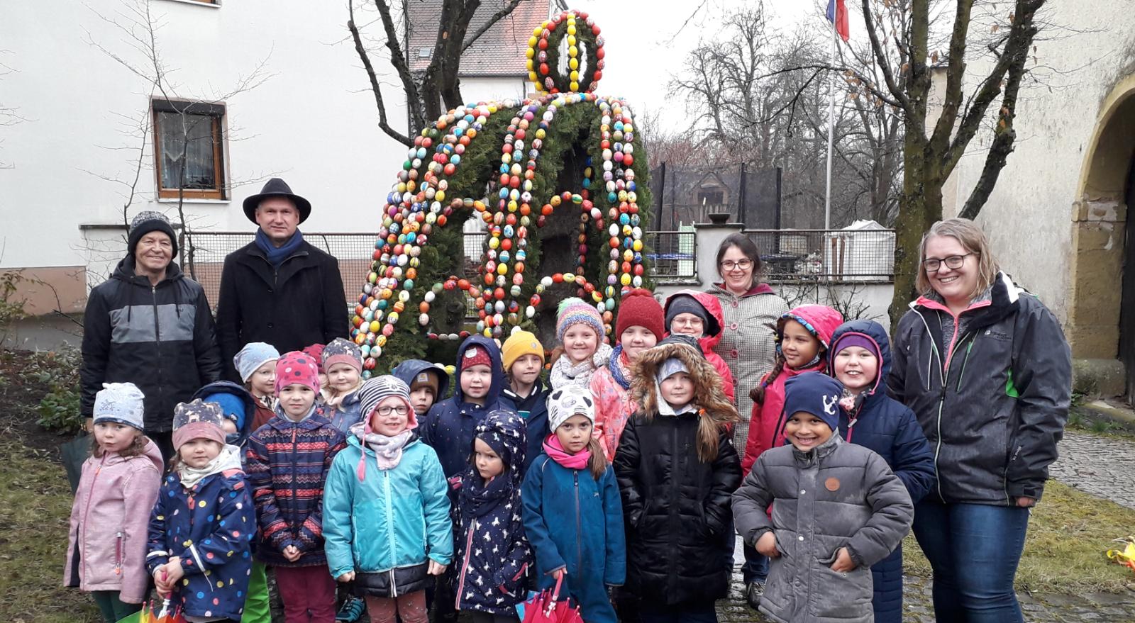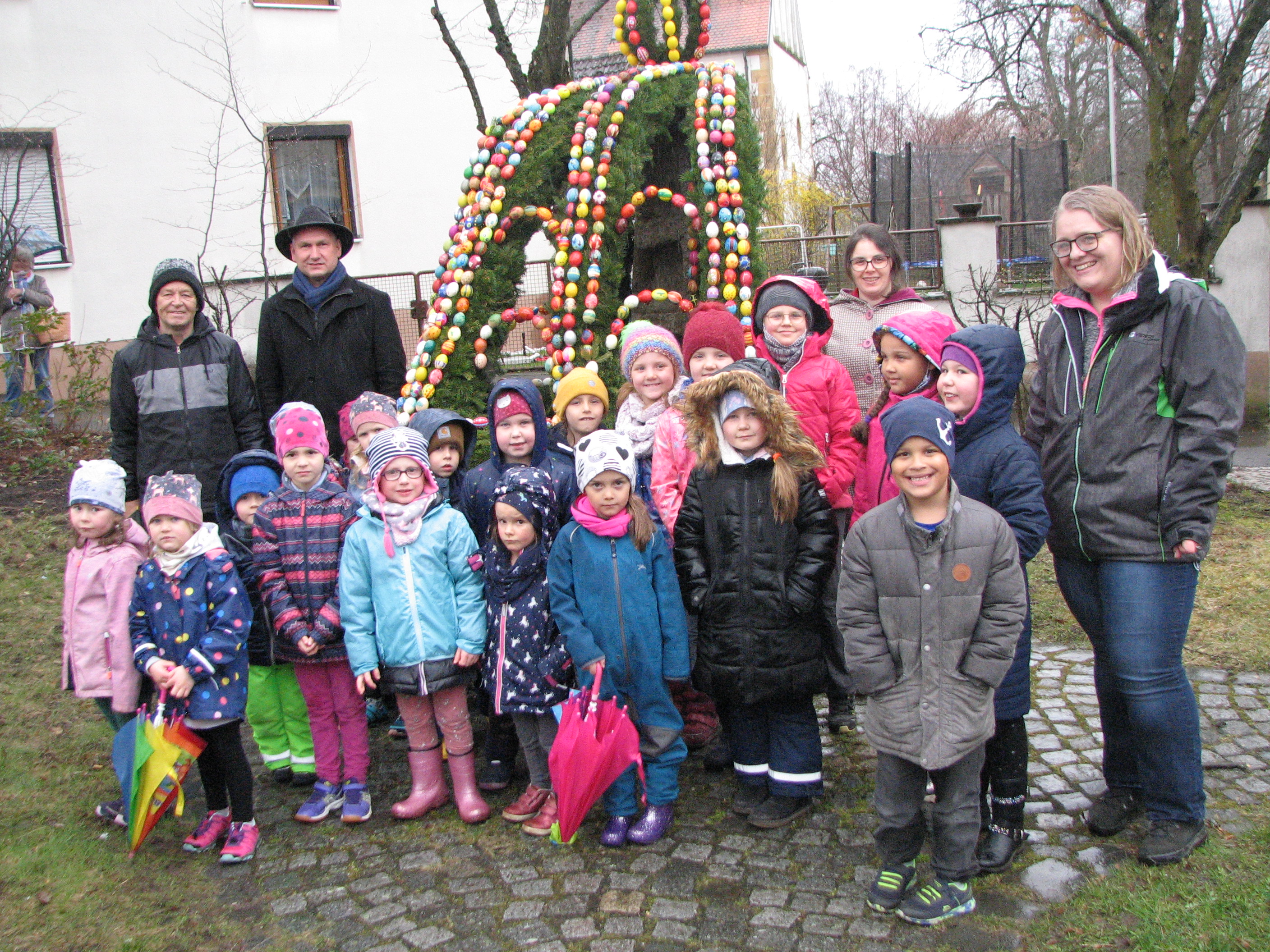 Kolping-Vorsitzender Georg Schlehuber dankte dem Kinderchor. Die Frauen der Kolpingsfamilie verteilten an die Kinder bunte Ostereier. Auch Bürgermeister Richard Kammerer war zum Aufstellen des Osterbrunnens gekommen und dankte der Kolpingsfamilie für ihr Engagement sowie Susanne Hausmann und dem Kinderchor.