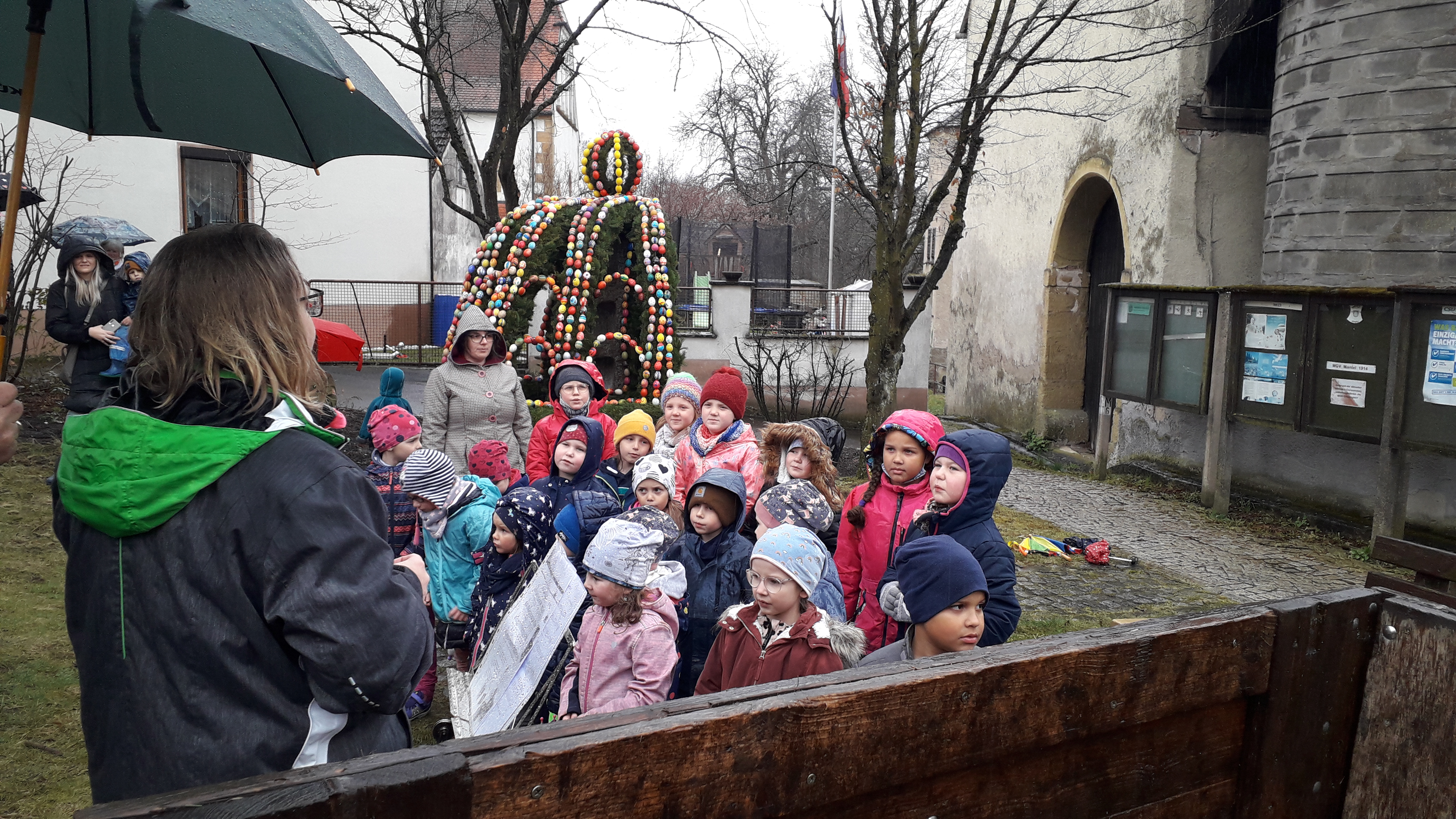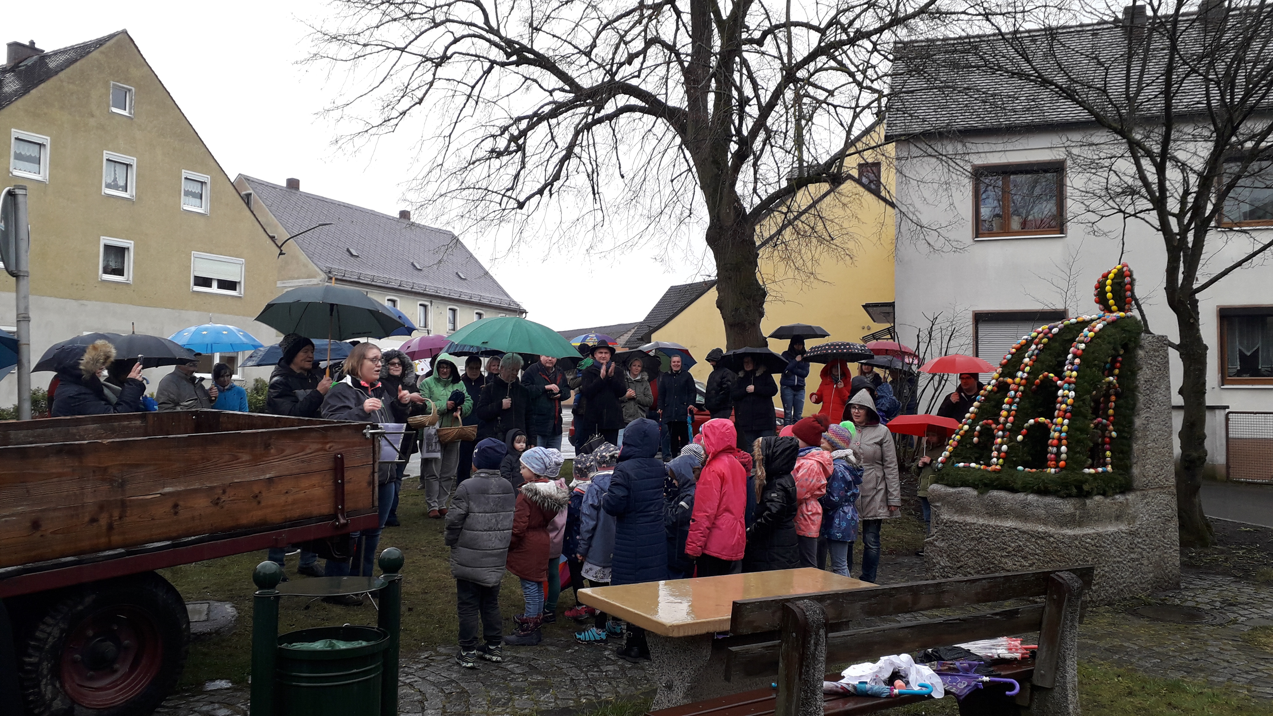 923 handbemalte, bunte Ostereier zieren die Brunnenkrone. Viele Zuschauer, vor allem Familien mit Kindern, erwarteten schon die Kolping-Männer. Der Kinderchor Pfiffikusbande unter Leitung von Susanne Hausmann sang das Lied vom Osterfest. Bei leichtem Nieselregen und kühler Temperatur erzählten die Kinder gesanglich die Geschichte von Stups, dem Osterhasen, der öfter mal auf die Nase fällt.