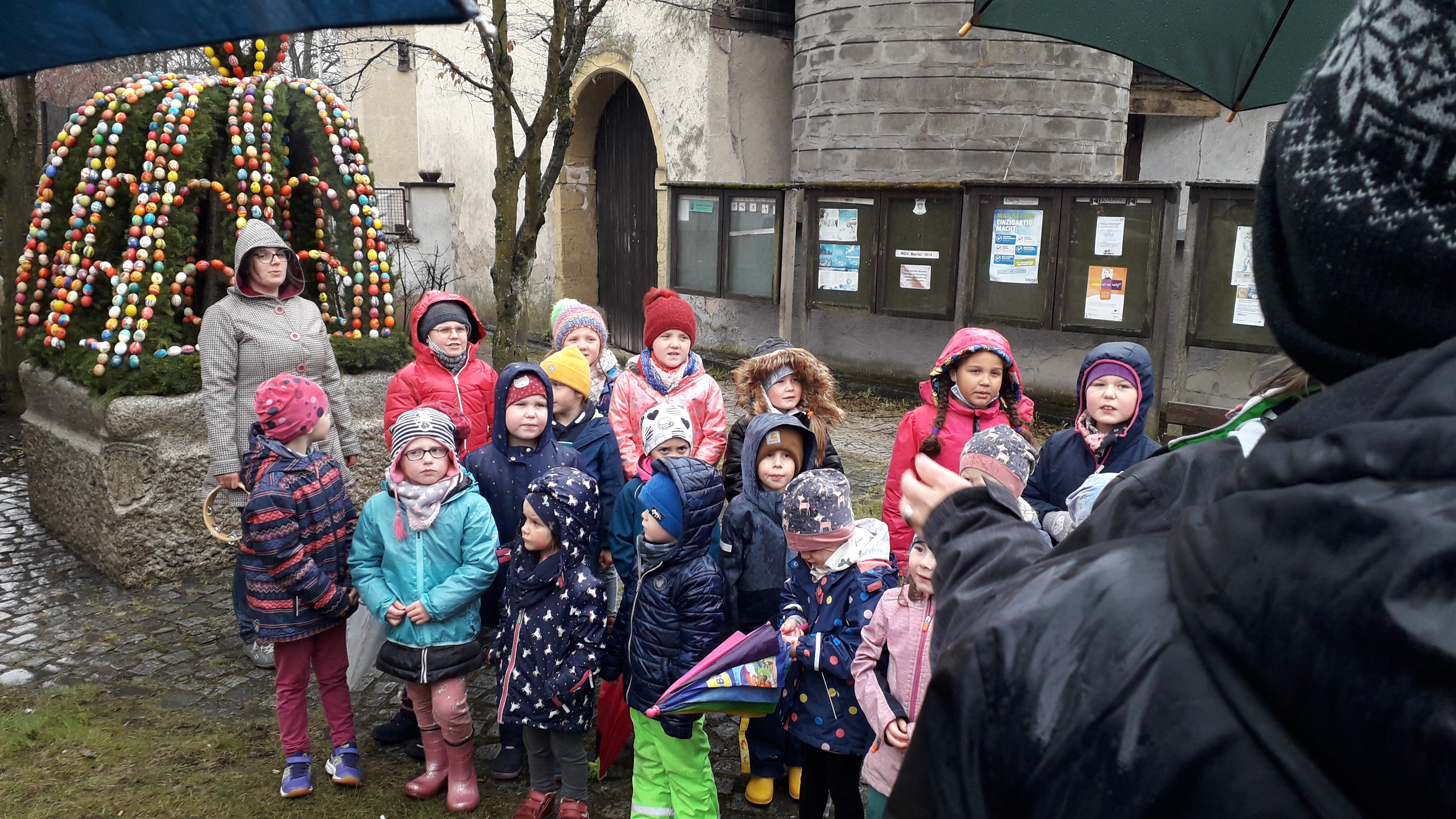 Mit Liedbeiträgen zum Osterfest erfreuten die Kinder mit Leiterin Susanne Hausmann vor dem Osterbrunnen alle Anwesenden.