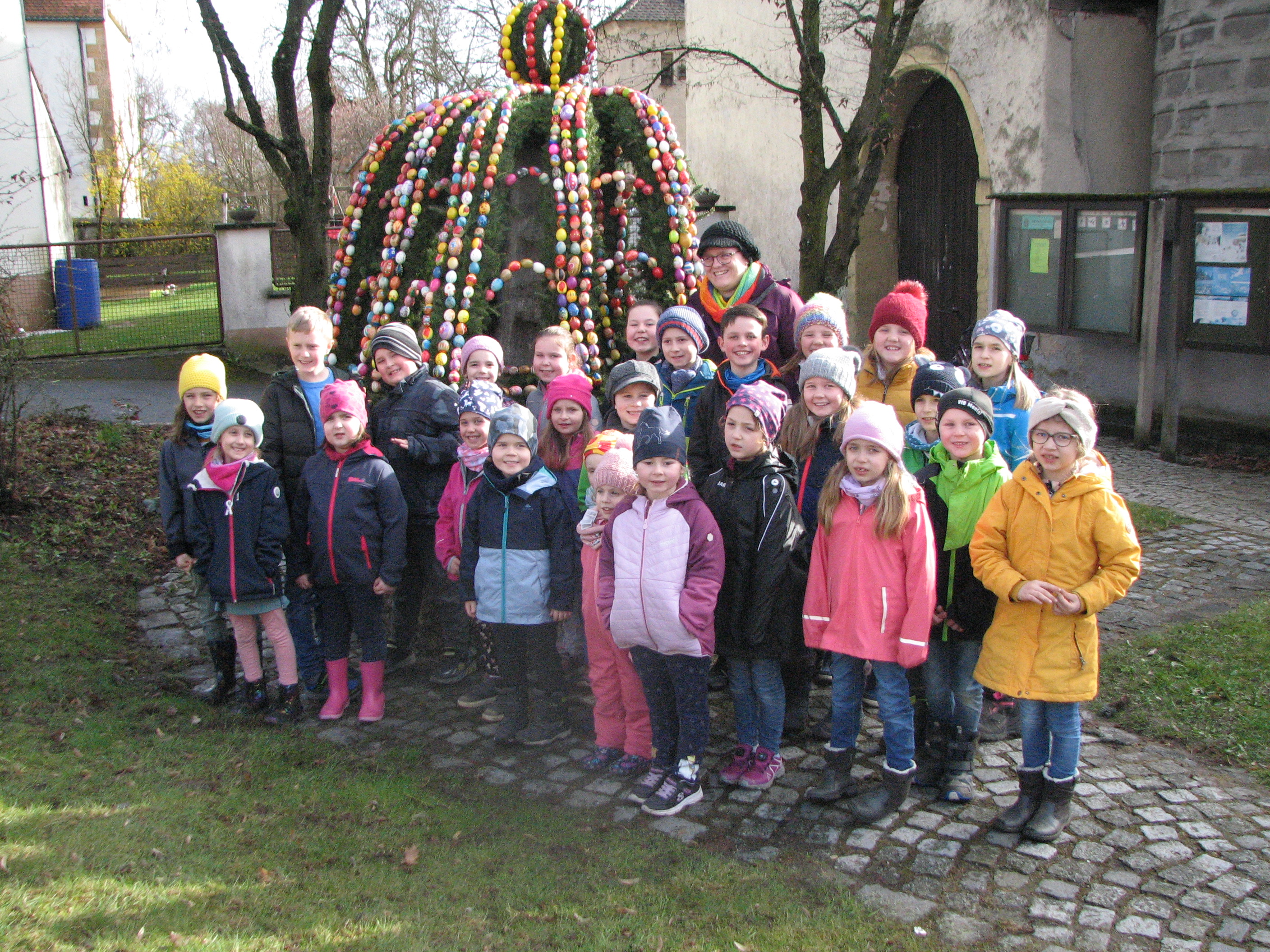 Kolping-Vorsitzender Georg Seiser dankte dem Kinderchor. Die Frauen der Kolpingsfamilie verteilten an die Kinder bunte Ostereier. Auch Bürgermeister Richard Kammerer war zum Aufstellen des Osterbrunnens gekommen und überreichte der Kolpingsfamilie eine Spende und dankte Susanne Hausmann und dem Kinderchor. Der Osterbrunnen soll bis 30. April den Brunnen zieren, dann wird er wieder abgebaut. Im nächsten Jahr soll als besondere Attraktion ein Straußenei dazukommen.