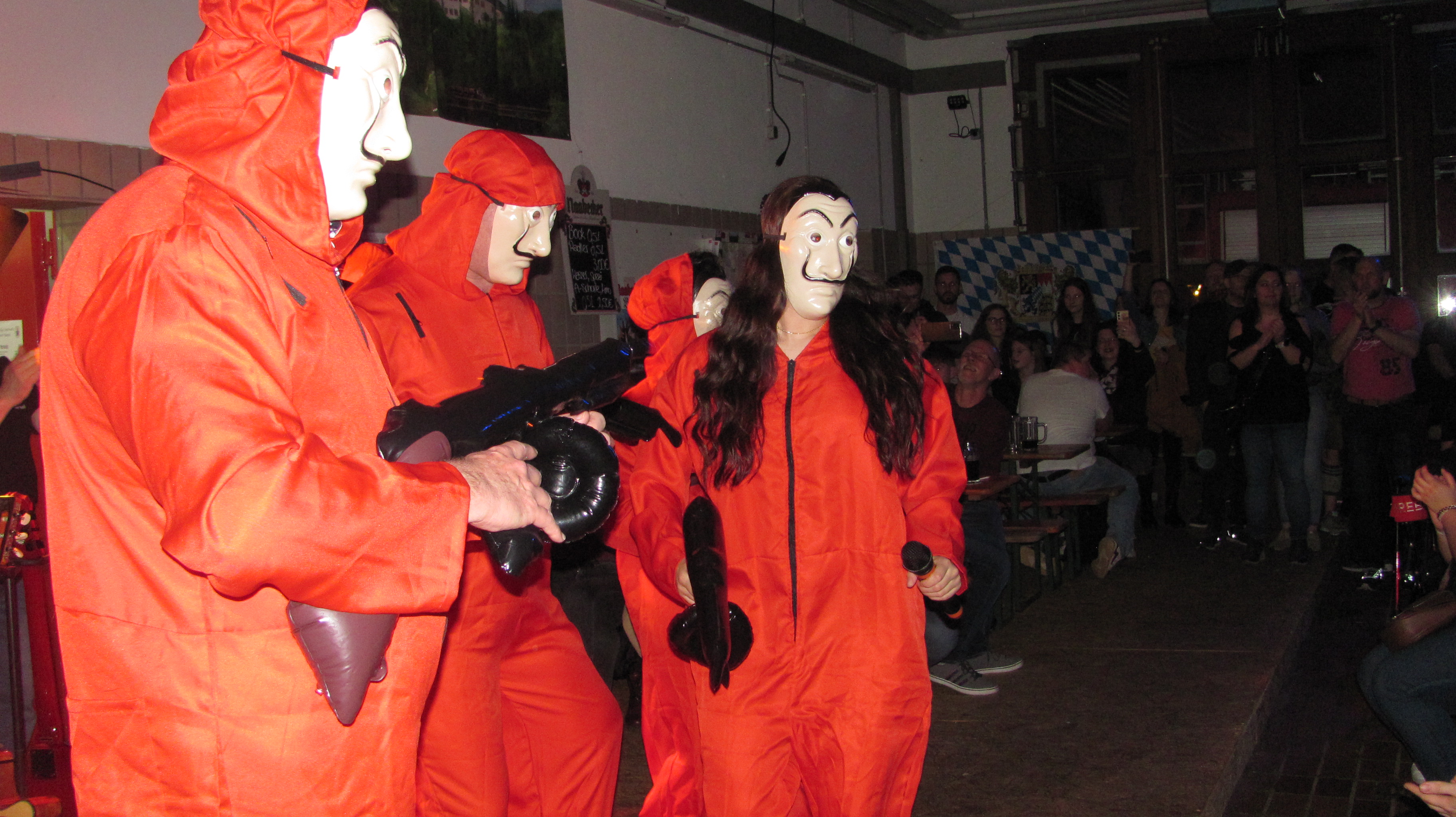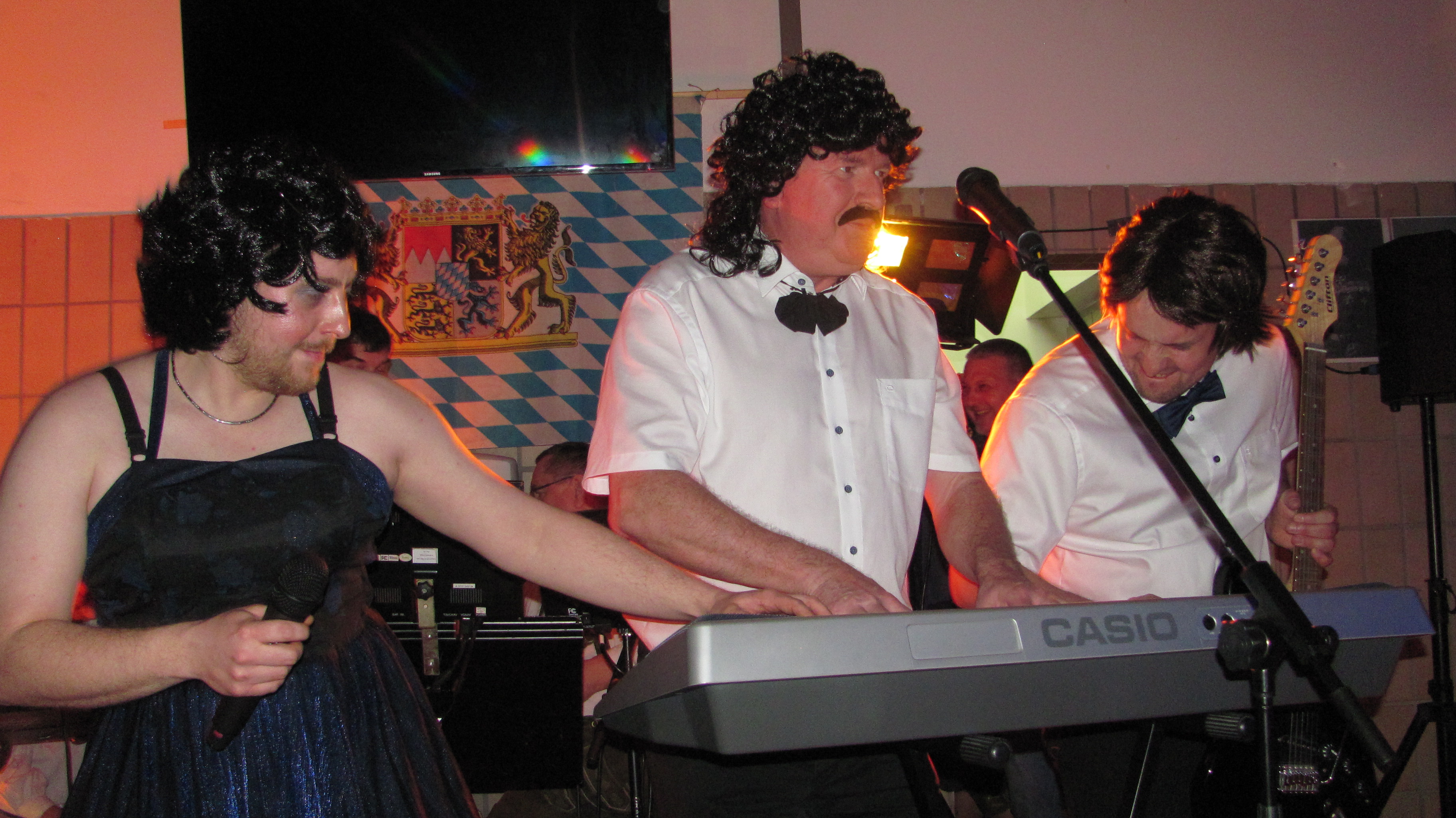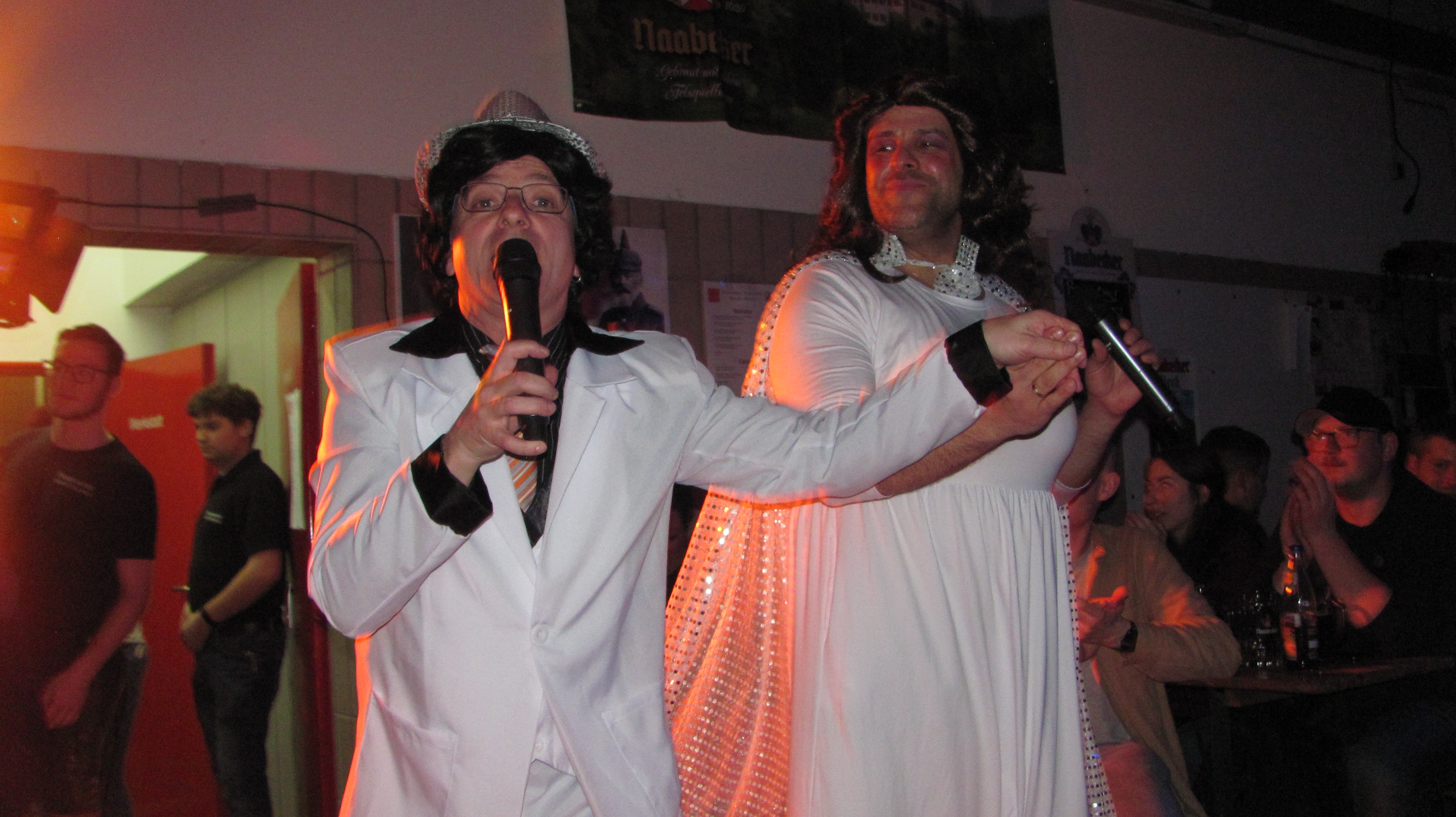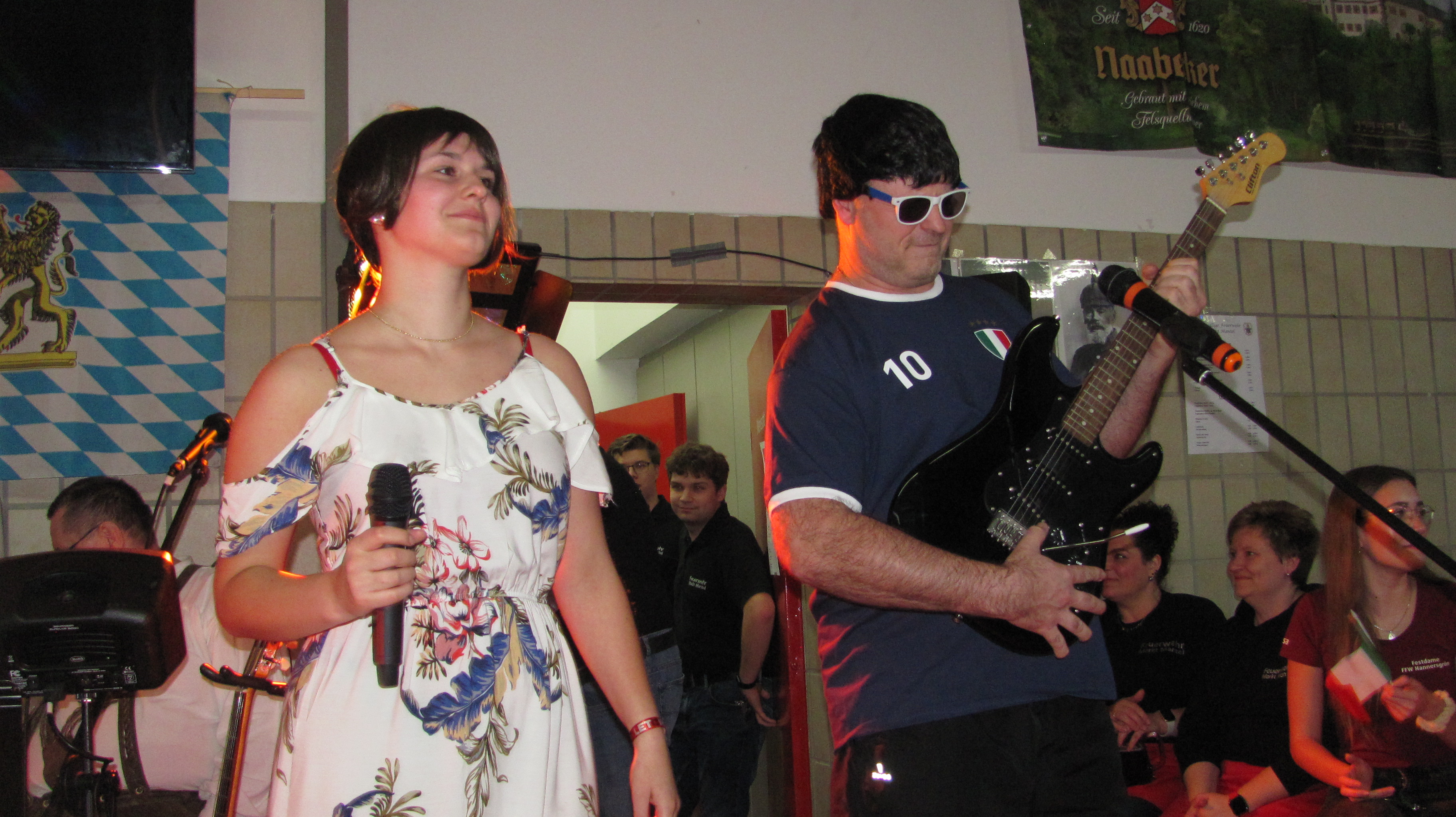 Bis auf den letzten Platz gefüllt war das Feuerwehrhaus am Samstag beim Starkbierfest der Floriansjünger. Schon um 21 Uhr war auch in der Bar kein freies Plätzchen mehr zu finden. Bürgermeister Richard Kammerer zapfte gekonnt mit zwei Schlägen das erste Fass Naabecker Doppelbock an, kein Tropfen ging daneben. Die Halbe Bockbier kostete drei Euro, Limonaden der halbe Liter 2,50 Euro also war das „Durstlöschen“ relativ Preisgünstig. Das Krautkopfduo erfreute mit Volksmusik, Country von Truckstop und auch Schlagern. Die Gäste wunderten sich, dass die Spreisekarte auch in italienischer Sprache verfasst war. So war die Portion Geräuchertes mit Brot in Italienisch übersetzt: „1Porzione di carne affumicata con pane.“ Das Geheimnis wurde dann gegen 22 Uhr von Stefan Lippik gelüftet, der den Höhepunkt des Abends ankündigte. „Wir hatten schon viele Stars hier wie Thomas Gottschalk, Barrack Obama, die Schlagerparade und dieses Jahr kündigte Lippik zur Abwechslung Italiens Rock- und Popstars der 80iger an. Die Hymne des AC Mailand schmetterten Ricchi e Poveri aus dem Jahr 1983 „Sara perche ti amo“. Als Sängerin glänzte Thomas Lindner und als Sänger Martin Göppl und erstmal dabei Josef Auer. 1982 und 1986 gab es von Al Bano und Rmonia Power die Hits „Felicita“ und Sempre sempre“. Hans Reil als Al Bano hatte alle Hände voll zu tun um seine temperamentvolle Romina (Matthias Ay) im Zaum zu halten die viele Männer anflirtete und mehr als einen Kopf größer war als er. Beide Hits schmetterte das Publikum kräftig mit. Den Eröffnungshit der Fußwall WM 1990 „Un`estate italiana“ präsentierten die italienische Rockröhre Gianna Nannini und Eduardo Bennato. In den Kostümen steckten Tochter Luisa Bock und Vater Stefan Bock. Die Halle kochte dann bei „Bella Ciao“ ursprünglich ein Lied des italienischen Widerstands 2018 für 39 Wochen als Remake in den Charts. Hier liefen alle Akteure als Partisanen nochmal zur Höchstform auf. Bürgermeister Kammerer lud die „Showstars“ wie jedes Jahr dann in die Bar ein. Gefeiert wurde bis spät in die Nacht.