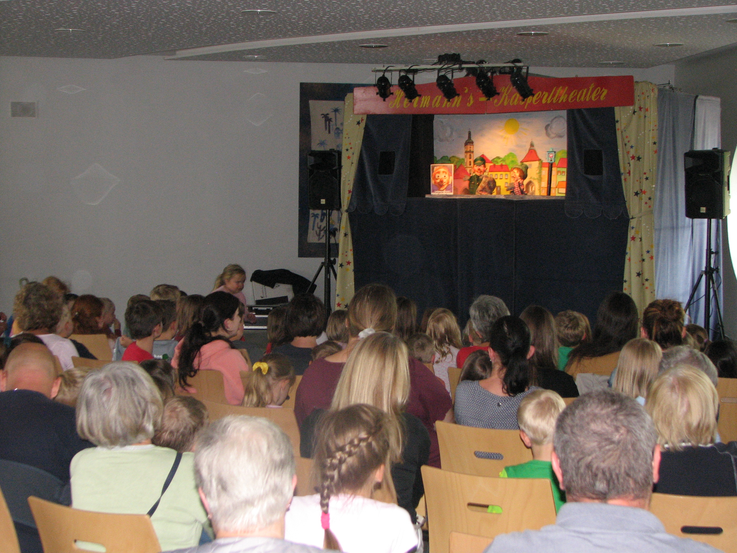 Nach dem fünfmaligen Öffnen des Vorhangs war alles wieder gut und die Kinder atmeten auf. In der Pause versorgte das Helfer-Team alle Besucher mit Getränken. Hermann´s Kasperltheater nutzt die Sommerferien und besucht auch die Kinder in weiteren Ortschaften.