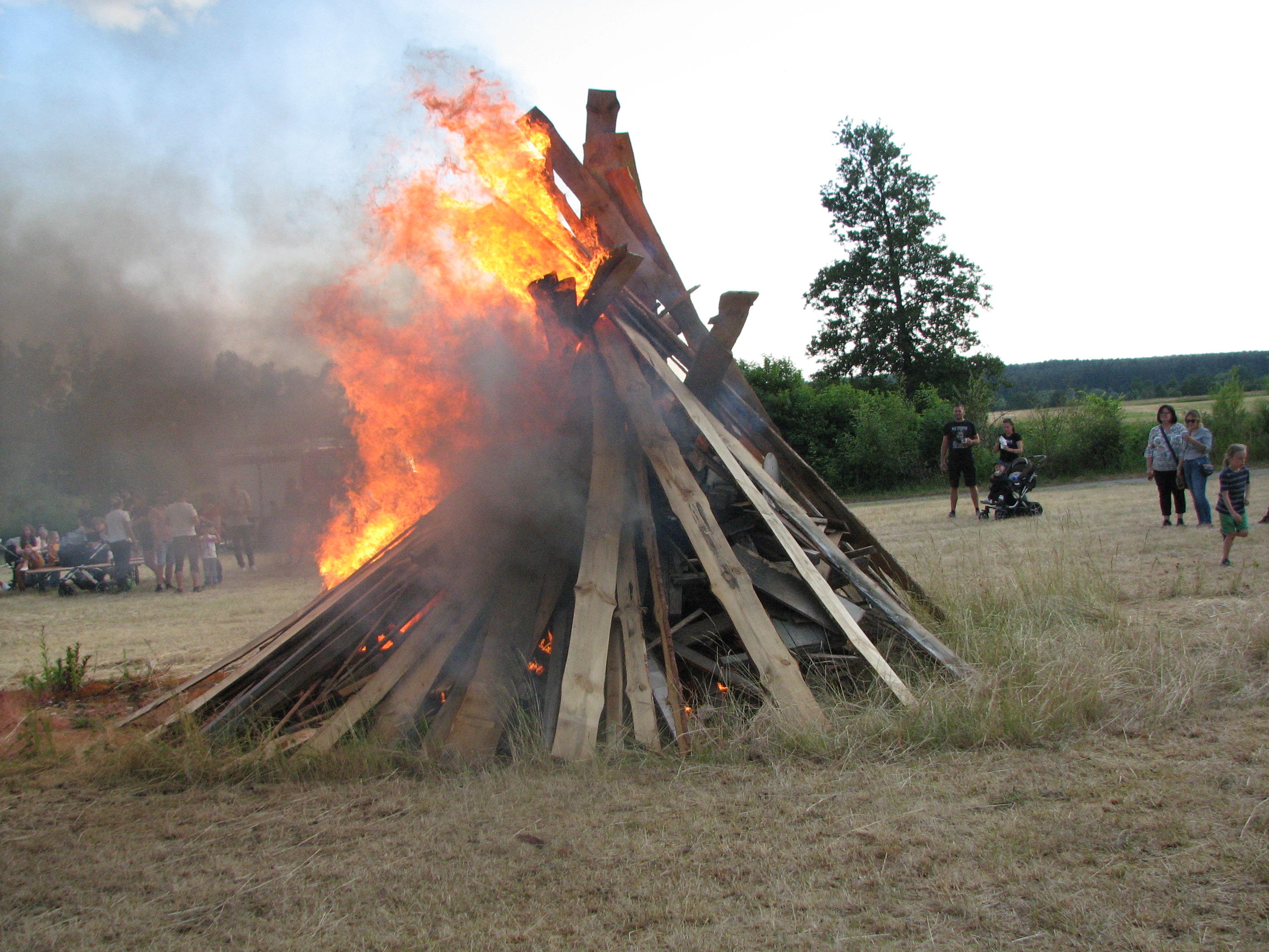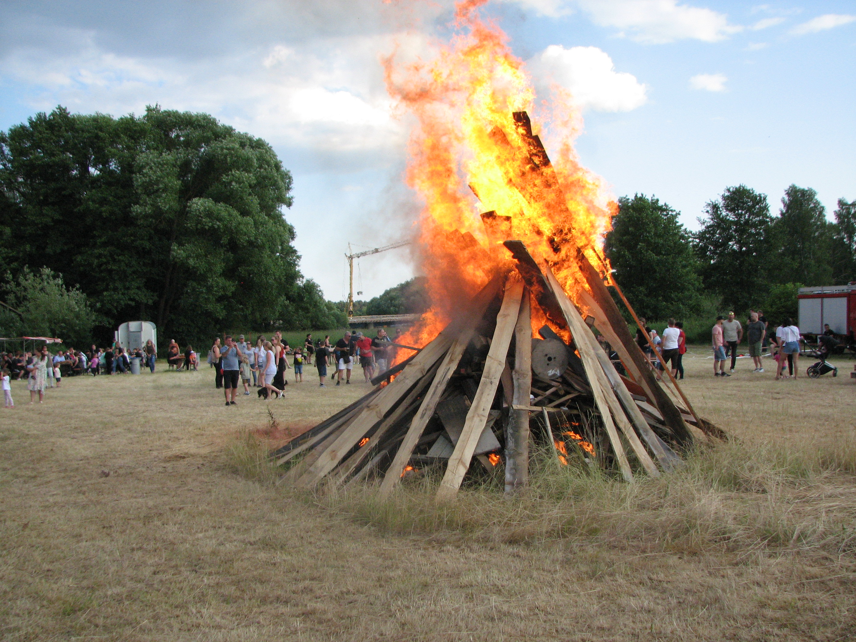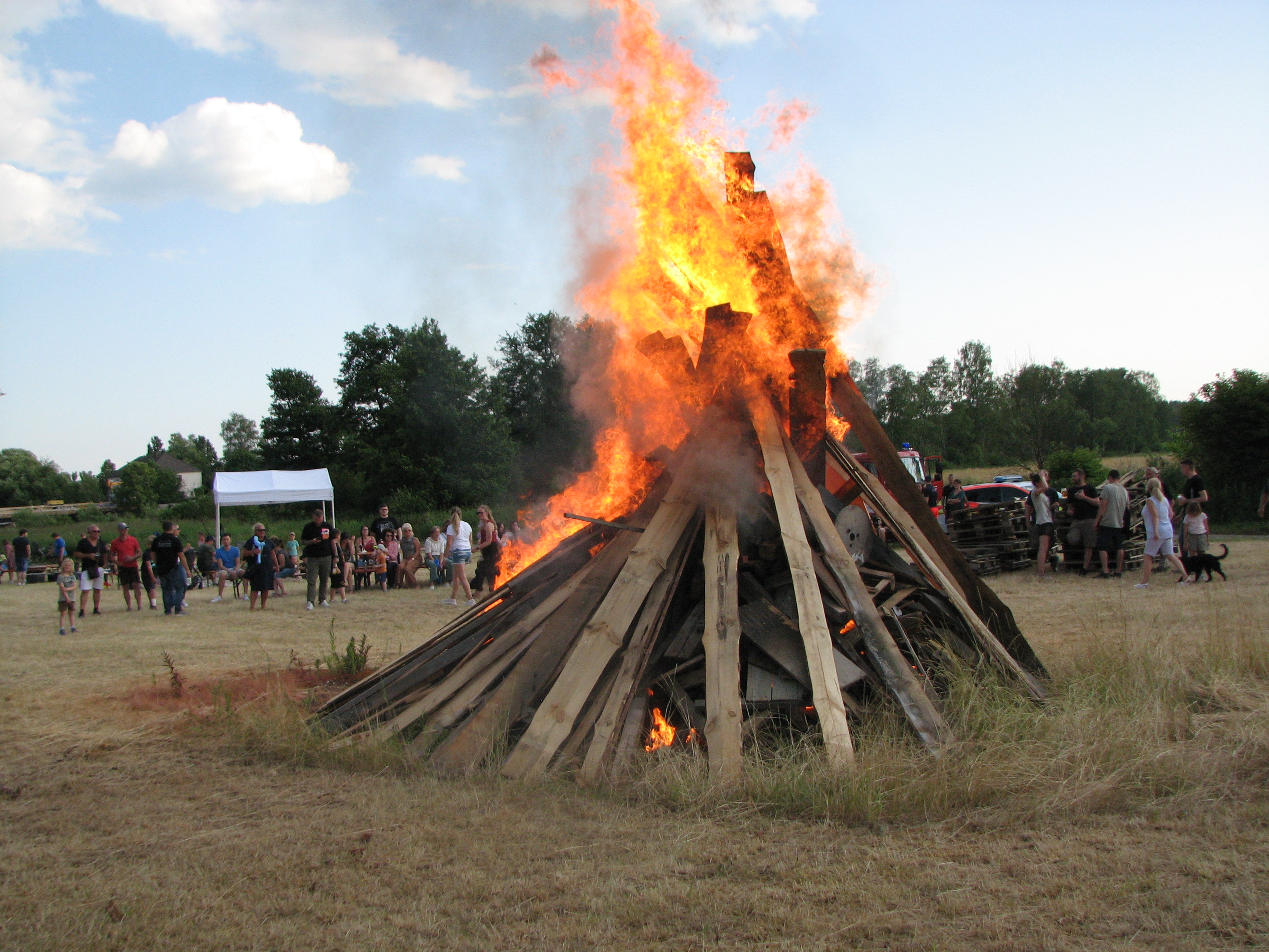 Die Kinder warteten bereits mit ihren Fackeln auf ihren Einsatz, als die bereitstehende Feuerwehr zu einem aktuellen Einsatz gerufen wurde. Gott sei Dank waren die Floriansjünger bald wieder da, so dass die Kinder mit ihren Fackeln unter strenger Überwachung das Johannisfeuer entzünden konnten. Bei Einbruch der Dunkelheit stieg ein hell loderndes Feuer gen Himmel. Am Abend lockte die Bar mit Schnaps und Likören, Weiß-, Rotwein, Shots und Longdrinks. Bis in die Nacht herrschte reges Treiben, und man hatte den Eindruck, dass sich die Besucher auf einen fröhlichen Sommer vorbereiteten.