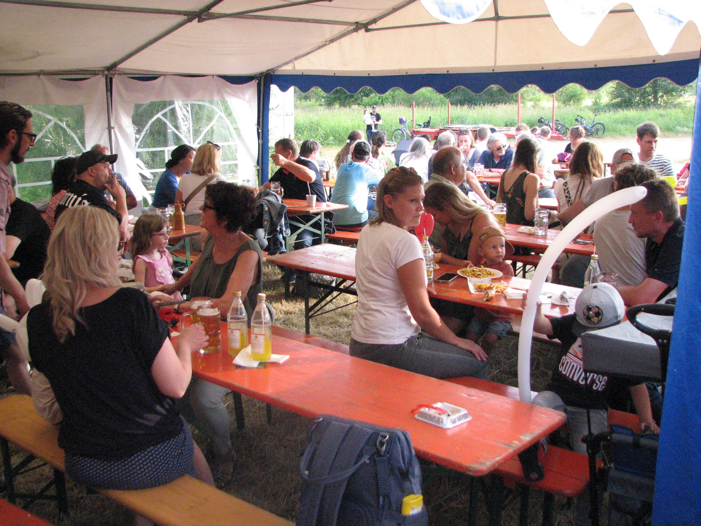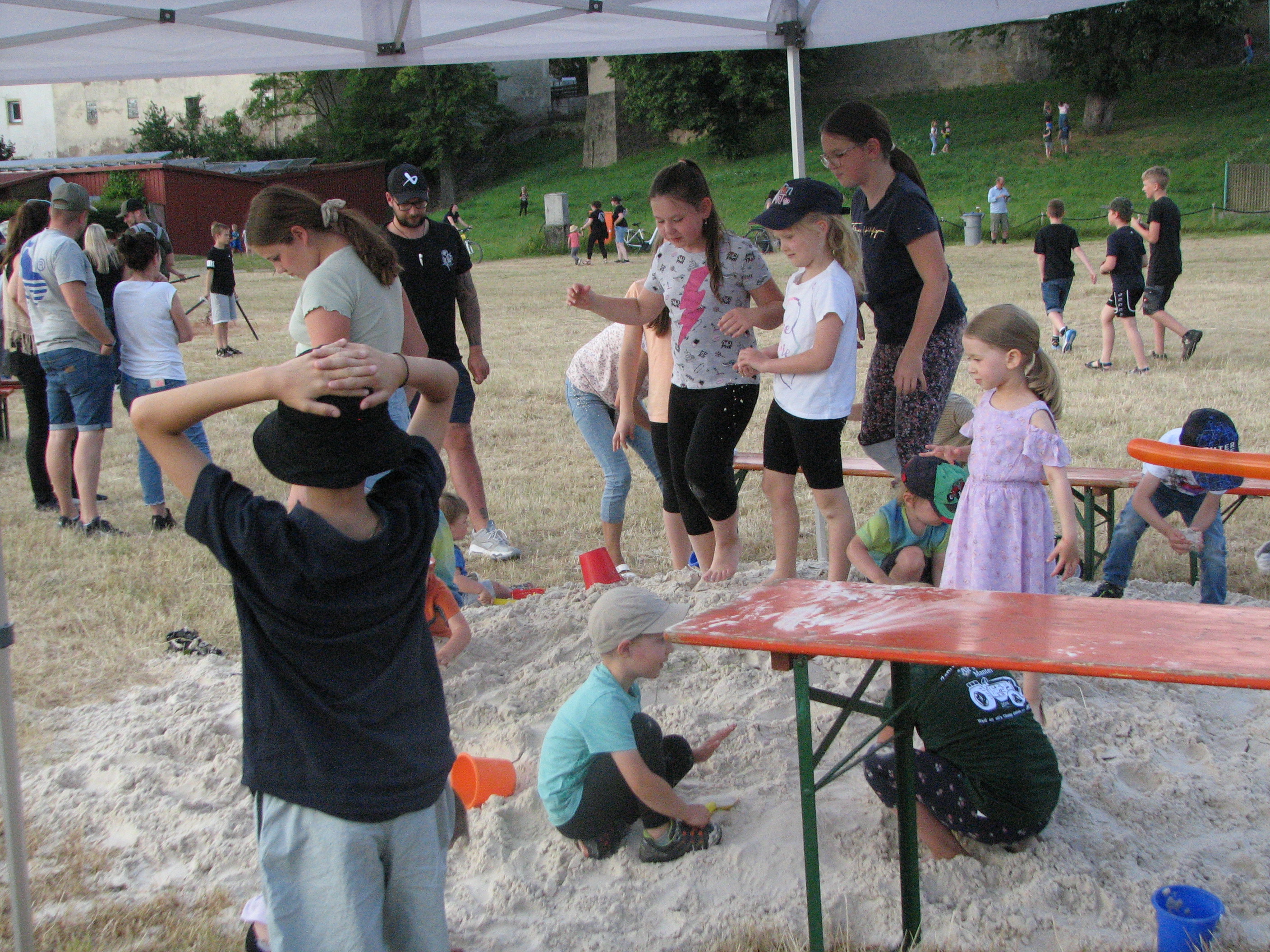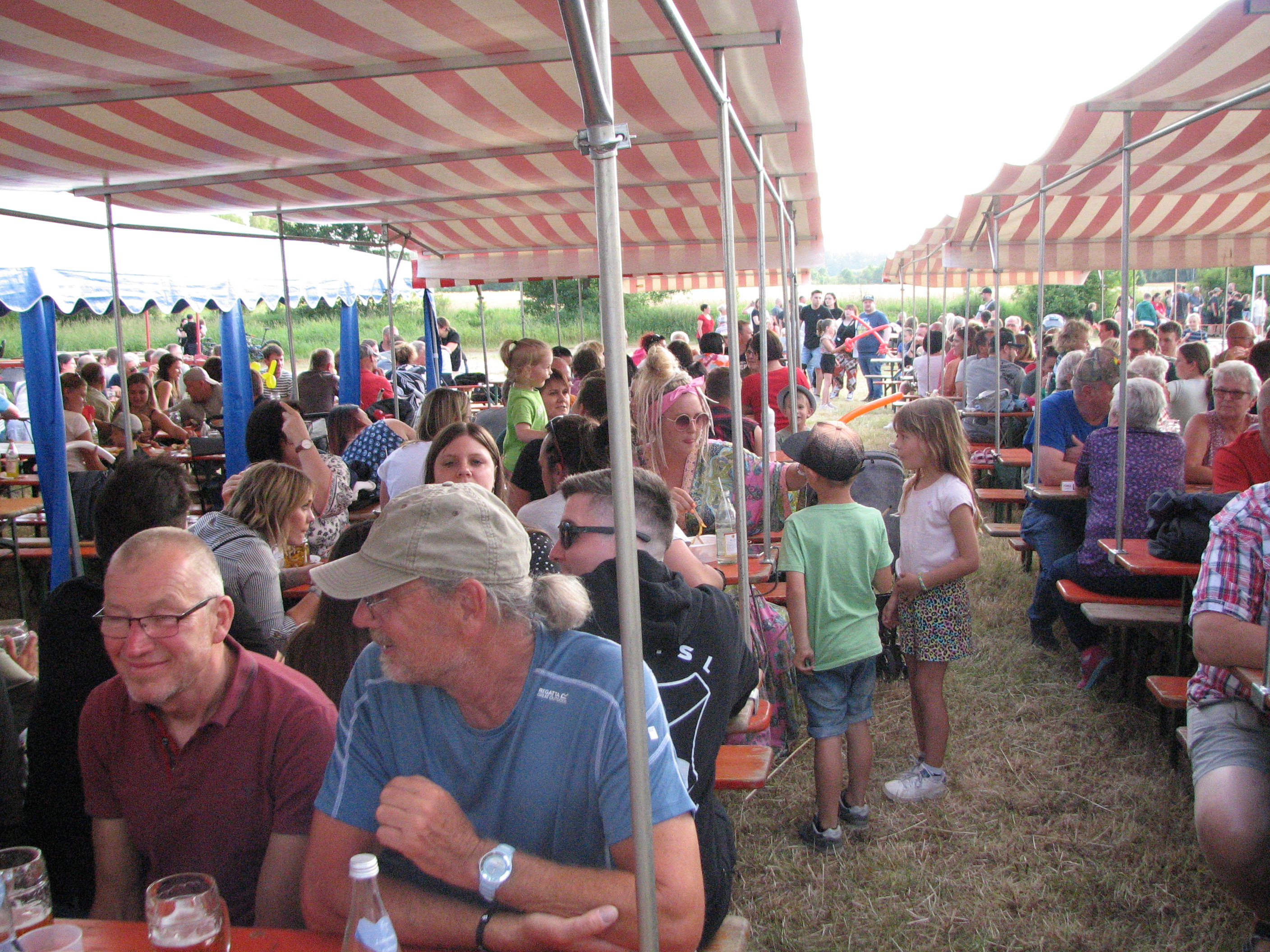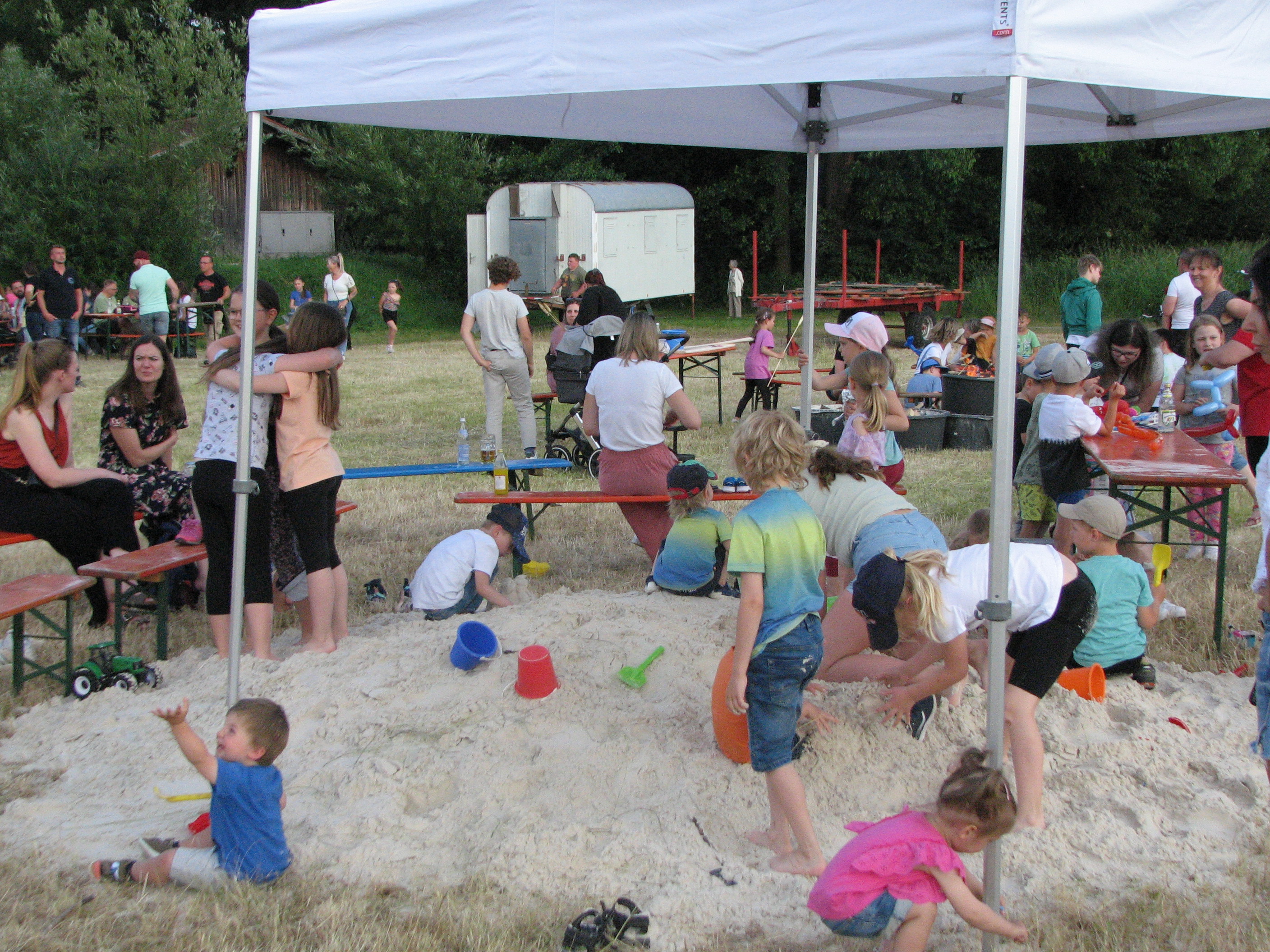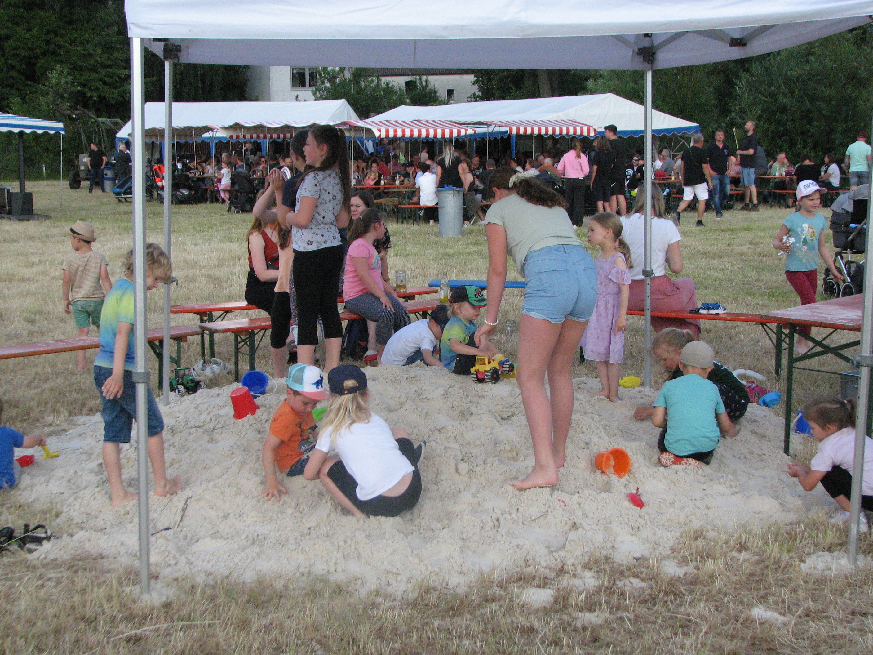 Für die Kinder wurde eigens ein Sandplatz aufgeschüttet und mit einem Sonnendach beschattet. Dort waren die Kleinen mit vollem Einsatz beschäftigt. Andere grillten sich ein Stockbrot, genossen ein Eis oder ließen sich von einem Künstler Luftballonfiguren zurechtbiegen. Dazu gab es von Anfang an stimmungsvolle Akkordeonmusik.