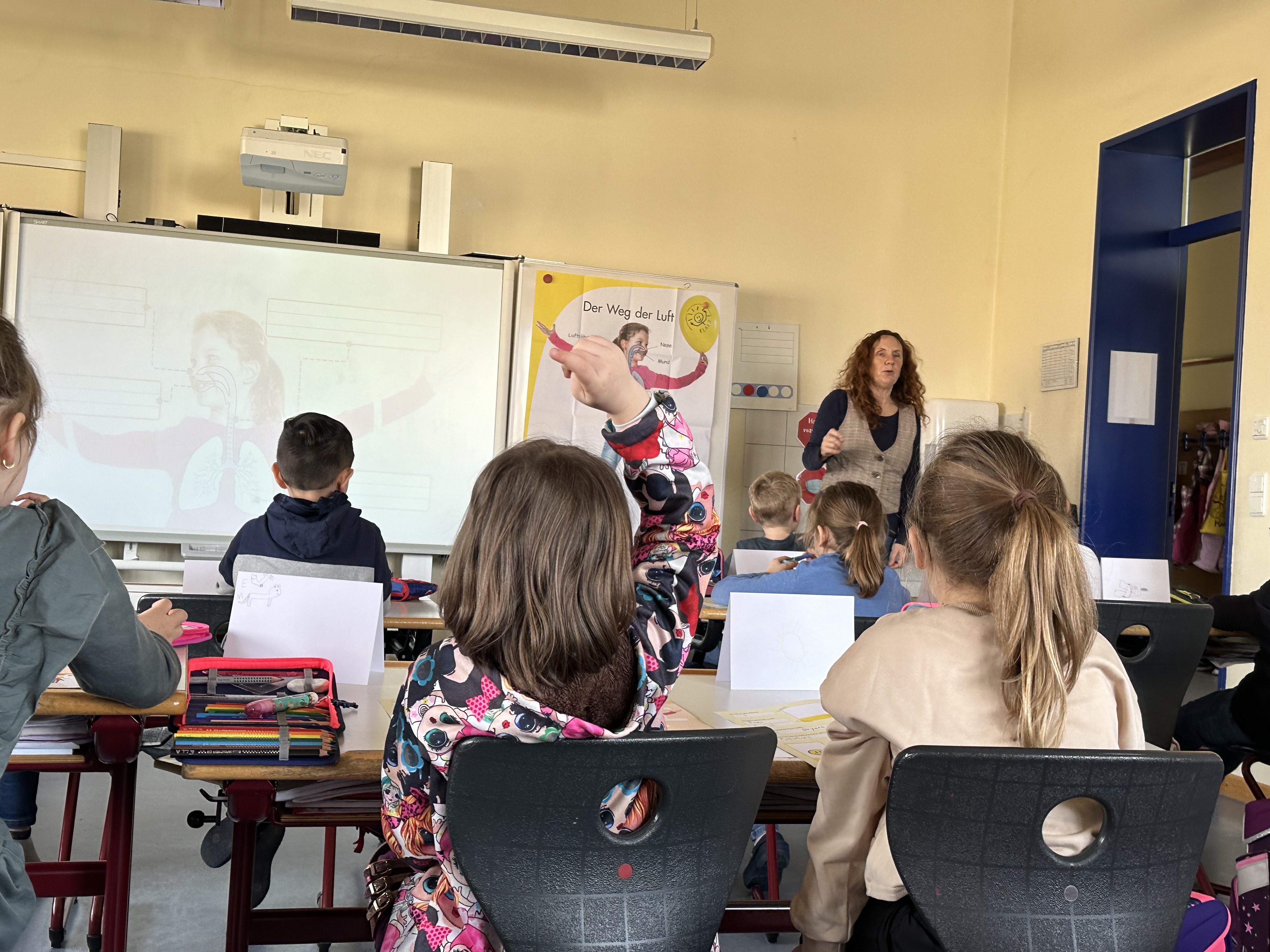 Frau Lutz, die Gesundheitsförderin, sprach mit den Kindern über die Arbeit von Forschern