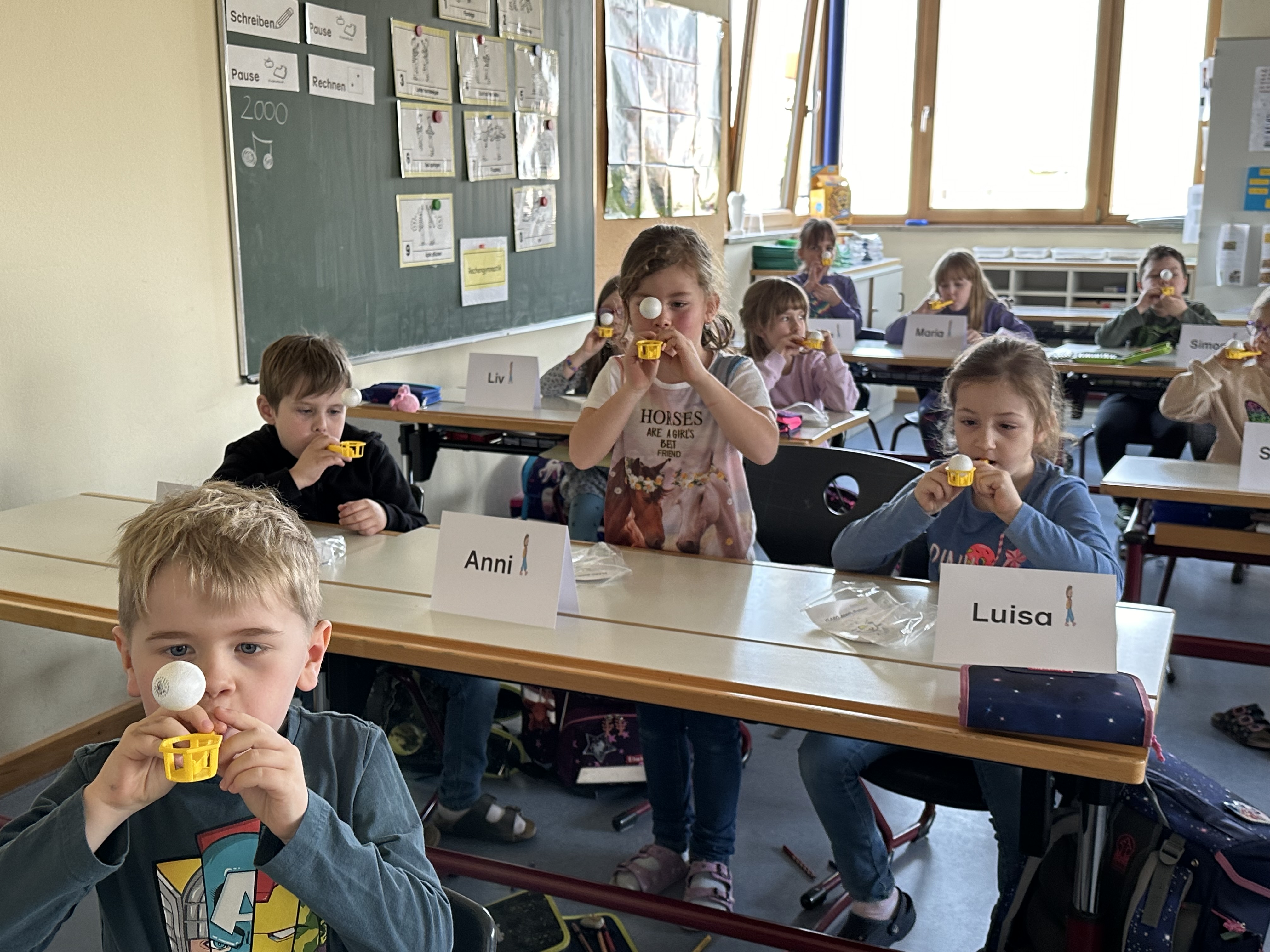 Frau Lutz hatte einen Atemtrainer dabei. Durch das Hineinblasen der Luft, konnte ein Ball