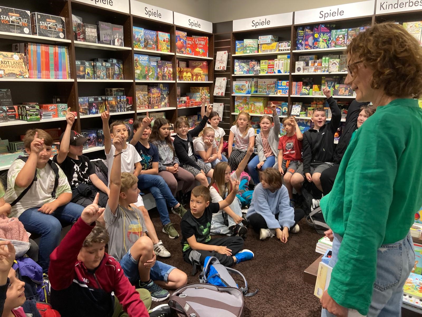 Voller Vorfreude sind die Kinder der 4. Klasse der Grundschule Mantel am Freitag, den 5. Juli, zur Schule gekommen, denn heute durften sie zusammen mit ihrer Klassenleitung Daniela Kreuzer und Constanze Hartwig, Unterstützung aus dem Lehrerkollegium, einen Ausflug in die Buchhandlung Rupprecht nach Weiden machen. Dort angekommen wurde die Klasse sehr herzlich von Frau Rupprecht empfangen, bevor diese eine kleine Einführung in die Welt der Bücher gab. Bei der Frage, wer denn gerne liest, gingen sofort die meisten Finger nach oben. Trotzdem waren ein paar Kinder noch etwas zögerlich, was laut Frau Rupprecht daran liegt, dass sie noch nicht das richtige Buch in die Finger bekommen haben. Diese Mission möchte sie aber zusammen mit der Klasse heute in Anspruch nehmen. In ihrer Einführung stellte die Inhaberin der Buchhandlung dann viele neue Kinderbücher von bekannten Autoren vor, wie z.B. Paul Maars „Die Tochter der Zauberin“ oder Marie Hüttners „Ist Oma noch zu retten?“. Gespannt lauschten die Kinder danach, als Frau Rupprecht ein paar Auszüge aus Sabine Bohlmanns „Willkommen bei den Grauses“ vorliest, bei der eine seltsame Familie in Ottilies Nachbarschaft zieht und das Mädchen all ihren Mut zusammennimmt, um Kontakt mit ihnen aufzunehmen. Nach der kurzen Einführung wurden die Viertklässler dann von Frau Graßler, Leiterin der Marktbibliothek Mantel, aufgefordert, sich neue Kinderbücher für die Bücherei auszusuchen. Ziel der Aktion ist es, dass jedes Kind die Chance hat, selbst ein neues Buch auszusuchen und dieses dann als 1. auszuleihen, bevor es für alle anderen zur Verfügung gestellt wird. Voller Vorfreude erforschten die Mädchen und Jungen die Buchhandlung Rupprecht bis schließlich knapp 30 neue Bücher gefunden wurden, bei denen von Fußballbüchern über Christiano Ronaldo zu „Die 3 !!!“ bis hin zu Sachbüchern alles dabei war. Auch für Frau Rupprecht war die Mission erfüllt, denn obwohl nicht alle von Anfang an lesebegeistert waren, hat doch jeder der Kinder ein Buch gefunden, was sie am liebsten sofort gelesen hätten. Als Abschiedsgeschenk bekamen alle im Rahmen des Welttag des Buches das Kinderbuch „Mission Roboter. Ein spannender Fall für die Glücksagentur“, welches Frau Kreuzer zusammen mit ihrer Klasse lesen möchte. Danach machte sich die Klasse auf den Heimweg, wobei ein kurzer Stopp bei einer Eisdiele und einem Spielplatz eingelegt wurde, was für die Viertklässler der krönende Abschluss ihres Ausflugs war. Letztendlich lässt sich festhalten, dass dieser Ausflug, verbunden mit der Aktion von Frau Graßler, für alle mehr als gelungen war und die Welt der Bücher eventuell sogar ein paar neue Fans für sich gewonnen hat.