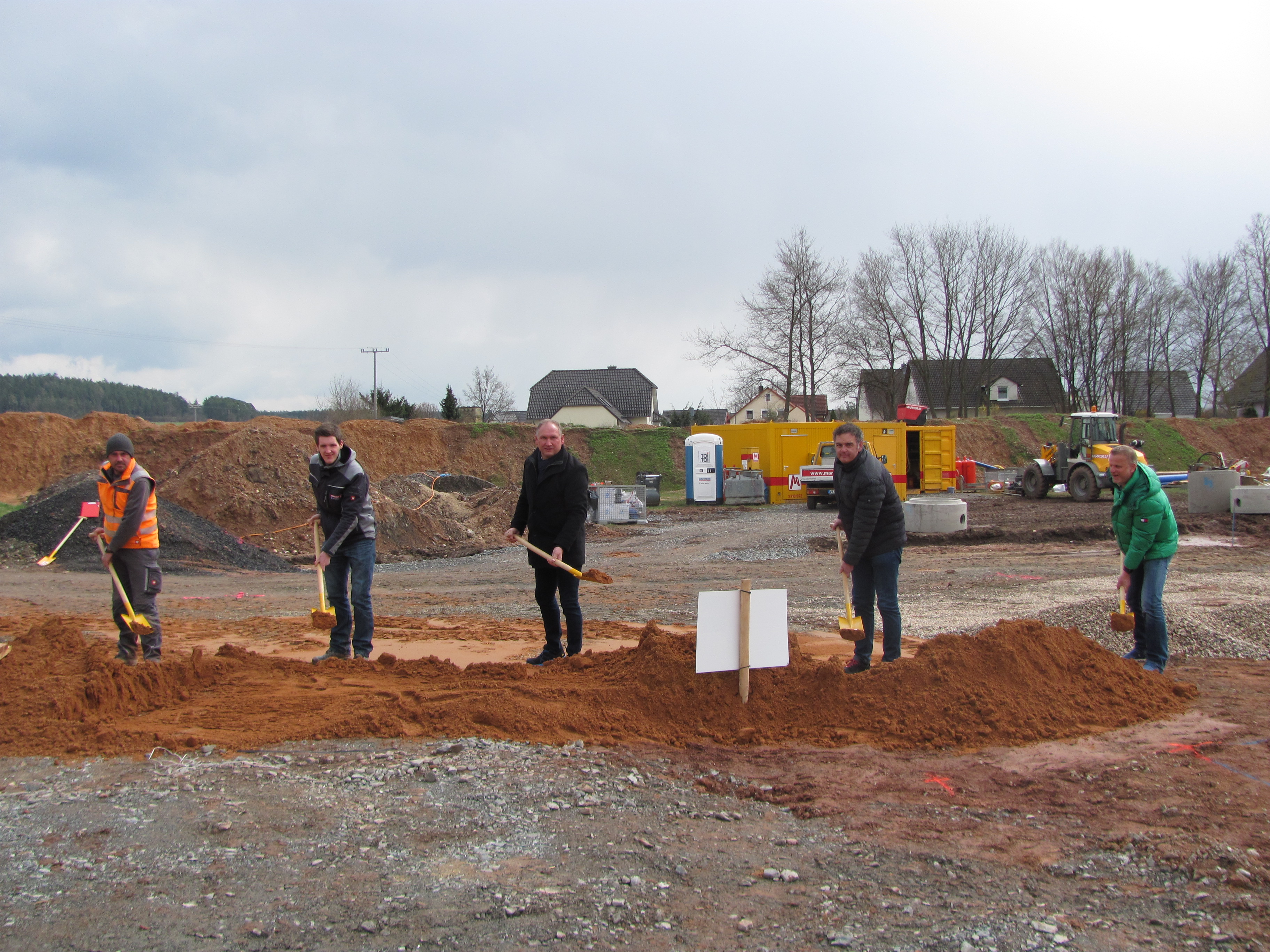 Auf dem Bild von links: Pascal Pöllath, Polier, Dominik Schultes, Bauleiter der Firma Markgraf, Bürgermeister Richard Kammerer, Stefan Hader, Geschäftsführer der Gruber-Bau und Michael Wagner, Bautechniker des Architekturbüros Wolfgang Schultes aus Grafenwöhr.
