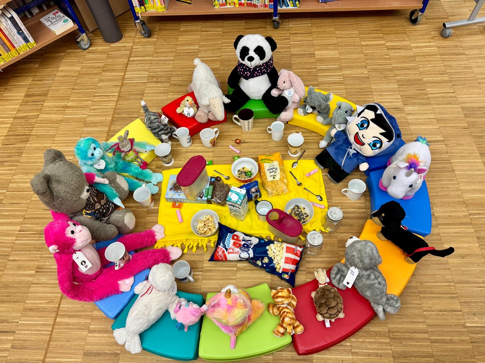 Zum Abschluss der Jubiläumswoche „25 Jahre Marktbibliothek“ gab es eine Aktion für die jüngsten Leserinnen und Leser der Bibliothek. Die Kinder durften zur Übernachtungsparty von Freitag auf Samstag ein Kuscheltier anmelden. Nach einer gemeinsamen Vorlesegeschichte verabschiedeten sich alle von ihrem Kuscheltier und ließen es in der Bibliothek zurück. Da gab es einige Überraschungen. Die Gruppe der Plüschtiere durfte sich alles genau anschauen, den Ausleihcomputer ausprobieren, Tonies hören, im Zirkuszelt spielen und sogar die große Geburtstagstorte plündern. Danach mussten sich alle natürlich die Zähne putzen. Es dauerte lange, bis alle Schäfchen, Bären, Katzen, Robben, Affen, Tiger und Einhörner endlich im Bett lagen. Das Bibliotheksteam passte gut auf die wilde Meute auf. Nach einer kurzen Nacht gab es Frühstück für alle. Endlich konnten die Kinder am nächsten Tag ihre kleinen Lieblinge wieder in die Arme schließen. Die Kuscheltiere hatten viel zu erzählen und zeigten stolz zahlreiche Fotos, welche die nächtlichen Aktivitäten dokumentierten. Ein großer Spaß für die Kuscheltiere, die Kinder und das Bibliotheksteam.