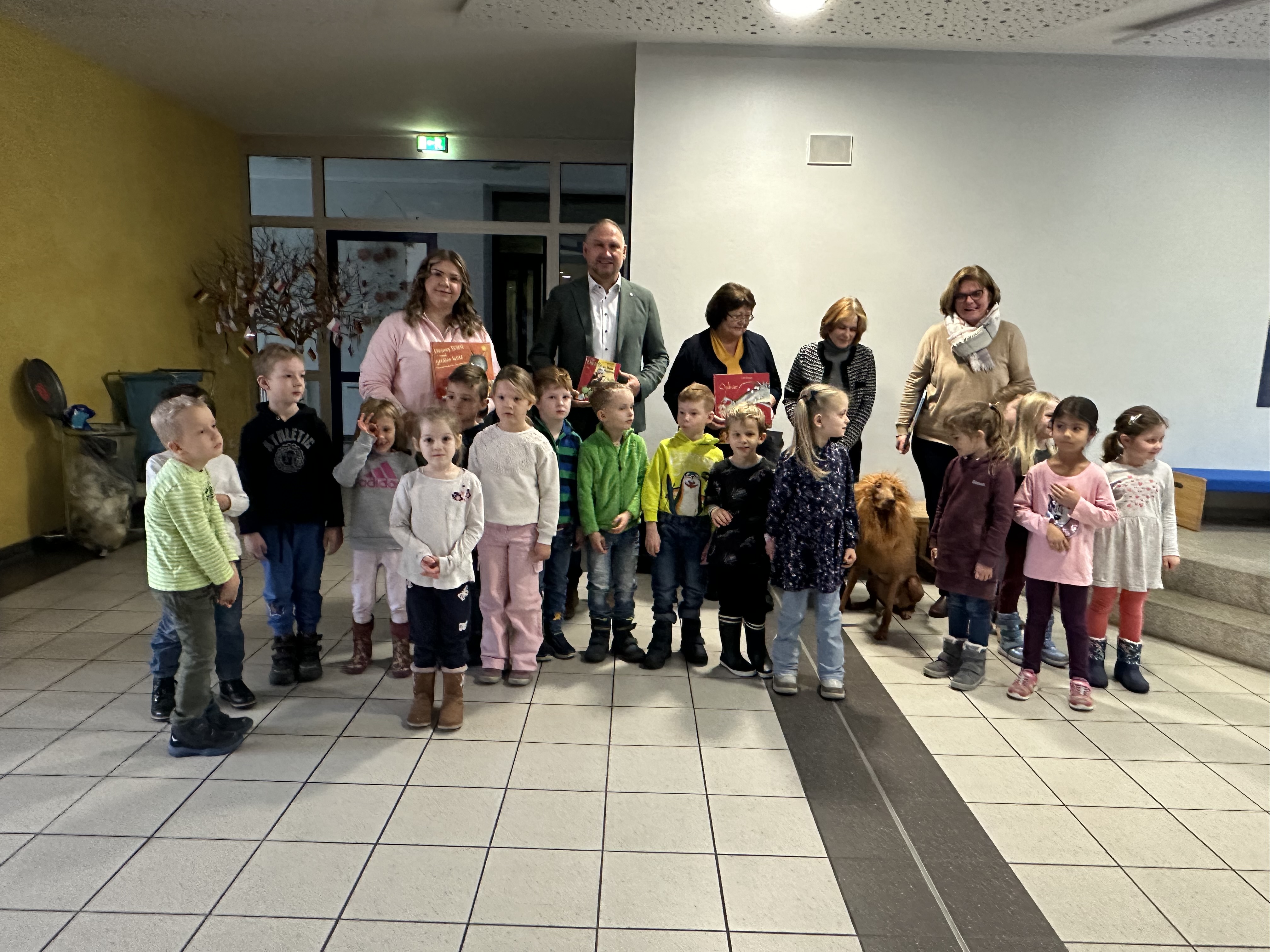 Zum bundesweiten Vorlesetag, der am Freitag, dem 15.11.2024 an vielen Schulen in Deutschland abgehalten wurde, lud Rektorin Anja Kraus einige „berühmte“ Vorleser in die Grundschule Mantel ein. Darunter waren zum Beispiel der Mantler Bürgermeister Richard Kammerer, aber auch die ehemalige Rektorin Elisabeth Graßler ließ es sich nicht nehmen, den Kindern etwas vorzulesen. Anja Kraus begrüßte die Schlaufüchse aus dem Kindergarten, die zusammen mit ihren Erziehern die Schule besuchten und las den zukünftigen Schulanfängern persönlich etwas vor. Eine Erzieherin übernahm dafür das Vorlesen in der ersten Klasse. Der absolute Hingucker war der Hund Finia von Vorleserin Liane Schmidt. Dieser hatte eine Löwenperücke auf und so mancher musste zwei Mal hinsehen, um sicher gehen zu können, dass es sich nicht um einen echten Löwen handelte. Mit dieser gelungenen Aktion konnte man sicherlich die Leselust der Kinder wecken und der eine oder andere Schüler wird sich in der Bücherei einmal das Buch ausleihen, das er oder sie am Vorlesetag kennenlernen durfte.