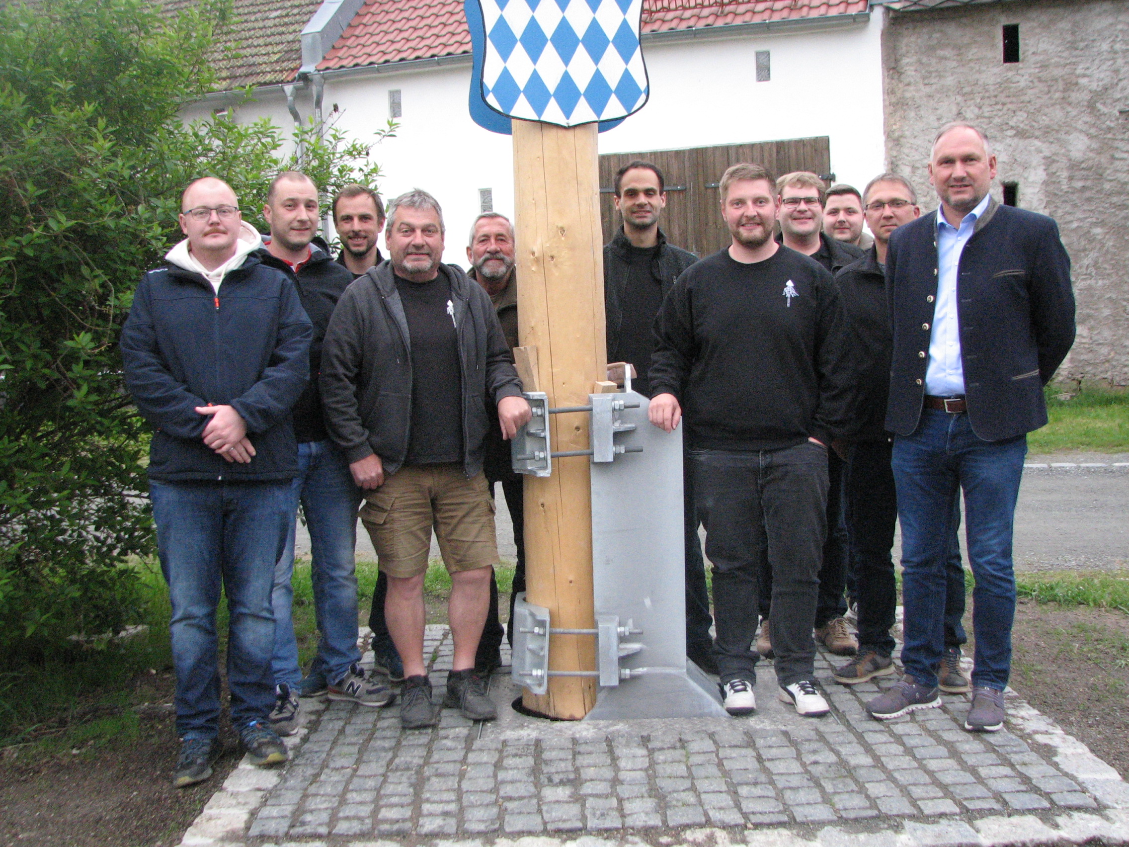 Der Maibaumhalter hat ein Eigengewicht von 16 Tonnen. Mehrere Firmen beteiligten sich an der Neuanschaffung. Die Firma Kraus machte die Erdarbeiten hinsichtlich Ausgrabung und Einschalung am vorgesehenen Standort. Die Firma Turban Betonbauteile lieferte den Beton für das feste Fundament. Die Firma Schieder kümmerte sich um die quadratförmige Einpflasterung, und die Firma Baier Kran hat das ganze Unternehmen bei den Hebearbeiten unterstützt und begleitet. Hinzu kommt ein anonymer Sponsor, der das Eisen für den Baumhalter spendiert hat.