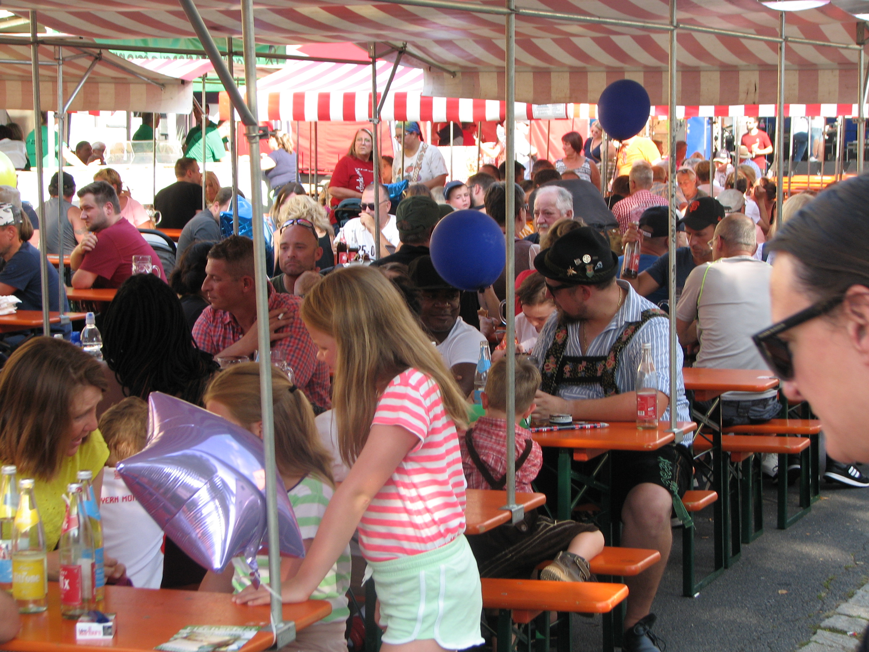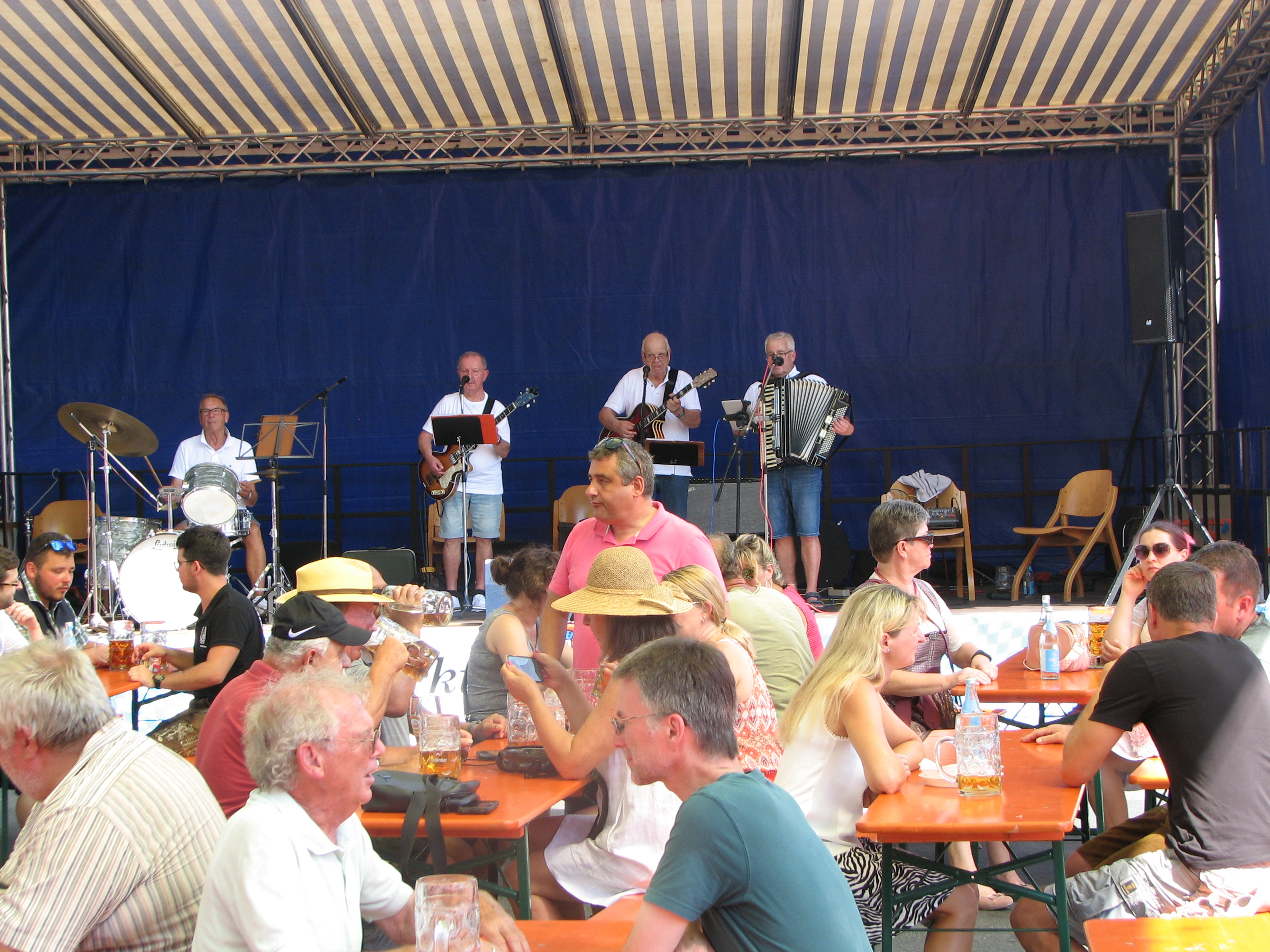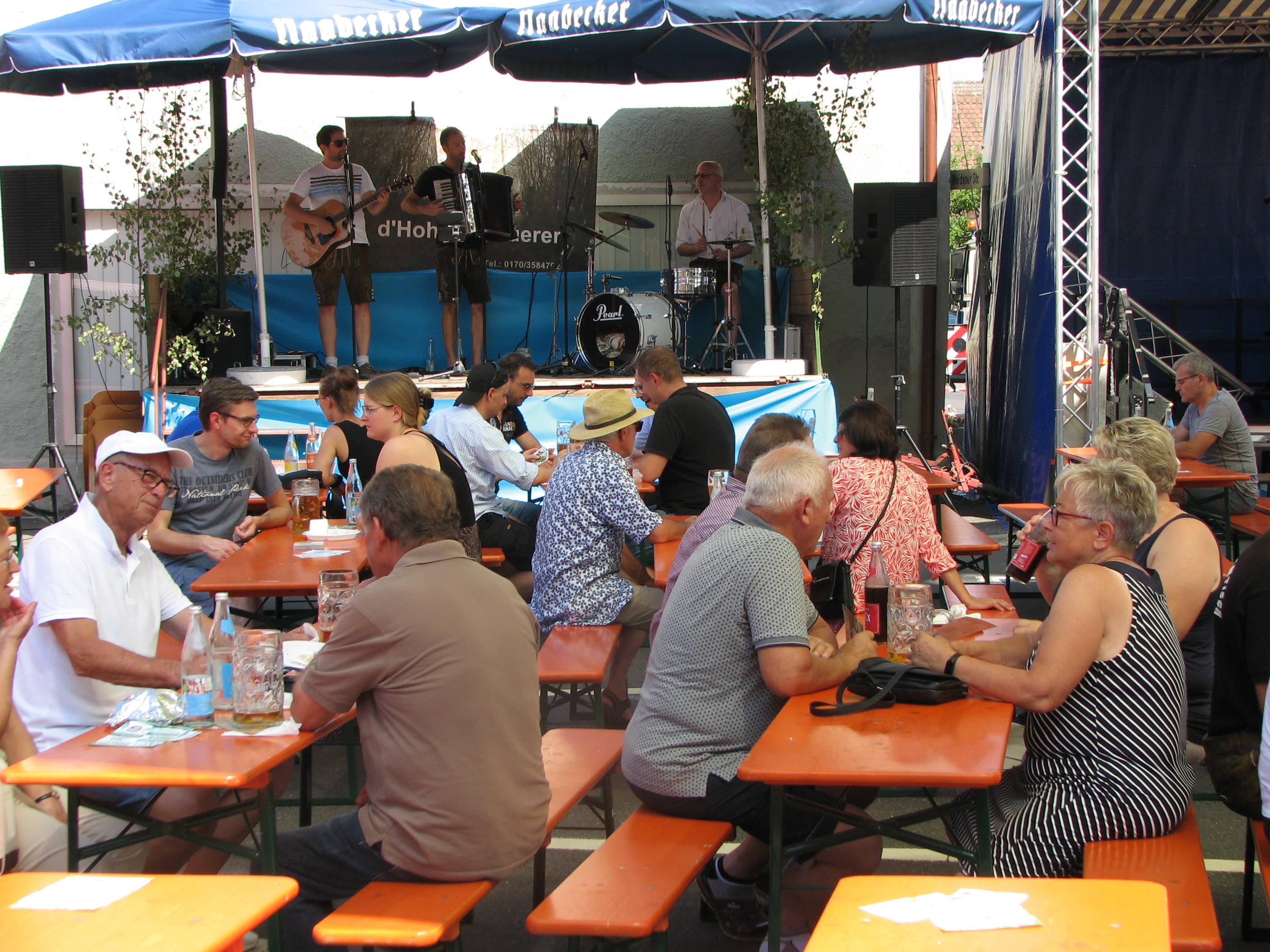 Zum Frühschoppen spielten die heimischen „Lustigen Buam“ mit Michael Bertelshofer, Lothar Kraus, Roman Karl und Reinhold Müller zu Schlagern, Evergreens und alpenländischer Volksmusik auf. Am frühen Nachmittag übernahmen „die Hohlweglauerer“ die musikalische Unterhaltung. Heiß begehrt waren die Plätze im Schatten unter den Sonnendächern. Zusätzlich spendete der große Fallschirm, gestützt vom „Baier-Kran“, Schatten auf dem Marktplatz. In der Mittagshitze war der Hunger der Gäste noch nicht sehr groß. Doch nach und nach fanden Spezialitäten wie Bratwürste, Pommes, Gyros, Fisch- und Lachssemmeln, Käse und Brezen sowie Makrelen bis hin zu „Xantlburgern“ vom Holzkohlengrill und Pulled Pork rege Nachfrage. Da jeder Verein zwei Torten oder Kuchen gespendet hatte, stand am Stand beim VfB eine große Auswahl an Leckereien zum Kaffee zur Verfügung. Am Ende war von de n Kuchen und Torten nichts übriggeblieben. Die Dotschbäckerei lag in den Händen des katholischen Pfarrgemeinderats. Für Leckermäuler bot die „Rote Legion“ Crêpes an.