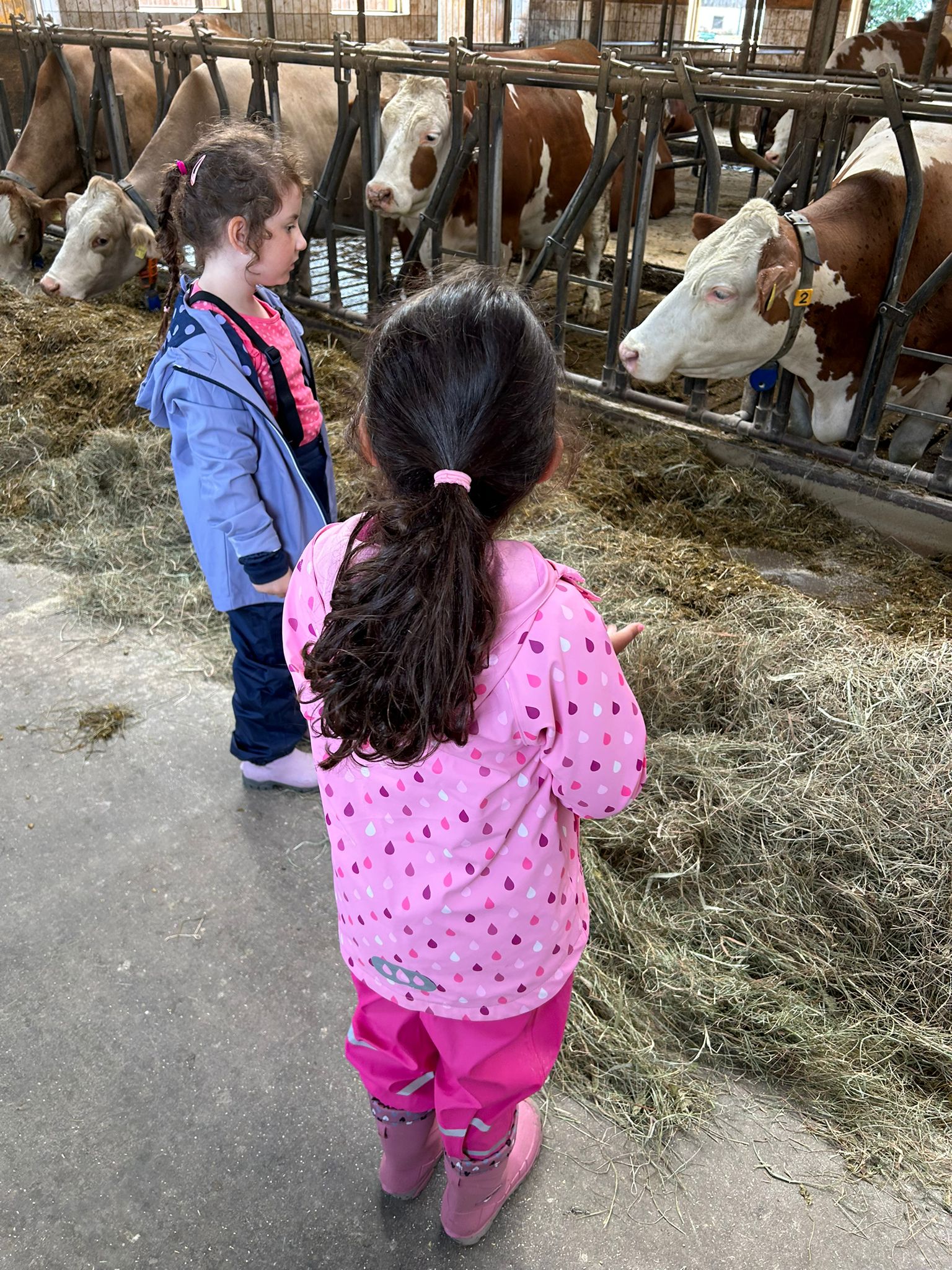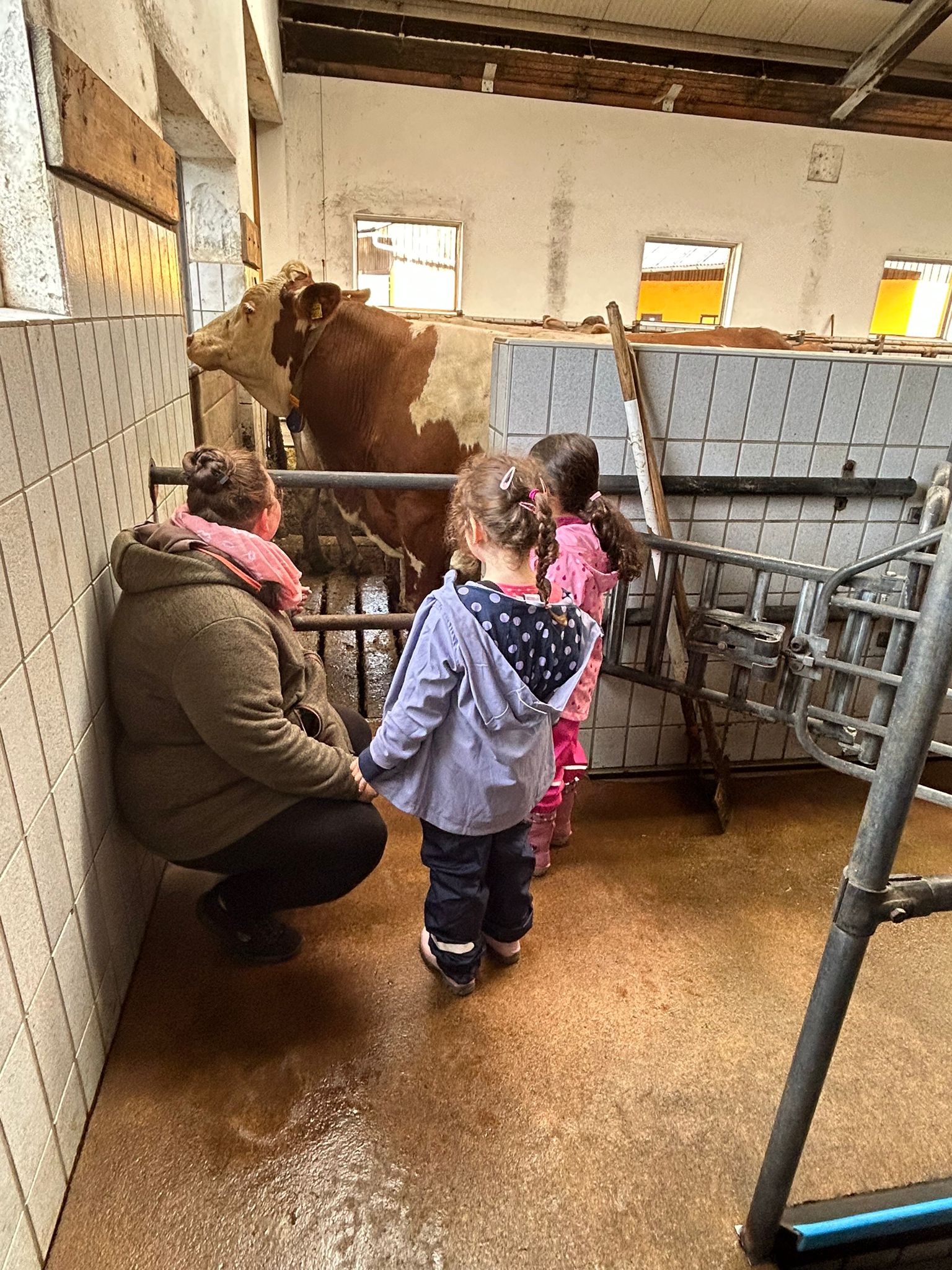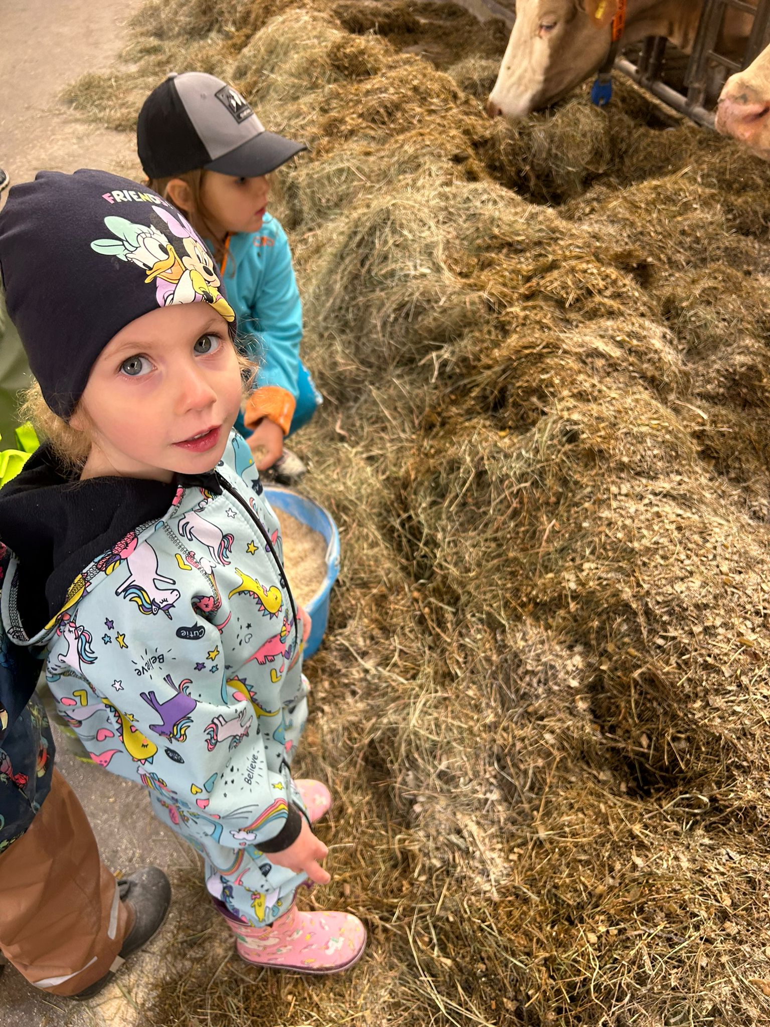 Am 5.10.2023 erkundeten die Mantler Schlaufüchse den Bauernhof Ziegler in Rupprechtsreuth. Um 8 Uhr machten sich die Kinder mit Ihren Erziehern zu Fuß auf den Weg nach Rupprechtsreuth wo sie schon von Kathi Ziegler und Petra Hager (SVLFG) erwartet wurden. Als Erstes gab es ein ausgiebiges Frühstück rund um das Thema „Milch“ mit leckeren Naturjoghurt, geschnittenen Früchten, frischen Brot und Butter und vieles vieles mehr. Danach ging es als Erstes zum Helm Test unter der Leitung von Petra Hager, die den Kindern anschaulich mit einem Testgerät zeigte, wie wichtig es ist, einen Helm zu tragen. Auch erklärte sie Ihnen alles zum Thema Sicherheit am Bauernhof. Danach wurden die Kinder in zwei Gruppen geteilt. Die eine Gruppe bedruckte in dieser Zeit ihr Mäppchen für die Schlaufuchsstunden und die anderen gingen mit Kathi Ziegler in den Stall zu den Kälbern, die gestreichelt oder gebürstet werden konnten. Auch wurde den Kindern die Melkanlage erklärt, wie diese den funktioniert und wie den eine Kuh gemolken wird. So konnten die Kinder an den Melkzeugen ihre Hände hinhalten und konnten so das entstandene Vakuum fühlen. Natürlich fehlte bei dem ganzen auch Kater „Fauchi“ nicht der dem ganzen gefolgt ist und sich so ganz viele Streicheleinheiten erhaschen konnte. Zum Schluss ging es noch auf den Futtertisch. Hier konnten die Kinder mit Schaufeln und Eimern die Kühe füttern und konnten so noch vieles Wissenswertes über die Kuh erfahren. Danach wurden die Gruppen getauscht und die einen bedruckten und die anderen durften in den Stall. Um kurz vor halb zwölf machten sich die Kinder wieder auf den Weg nach Mantel in den Kindergarten.