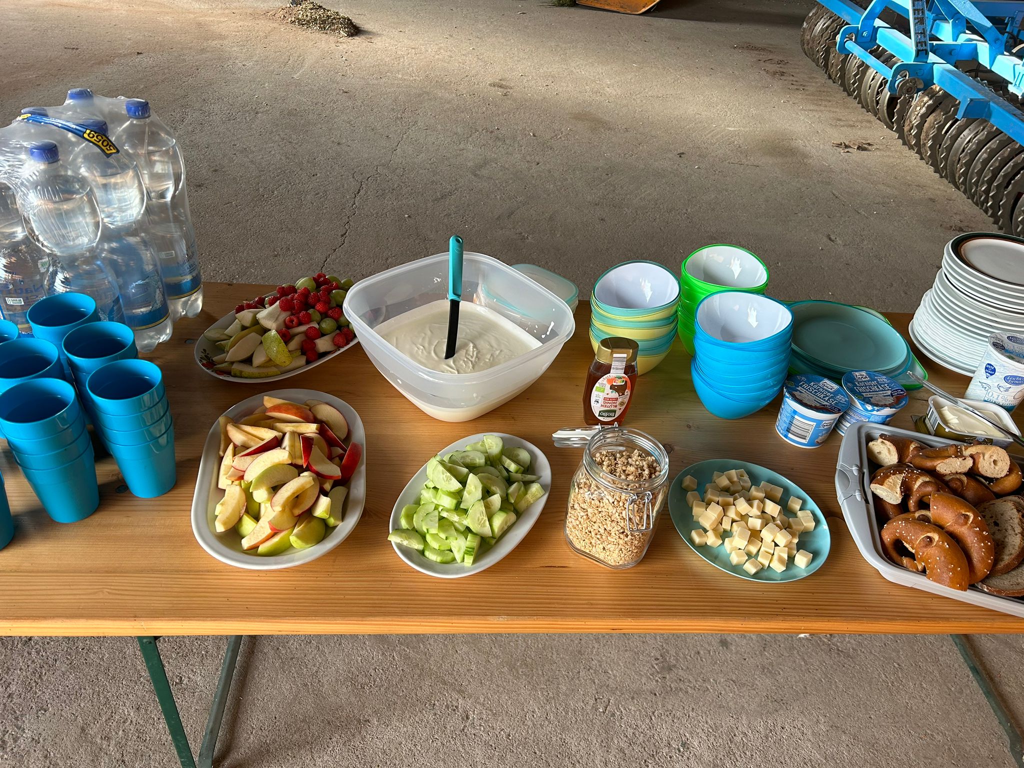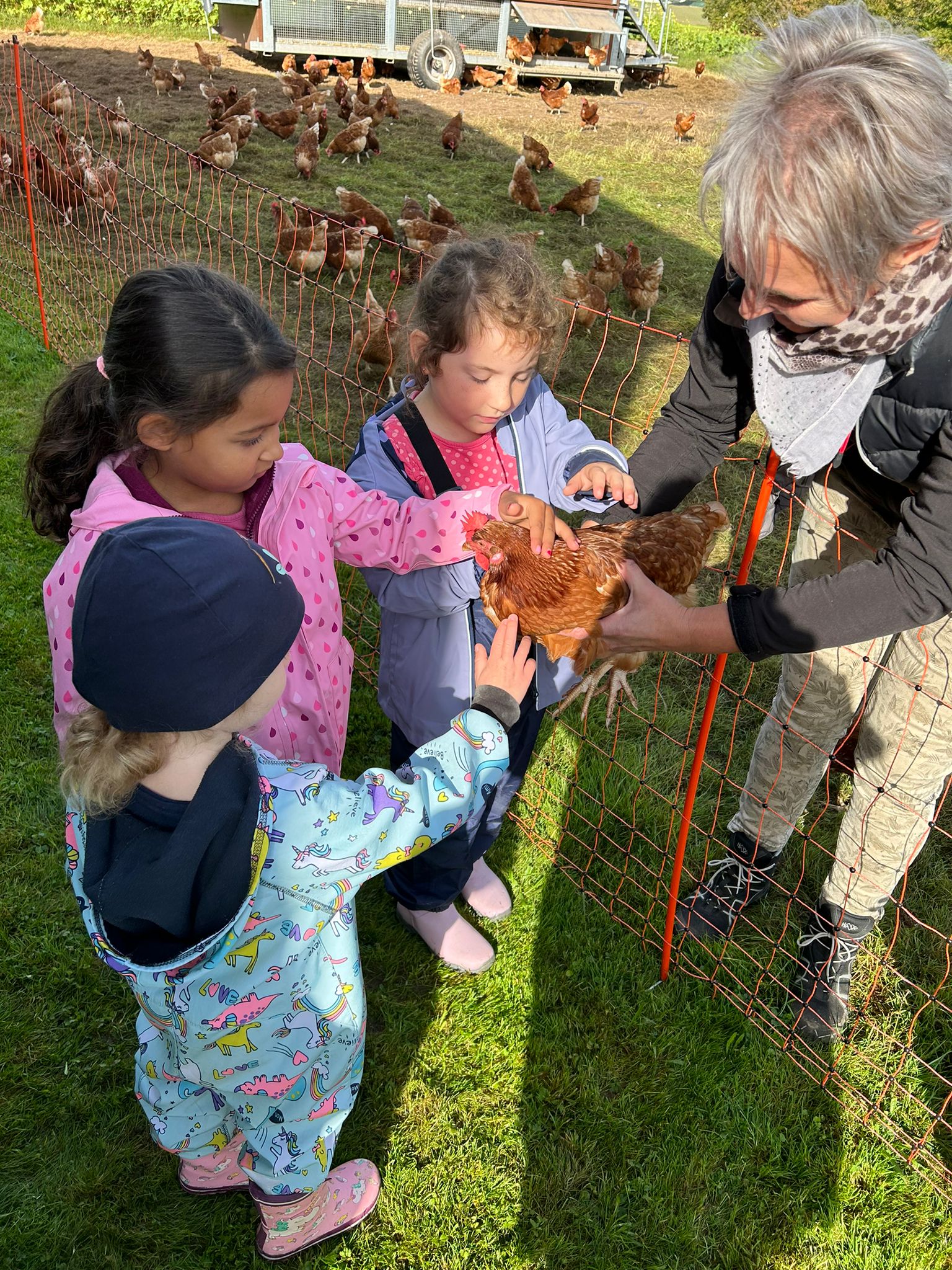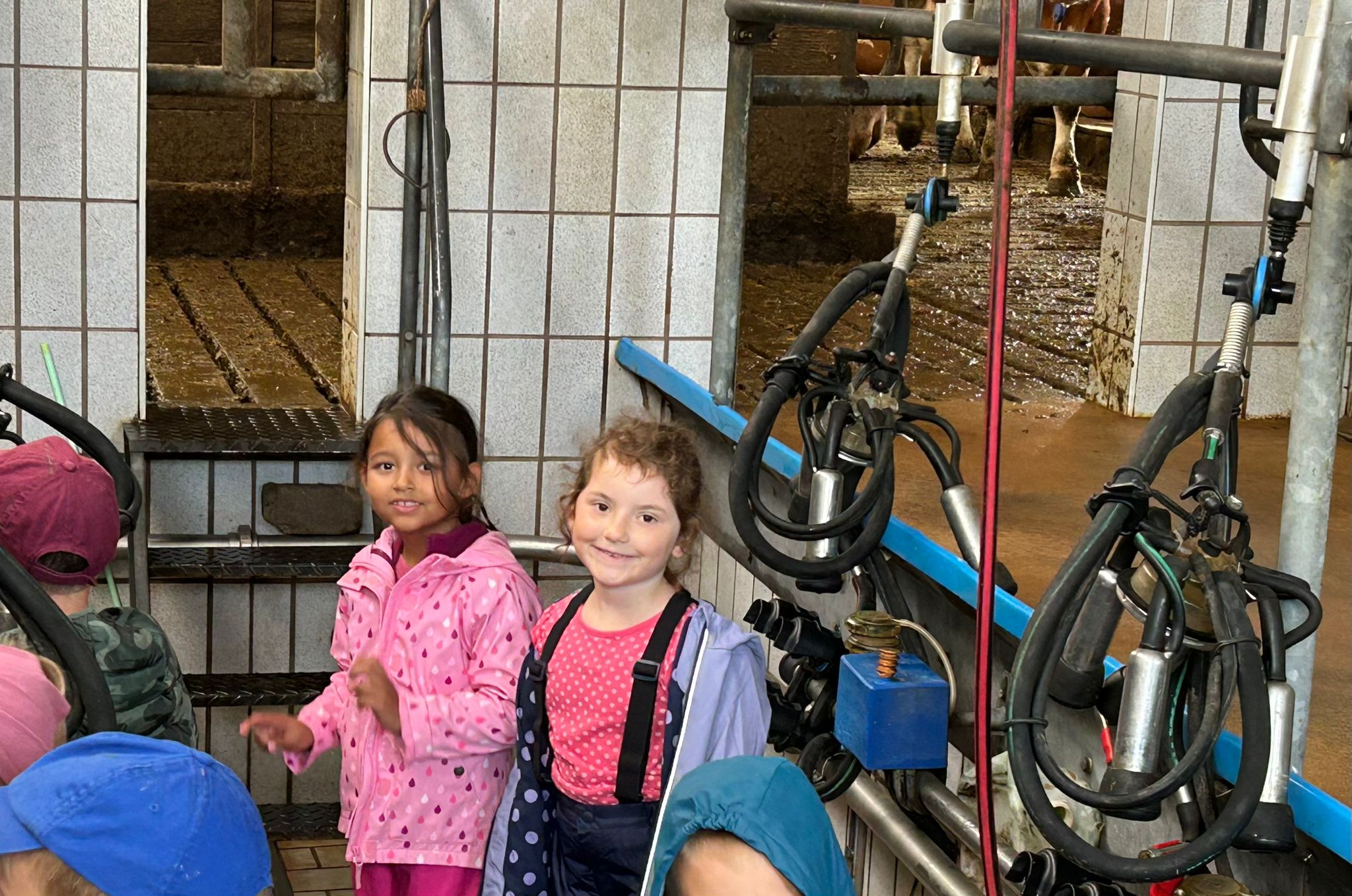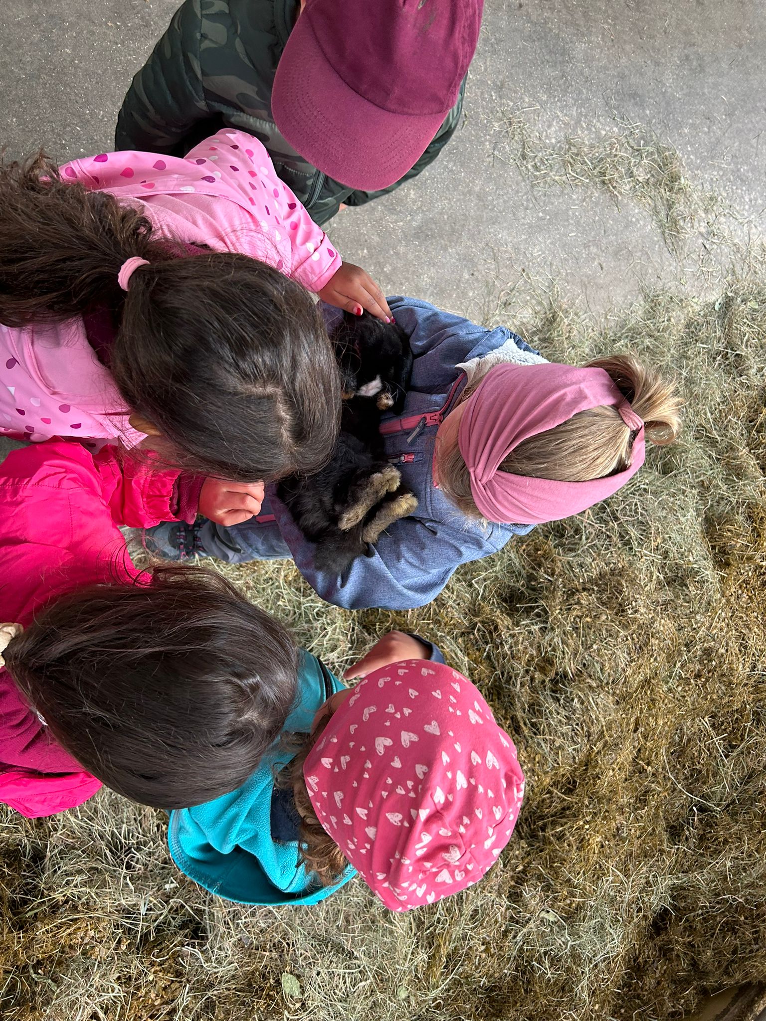 Am 5.10.2023 erkundeten die Mantler Schlaufüchse den Bauernhof Ziegler in Rupprechtsreuth. Um 8 Uhr machten sich die Kinder mit Ihren Erziehern zu Fuß auf den Weg nach Rupprechtsreuth wo sie schon von Kathi Ziegler und Petra Hager (SVLFG) erwartet wurden. Als Erstes gab es ein ausgiebiges Frühstück rund um das Thema „Milch“ mit leckeren Naturjoghurt, geschnittenen Früchten, frischen Brot und Butter und vieles vieles mehr. Danach ging es als Erstes zum Helm Test unter der Leitung von Petra Hager, die den Kindern anschaulich mit einem Testgerät zeigte, wie wichtig es ist, einen Helm zu tragen. Auch erklärte sie Ihnen alles zum Thema Sicherheit am Bauernhof. Danach wurden die Kinder in zwei Gruppen geteilt. Die eine Gruppe bedruckte in dieser Zeit ihr Mäppchen für die Schlaufuchsstunden und die anderen gingen mit Kathi Ziegler in den Stall zu den Kälbern, die gestreichelt oder gebürstet werden konnten. Auch wurde den Kindern die Melkanlage erklärt, wie diese den funktioniert und wie den eine Kuh gemolken wird. So konnten die Kinder an den Melkzeugen ihre Hände hinhalten und konnten so das entstandene Vakuum fühlen. Natürlich fehlte bei dem ganzen auch Kater „Fauchi“ nicht der dem ganzen gefolgt ist und sich so ganz viele Streicheleinheiten erhaschen konnte. Zum Schluss ging es noch auf den Futtertisch. Hier konnten die Kinder mit Schaufeln und Eimern die Kühe füttern und konnten so noch vieles Wissenswertes über die Kuh erfahren. Danach wurden die Gruppen getauscht und die einen bedruckten und die anderen durften in den Stall. Um kurz vor halb zwölf machten sich die Kinder wieder auf den Weg nach Mantel in den Kindergarten.