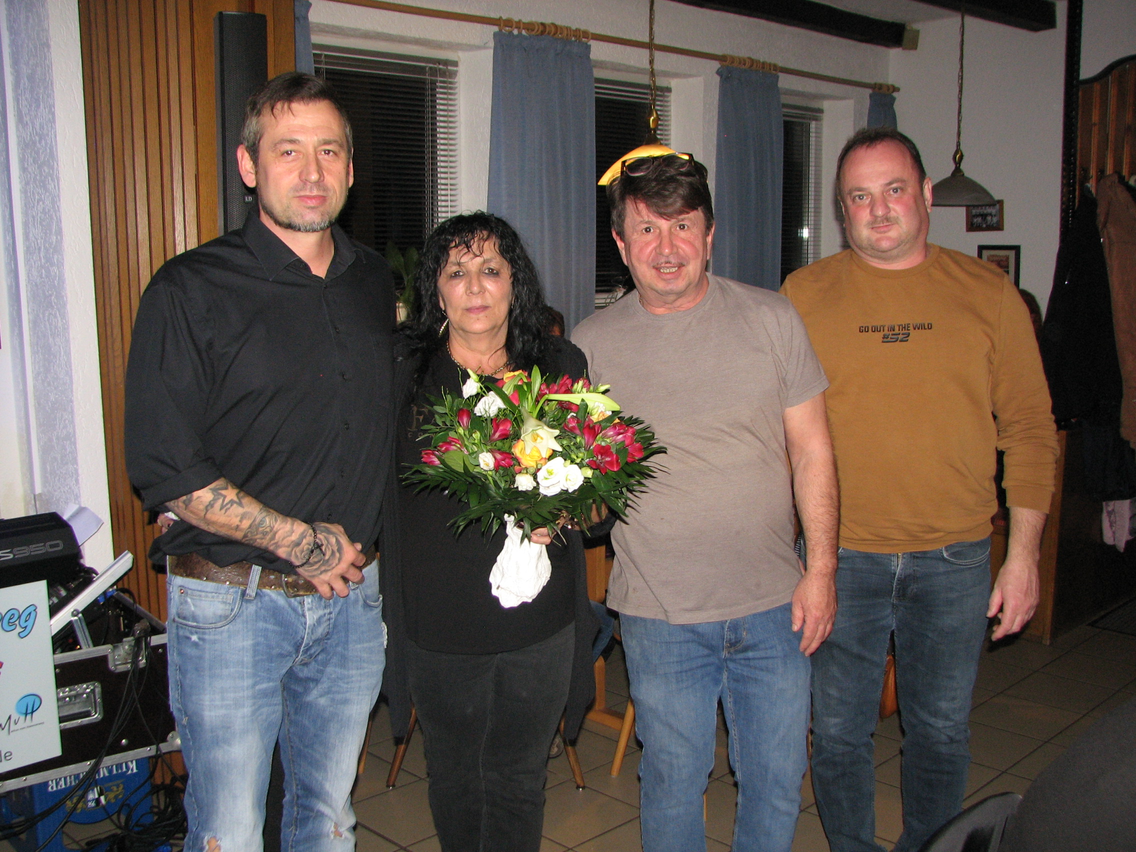 Bild 1: Holger Meyer (links) und Thomas Bertelshofer (rechts) überreichten als Willkommensgruß einen Blumenstrauß und wünschten den neuen Wirtsleuten Mimmi (2. v. l.) und Thomas Ehring (3. v. l.) viel Freude bei ihrer Arbeit im Manteler Sportheim.
