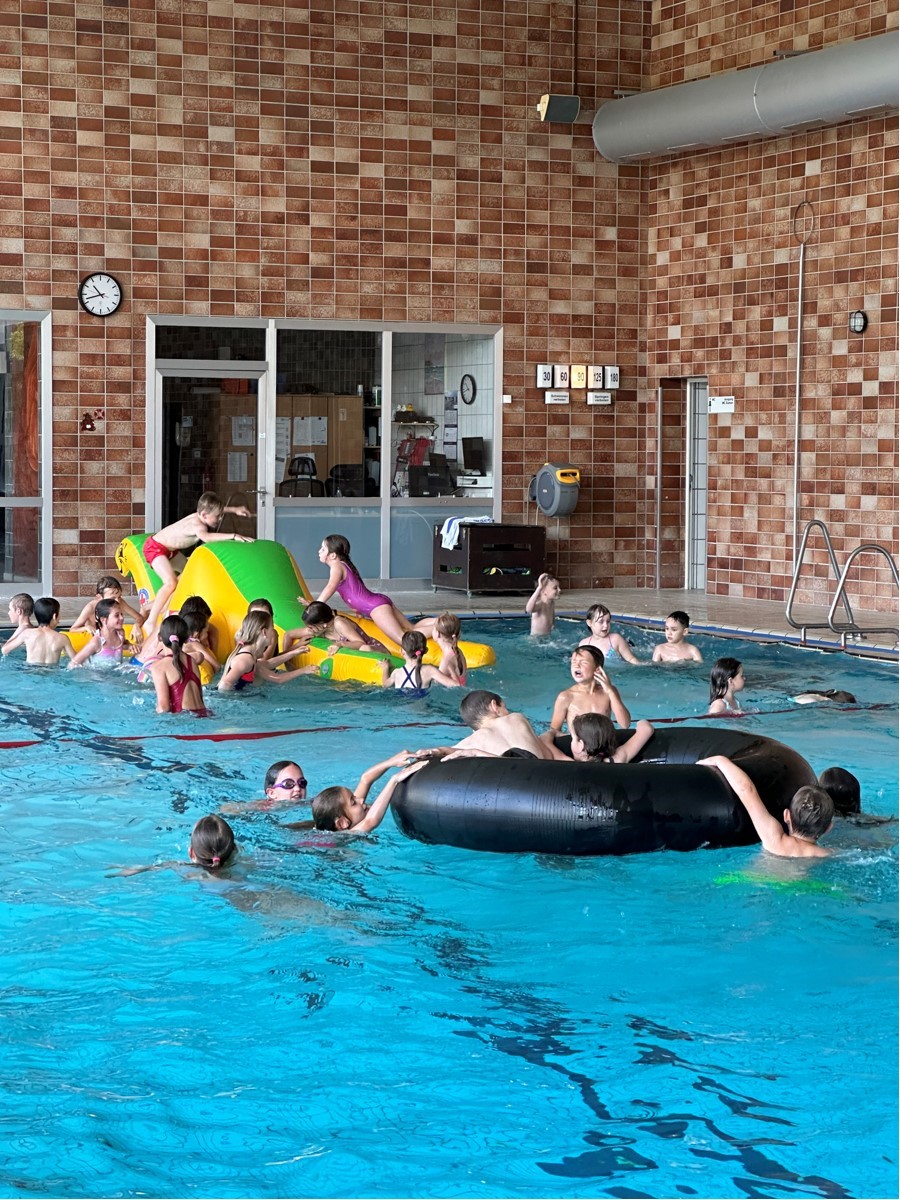 Zum Abschluss des Schwimmblocks fuhren die vier Klassen der Grundschule Mantel zum Schwimmfest in das Hallenbad nach Weiherhammer. Die Kinder machten Schwimmspiele mit Korken und Ringen, sprangen vom Einmeterbrett und auch vom Dreier und vergnügten sich mit einem Riesendino und zwei großen Reifen im Wasser. Rektorin Anja Krauß war mit ihrem gesamten Team und vielen Helfern im Einsatz. Michaela Faltenbacher von Wasserwacht Weiherhammer hatte sich im Vorfeld viele Gedanken gemacht und trug maßgeblich zum Gelingen des Schwimmfestes bei.