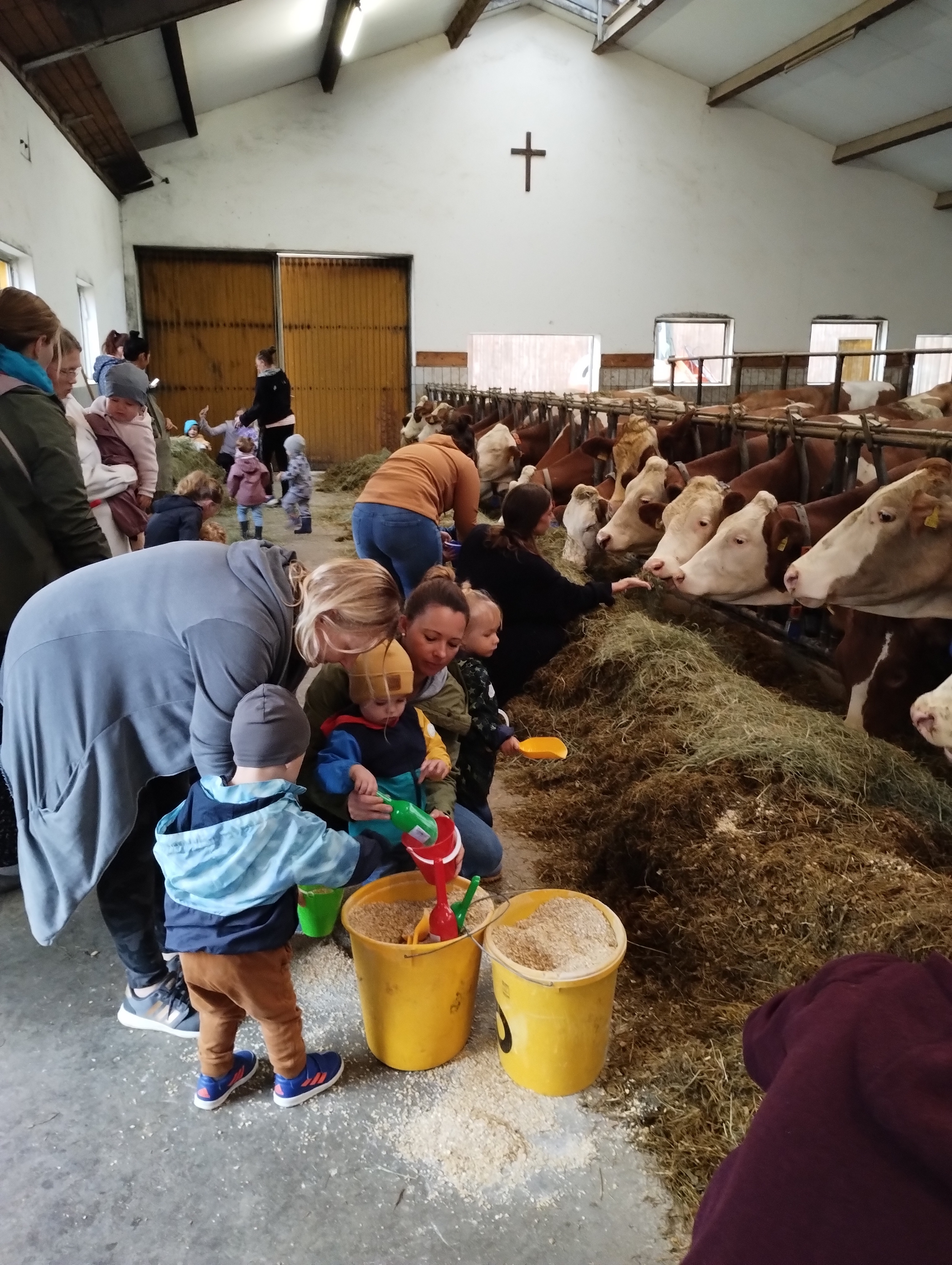 Neugierig und angstfrei beteiligen sich die Kleinen bei der Fütterung der Kühe.