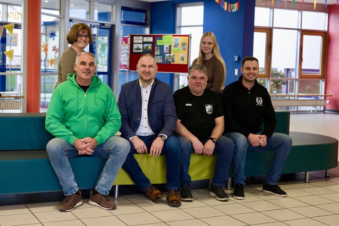 Von rechts: Manuel Pröls (Vorsitzender Mantler Stammtisch), Constanze Hartwig (Vorsitzende JU-Mantel), Stefan Neumann (Vorsitzender VfB Mantel), Bürgermeister Richard Kammerer, Bernd Bösl (Spielleiter Mantler Noofrösch) und Anja Kraus (Rektorin).