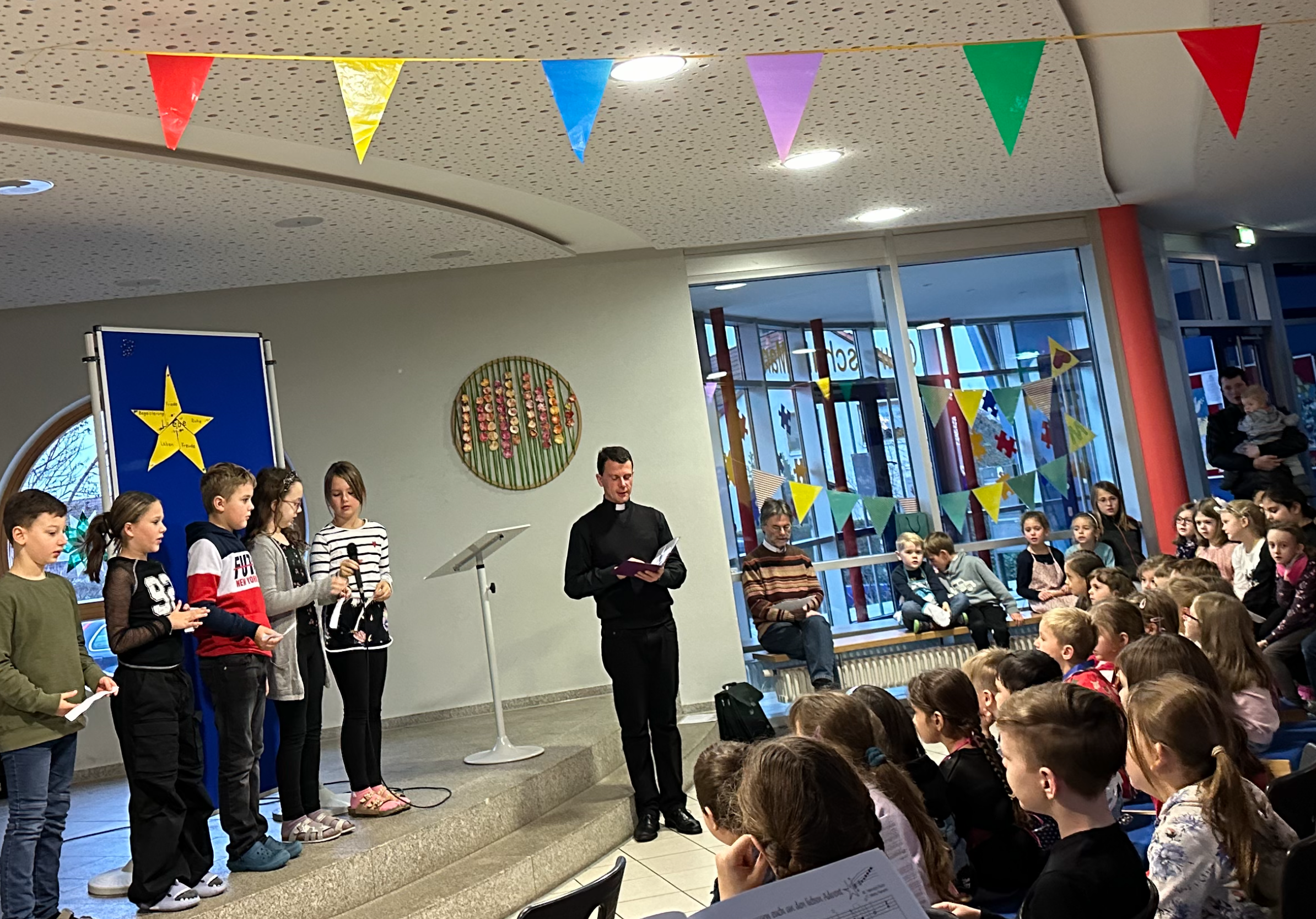 Am Tag vor den Weihnachtsferien trafen sich Schulkinder und Eltern aller Konfessionen in der Schulaula zu einer weihnachtlichen Adventsfeier. Pfarrer Thomas Kohlhepp und Pfarrer Andreas Ruhs führten durch die Andacht. Einige Schulkinder lasen Fürbitten und die Lesung vor. Drei Flötenkinder der vierten Klasse umrahmten den Gottesdienst musikalisch. In einer angenehmen, weihnachtlichen Atmosphäre bedankte sich Konrektorin Kerstin Liebl bei allen Anwesenden für die gelungene Andacht und wünschte Frohe Weihnachten und einen guten Rutsch ins neue Jahr. Nun folgte der für die Kinder aufregendste Teil, denn jede Klasse durfte jetzt ihr einstudiertes Lied, Schauspiel, ihren Tanz oder Gedicht vortragen. In der voll besetzten Aula begann die erste Klasse mit dem Lied „In der Weihnachtsbäckerei“. Danach folgte der Auftritt der beiden Kombiklassen. Diese gaben ein Lied und das Theaterstück vom Nikolaus und dem kleinen Klaus zum besten. Den Abschluss übernahm die vierte Klasse. Hierfür war ein Umzug in die Turnhalle nötig, da ein Wintertanz vorgeführt, ein Gedicht aufgesagt und einige Weihnachtslieder vorgespielt und gesungen wurden.