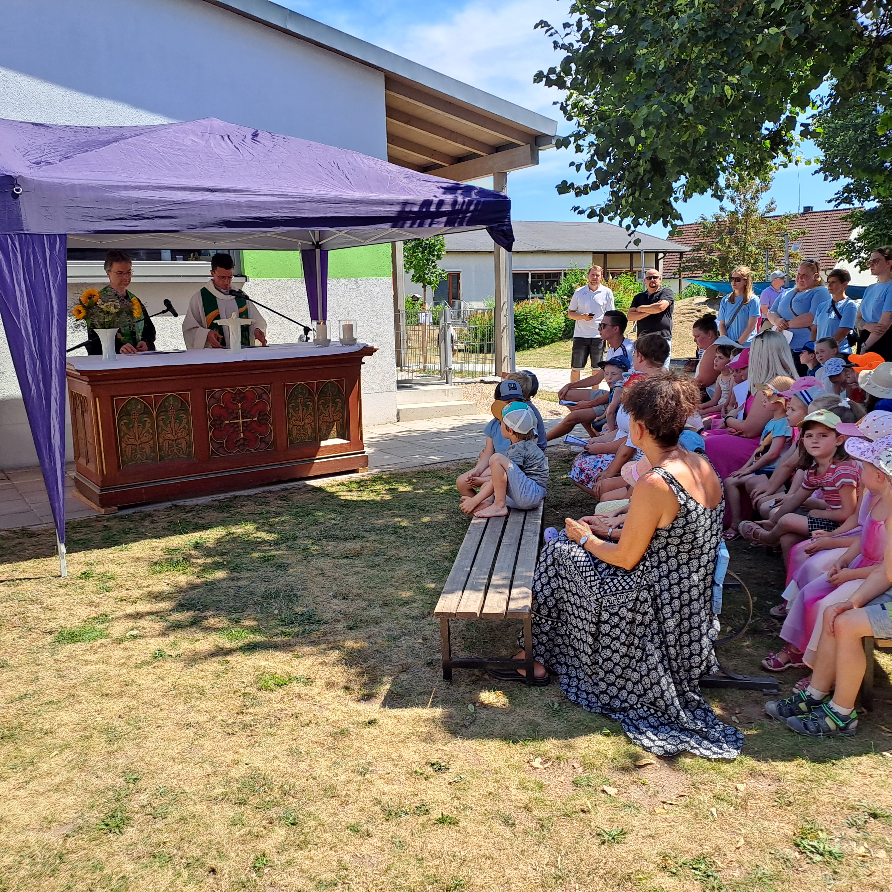 Der katholische Pfarrer Thomas Kohlhepp und der evangelische Pfarrer Andreas Ruhs sprachen zu den Anwesenden von Innehalten, neue Kraft schöpfen, immer im Bildfeld Gott, den ihm sei Ehre in Ewigkeit. „Kommt her zu mir, dass rufen alle Welt, ob Geschäfte, ob Versicherungen, ob Reiseanbieter und und und; immer im Hintergrund der Gewinn. Gott ruft auch, aber er ruft anders, um den Glauben willen, Gott will Ruhe geben, ganz egal wie oder was derjenige ist, man kann zu ihm kommen, wie groß oder klein man auch ist, mit allen Schwächen.“ Auch die Kindergartenkinder brachten sich mit Liedern in die Andacht mit ein und bereicherten sie. So sangen sie „du bist immer da, wo ich gehe, wo ich steht ...“ Nach dem besinnlichen Teil wurden vom katholischen Pfarrgemeinderat und der evangelischen Kirchenvorstandschaft einiges Kulinarische angeboten. Zum reichhaltigen Kuchenbüfett mit Kaffee, sowie alkoholische und nichtalkoholischen Getränken, die bei den schweißtreibenden Temperaturen wichtig waren, konnte man nach Herzenslust Bratwurstsemmeln, Burger und einiges mehr schlemmen. Großen Andrang mit einiger Wartezeit zeigte sich am Stand der Ministranten, sie verkauften Eis, eine Süße Abkühlung in verschiedensten Geschmacksrichtung. Für die Kinder wurde in den Räumen des Kinderhauses als auch im Freien durch das Personal mit Kinderschminken, farbige Zöpfe ins Haar flechten, über unterschiedliche Spiele, bis hin zum Sandkasten mit Schatzsuche oder Wasserbecken zum Füße abkühlen vieles zum Erleben angeboten. Die Pfiffikusbande, die Wild Voices und der evangelische Posaunenchor unterhielten die Besucher an diesem Nachmittag musikalisch.