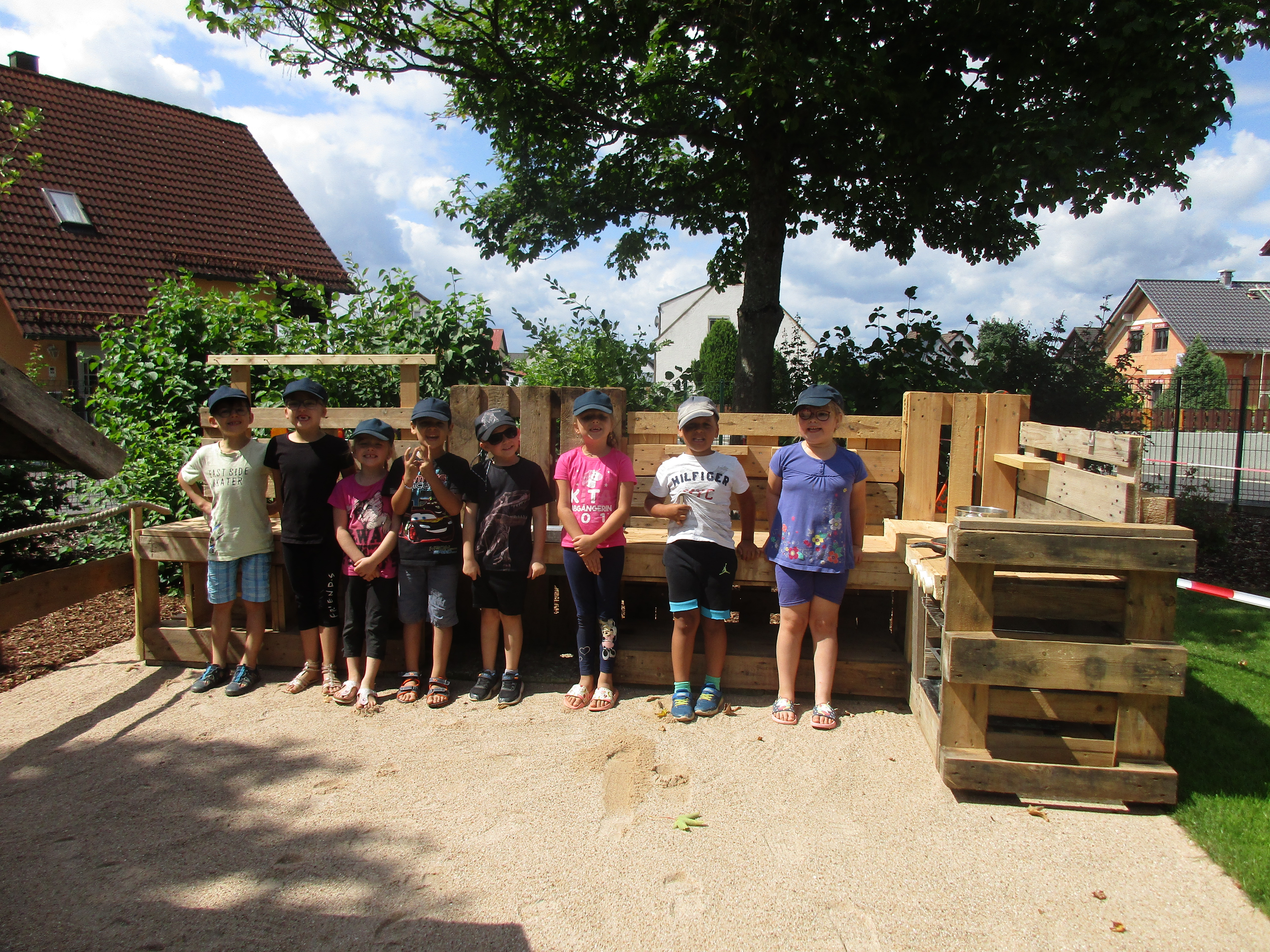 Die Schlaufüchse der blauen Gruppe bauten im Mai 2021 eine Woche lang aus zusammengesammelten Paletten, Bretterrn, Obstkisten, alten Schüsseln etc. unter Anleitung des Hausmeisters des Kinderhauses und ihrer Erzieherin eine selbstgebaute "Matschküche". Voller Freude, viel Einsatz und handwerklichen Geschick hämmerten sie, halfen beim Sägen und Schrauben um am Ende ein tolles Endergebnis vor sich stehen zu haben.