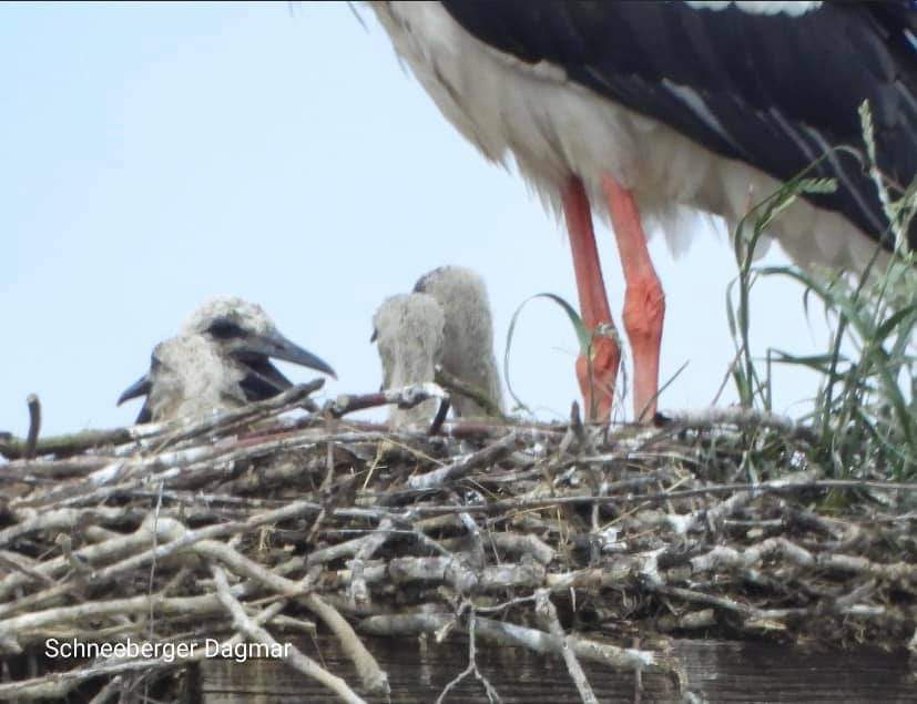 In den vergangenen Jahren hatte das Manteler Storchenpaar immer zwei Jungstörche erfolgreich aufgezogen. In diesem Jahr ist es voll im Horst, vier Junge Störche warten darauf, dass sie von den Eltern gefüttert werden. Jochen Lenkeit, Besitzer des Anwesens, auf dem sich der Horst befindet, ist stolz und freut sich wie ein Schneekönig über den zahlreichen Nachwuchs. „Natürlich ist es für die Eltern schwierig vier Junge durchzubringen, aber bisher sieht es gut aus“, so Lenkeit. Das Foto hat Dagmar Schneeberger geschossen, die ebenfalls in der Hüttener Straße wohnt und das Storchennest im Blick hat.