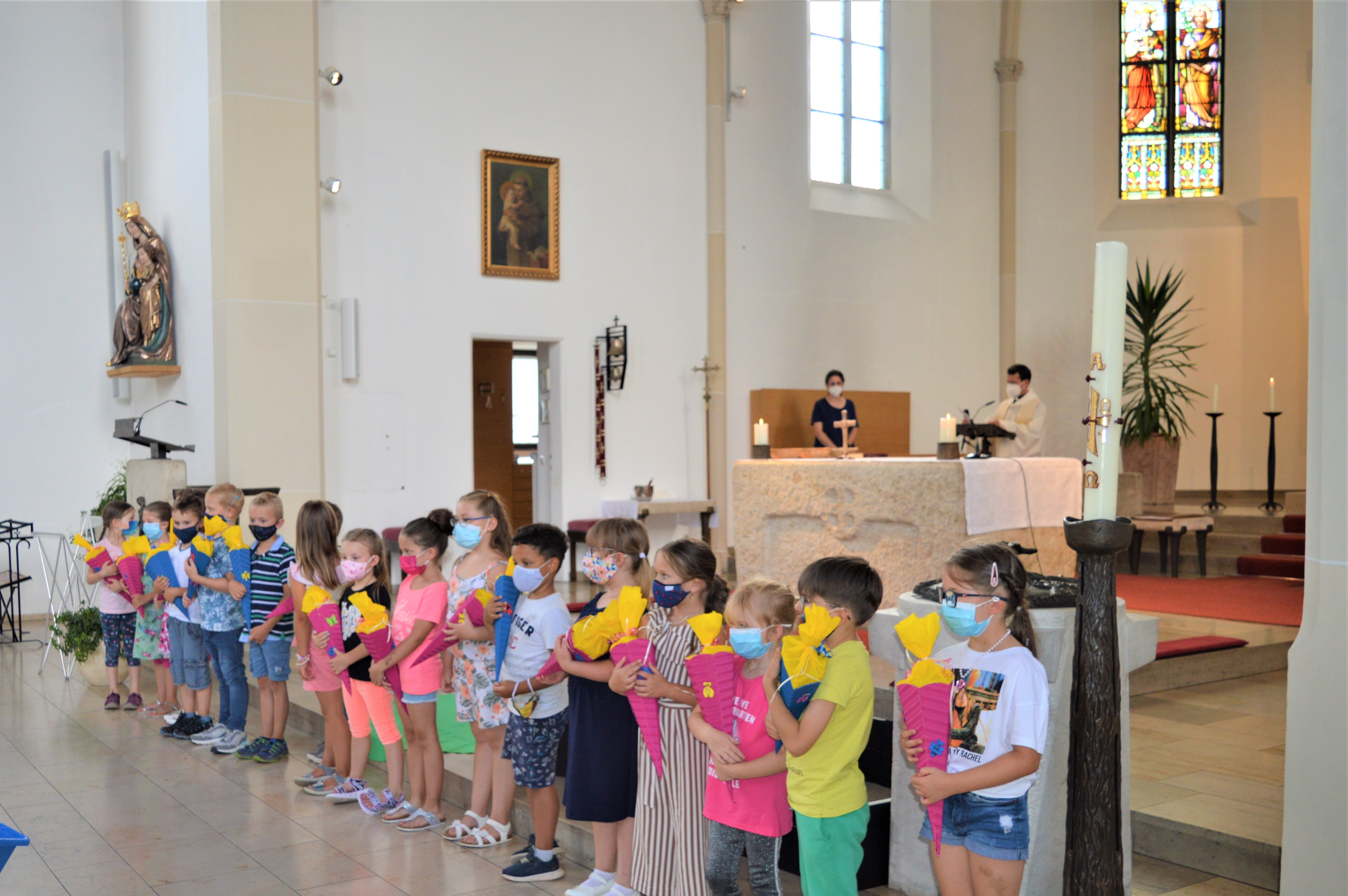 Beim Abschiedsfest wurden die Schlaufüchse (Schulanfänger) mit einem Willkommenslied von den Erzieherinnen begrüßt. Sie hören die Bilderbucherzählung „Der Zuckertütenbaum“. Im Garten des Kinderhauses wu41rde dann nach dem Zuckertütenbaum gesucht. Dann gab es gemeinsame Brotzeit mit Wienerle, Brezen und Semmeln. Um 16 Uhr wurden dann die einzelnen Schulanfänger aus dem Kinderhaus auf eine Matte „rausgeworfen“ mit dem Lied: „Ade du schöne Kindergartenzeit. „Der Kindergarten ist nun aus, da werfen wir die/den …….raus. pfüat di Gott by by. Mit Wünschen der Kinder für die Schule durften diese dann Herzluftballons steigen lassen. Gemeinsam zogen alle zur Kirche der Einzug in das Gotteshaus wurde von Pfarrer Thomas Kohlhepp begleitet. Nach dem Begrüßungslied führte die orange Gruppe das Rollenspiel „Das verlorene Schaf“ auf. Die Kinder der blauen Gruppe trugen die Fürbitten vor und die Kinder der roten Gruppe unterstrichen mit Bewegungen das „Vater unser“ Der Pfarrer segnete die Kreuzketten für die Schlaufüchse und überreichte sie mit seinem persönlichen Segen. Zum Abschluss sangen alle das Segenslied.