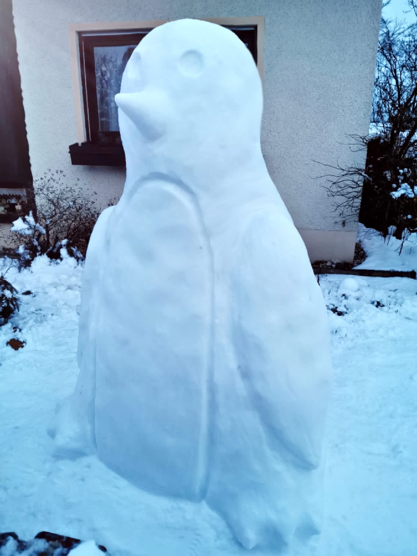 Heuer gab es endlich mal lange genug Schnee damit die Kinder Schneemänner und andere Figuren bauen konnten. Im Garten der Familie Schwarzmeier bauten die Enkel einen Schneemann, der Hut gehörte wohl dem Opa und ein Pinguin versetzte die Betrachter in die Antarktis.