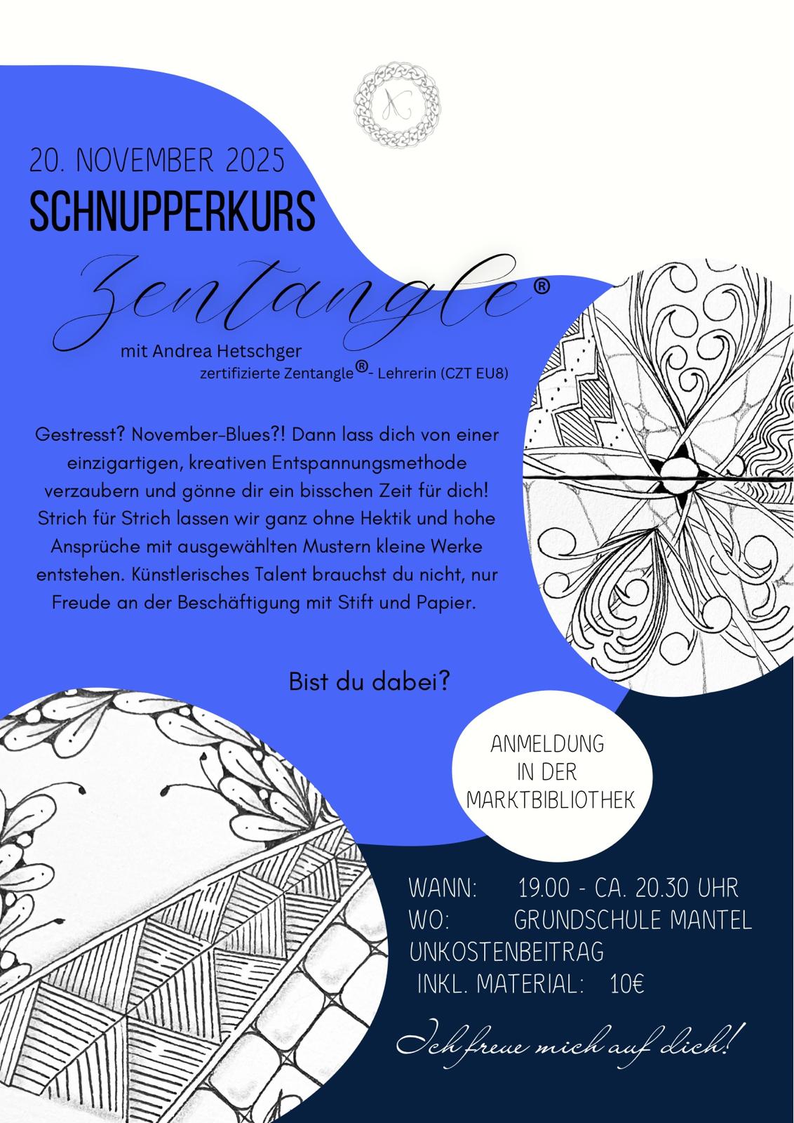 Der Kurs richtet sich an alle, die Lust haben, in entspannter Atmosphäre kreativ zu werden und dabei einen Moment der inneren Ruhe zu genießen. Am Donnerstag, den 20. November 2025, um 19 Uhr, findet der Workshop in den Räumlichkeiten der Grundschule Mantel statt. In dem Unkostenbeitrag von 10 Euro sind sämtliche benötigten Utensilien in guter Qualität enthalten, mit denen die Teilnehmenden die Grundlagen dieser Zeichentechnik kennenlernen können.