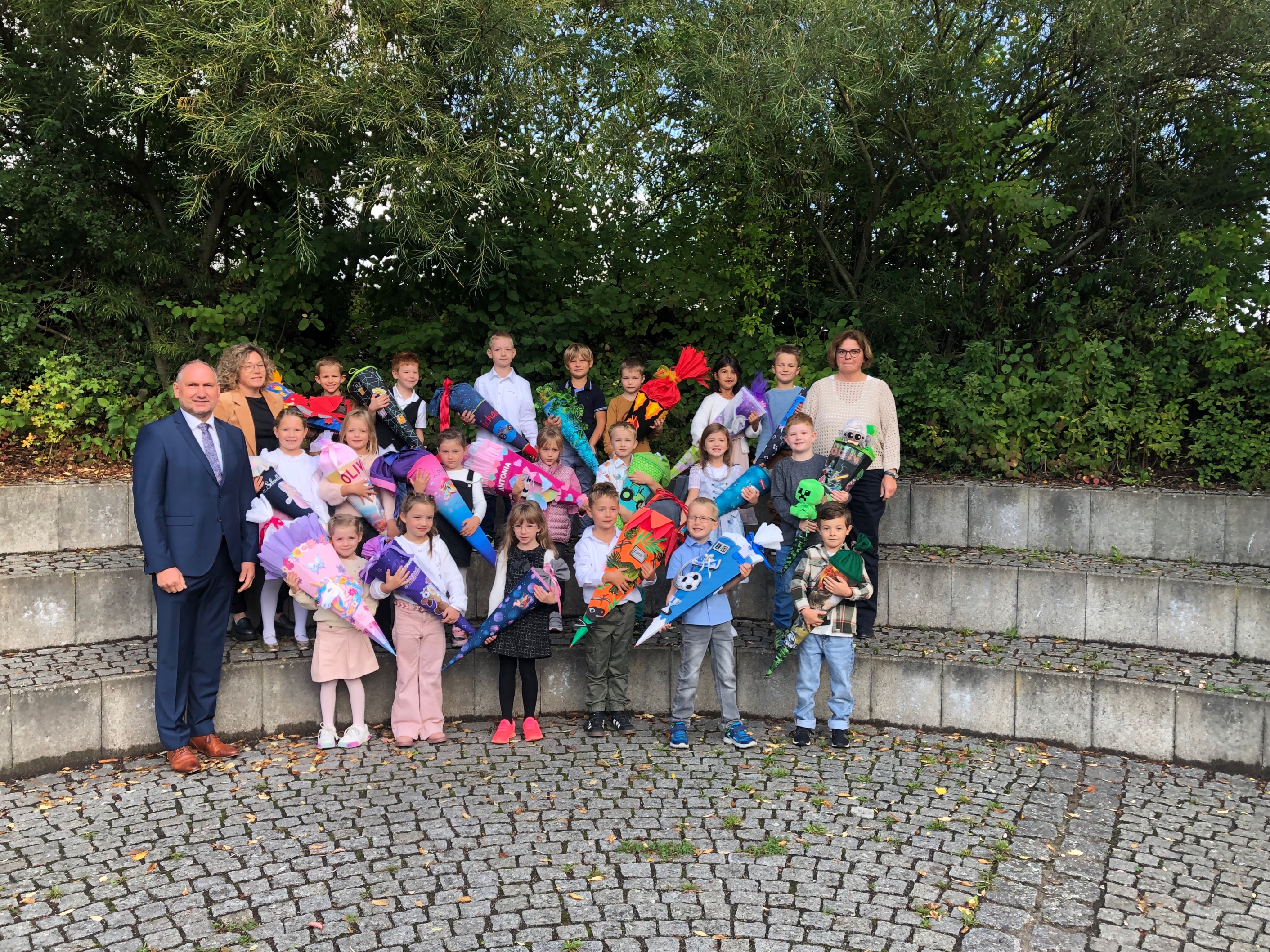 Am ersten Schultag begrüßte Rektorin Anja Kraus neun Mädchen und 11 Jungs mit großen Schulranzen und bunten Schultüten mit Eltern und Großeltern in der Schulaula. Zuerst wurden die ABC-Schützen von ihrer Klassenleiterin Sandra Fenzl zum Fototermin in den Pausenhof zum Atrium geführt und die Kinder erfuhren, wie es bekannten Promis beim Blitzlichtgewitter ergeht. In der Aula stellte Anja Kraus dann die Figuren Linus und Lola vor. Auch für sie war am ersten Schultag so vieles neu. Lola war ganz „murmelig“ zumute. Rektorin Kraus hatte eine „Mutmurmel“ in der Hand mit der sie dann Murmeln für die Kinder zu Mutmurmeln machte. Jeder Erstklässler bekam eine Murmel geschenkt, die er in die Hosen- oder Jackentasche stecken konnte und zum Mut holen anfassen kann. Es wurde auch noch die Puppe Mimi gezeigt, welche die Kinder im Unterricht begleitet. Die Kinder waren ja schon einige Male im Schulhaus zu Besuch „aber so ein richtiger Schultag fühlt sich ganz anders an“, so Kraus. Bürgermeister Richard Kammerer begrüßte die Kinder mit Angehörigen sowie Lehrerin und Rektorin. „Für euch beginnt heute ein großes Abenteuer. Ihr dürft vieles erleben und lernen. „Ich hätte auch gerne so eine Mutmurmel“ wünschte sich der Rathauschef. „Wichtig ist, dass ihr auf eurem Schulweg gut aufpasst, dass euch nix passiert“, so Kammerer. Jedes Kind bekam von ihm ein Fruchtsaftgetränk und „Lachgummis“ geschenkt. Im Pausenhof stand eine geschmückte, alte Schulbank aus früheren Zeiten, auf der nahm der Bürgermeister in Erinnerung an seine Schulzeit nochmal Platz. Das Thema Schulweg griff die Rektorin nochmal auf, indem sie den Eltern erklärte, dass die Kinder in der ersten Klasse schon einen Fahrradpass erhalten der sie bis zur Radprüfung begleitet und in dem Pass müssen die Eltern bestätigen, dass sie mit den Kindern den Schulweg eingeübt haben. Die Kinder gingen dann mit Sandra Fenzl in ihr Klassenzimmer und freuten sich über die Geschichte vom Löwen, der nicht schreiben konnte. Die Mädchen und Jungs bekamen einen kleinen Löwen, der sie beim Lernen unterstützen soll. Als erste Aufgabe wurde dann eine Schultüte gemalt. Die Eltern wurden in dieser Zeit in der Aula vom Elternbeirat mit Kaffee und Gebäck bewirtet, alles auf Spendenbasis. Nach der ersten Schulstunde gingen die Kinder mit Eltern und teilweise Omas und Opas in die evangelische Kirche zum ökumenischen Gottesdienst. Sie wurden von den Pfarrern Thomas Kohlhepp und Andreas Ruhs einzeln gesegnet. Auch die Zweit- bis Viertklässler besuchten extra einen Gottesdienst und baten Gott für dieses Schuljahr um seine Begleitung und seinen Segen.