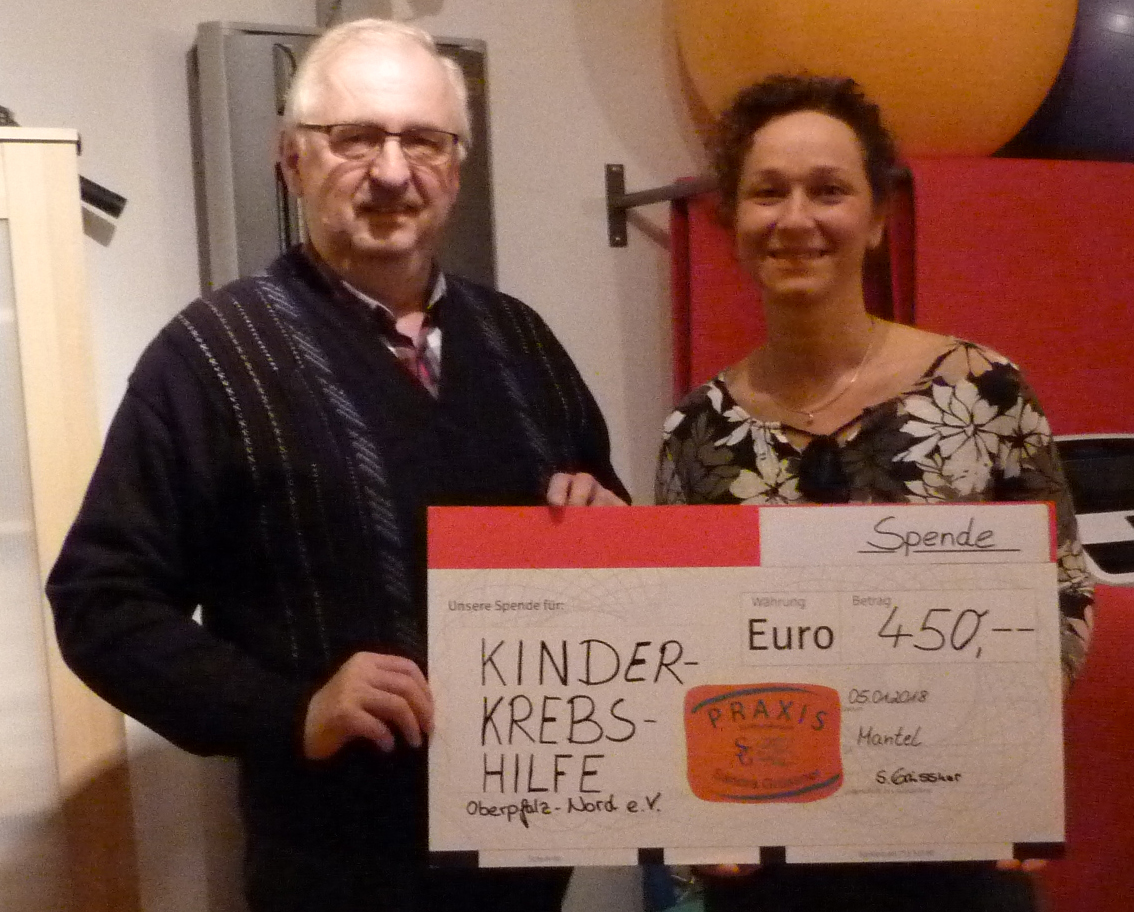 Herbert Putzer, der Vorsitzende der Kinderkrebshilfe in der Region Oberpfalz Nord e.V. konnte sich über eine Spende von 450 Euro von Sandra Grüssner, Chefin der Praxis für Physiotherapie Grüssner aus Mantel freuen.