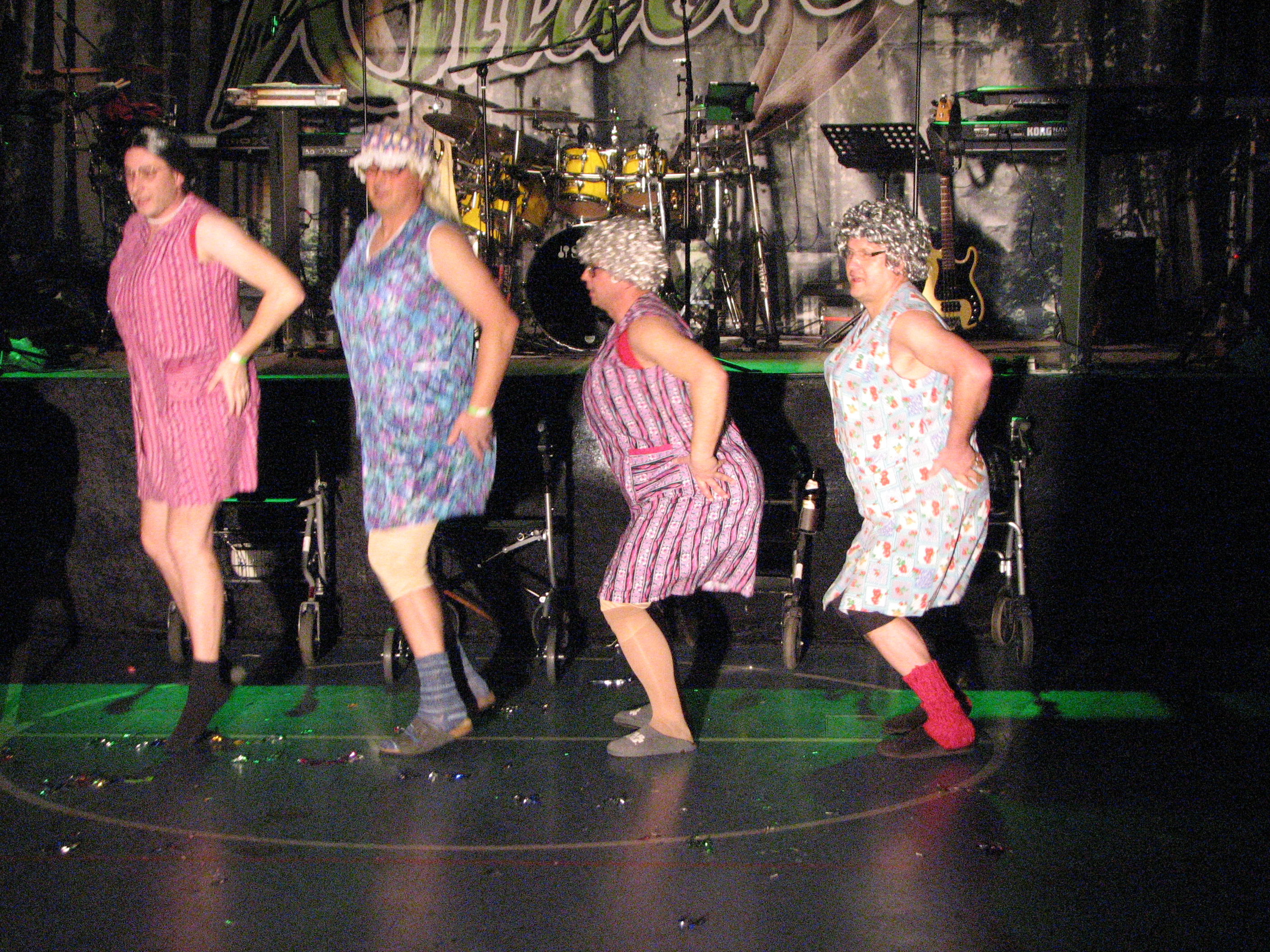 Nach mehreren Runden mit dem Rollator begannen sie ihren ersten Tanz zum Lied „Du hast mich tausendmal belogen“ und glänzten mit abwechslungsreichen Einlagen. Synchron und nahezu elegant war ihr Auftritt zum Lied „Macarena“ und sie bewegten sich mit tanzspezifischen Einlagen im Rhythmus zur Musik. Unter frenetischem Applaus wurde eine Zugabe nach der anderen gefordert. Zu „We will rock you“ benutzten die Damen Gehstöcke, klopften zunächst im Takt mit ihnen auf den Boden und ahmten nach langsamem Beginn Rockstar Jimmy Hendrix nach. Beim Lied „Sexy“ von Marius Müller-Westernhagen suchten die Akteure auch den körperlichen Kontakt zum Publikum und jedes „Spice Girl“ zeigte seine individuellen tänzerischen Fähigkeiten. Ausgelaugt räumten die gealterten Damen nach 40 Minuten im vollen Einsatz das Feld und wurden unter tosendem Applaus verabschiedet.