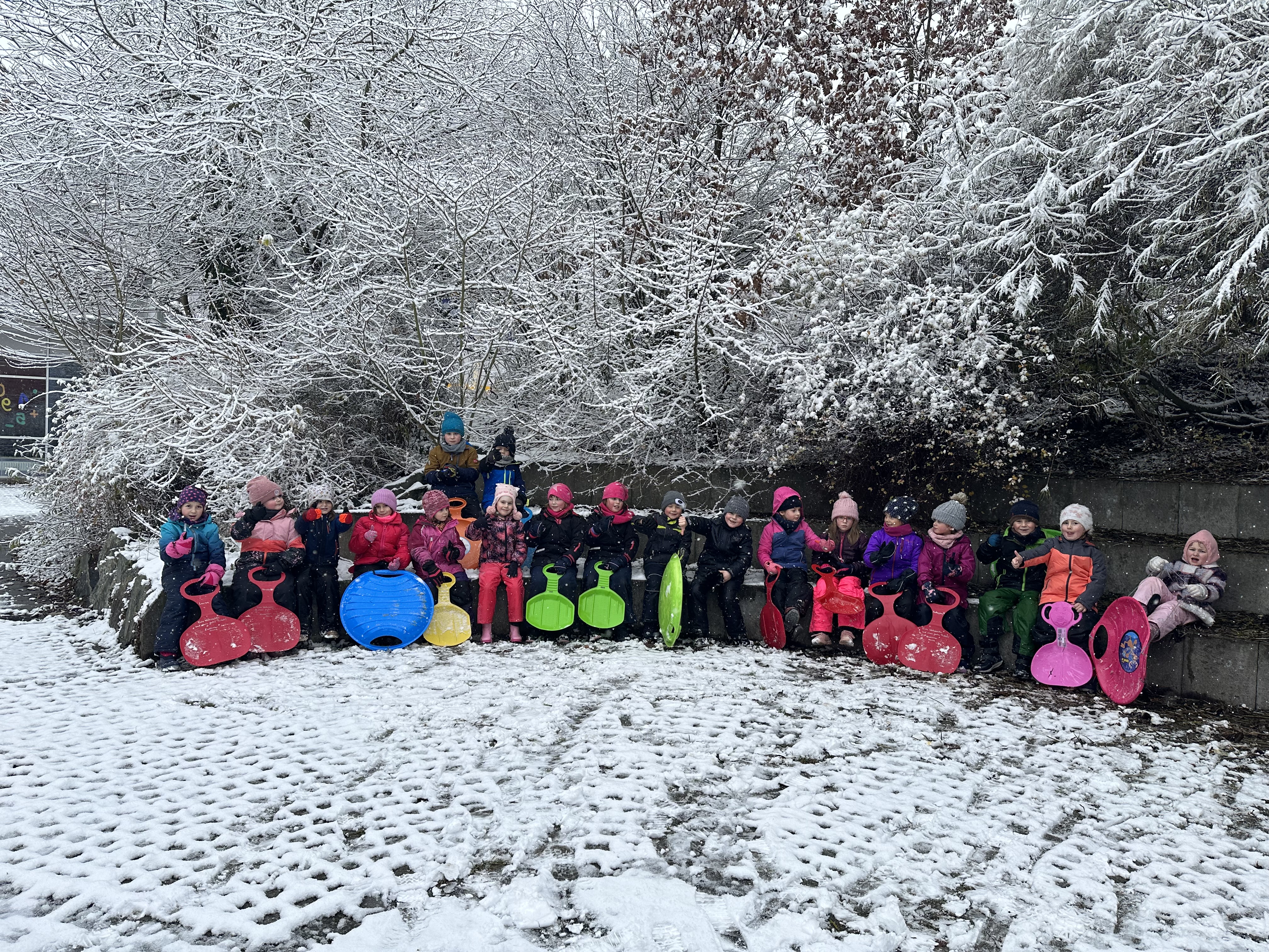 Sportstunde im Schnee. Fest eingepackt ging es mit den mitgebrachten Poporutschern auf die
