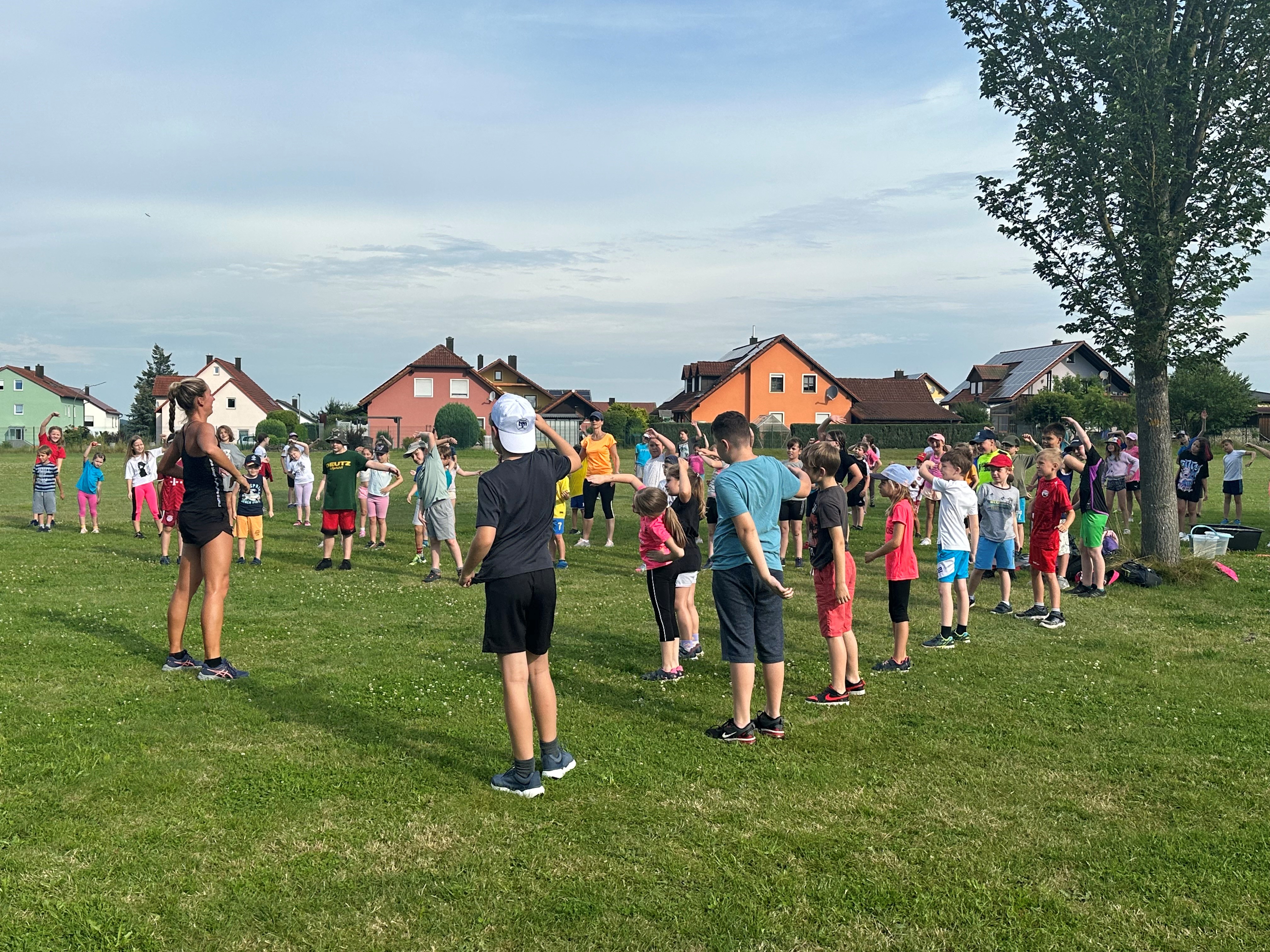 Am Freitag fand im Pausenhof und auf dem Sportplatz der Grundschule für alle Schüler ein sportliches Spielefest statt. Hier durften die Kinder an verschiedenen Stationen, die von den Lehrerinnen und einigen Hilfskräften betreut wurden, ihr Können zeigen. So gab es einen Hindernislauf auf der Hartbahn, eine Schatzsuche in der Sprunggrube, einen Wasserlauf auf der Wiese, eine Tennisstation im Hof, eine Fahrt mit den Pedalos auf dem Hartplatz, eine Fußballstation, ein Bobbycarrennen und einen Tic-Tac-Toe-Lauf. Eröffnet wurde dieses Fest mit einem Aufwärmprogramm, das die Lehramtsanwärterin Tina Renner zu rockiger Musik mit den Kindern durchführte. In der Pause verwöhnte der Elternbeirat die Schüler und Lehrer mit geschnittenen Melonen. Auch nach dem Fest gab es Eis vom Elternbeirat, welches an diesem heißen Julitag allen eine herrliche Abkühlung verschaffte.