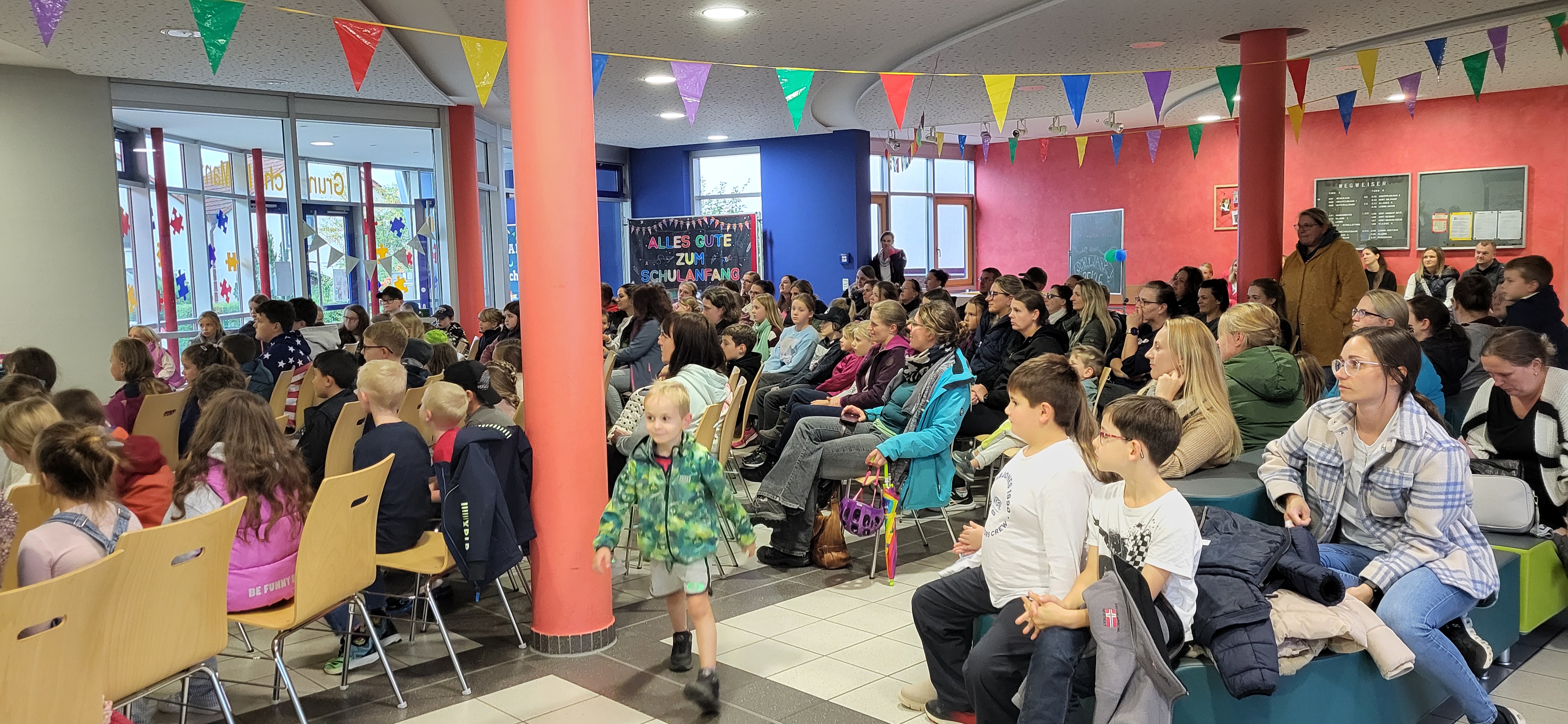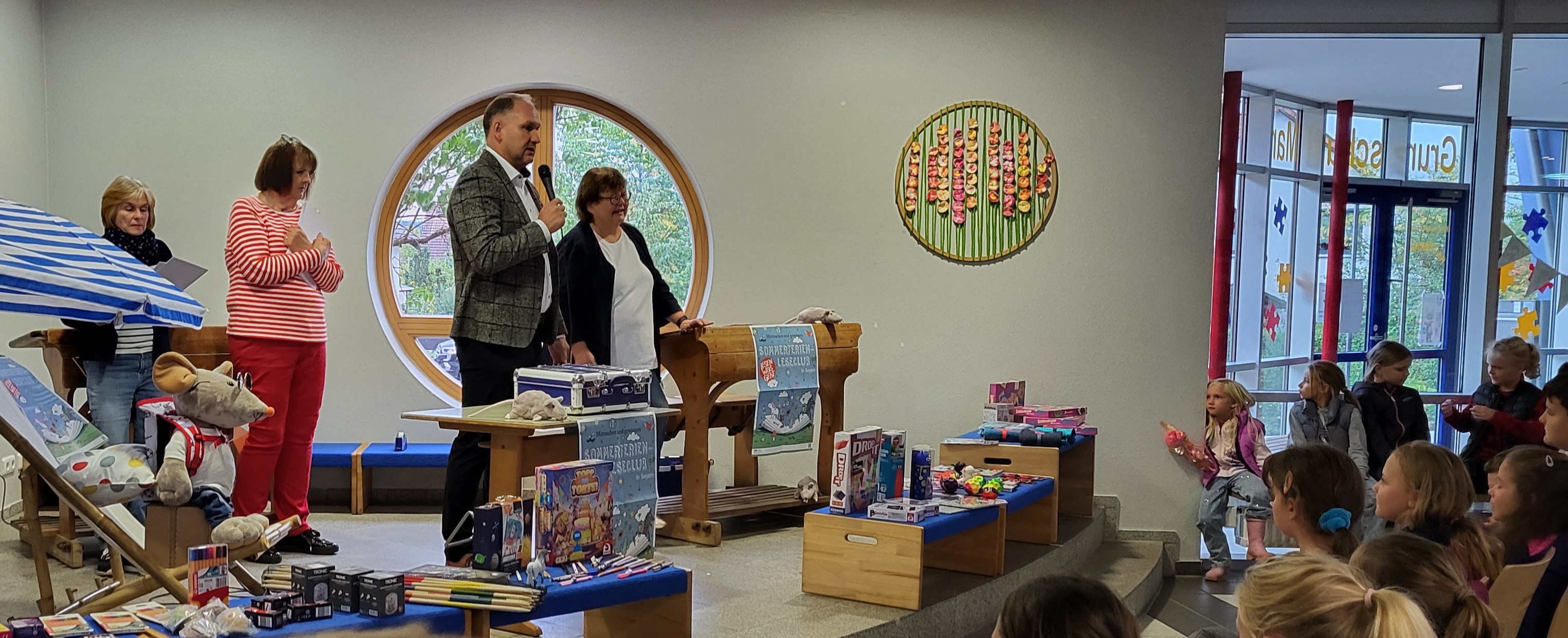 Elisabeth Grassler, Liane Schmid und Gudrun Bühler vom Bibliotheksteam begrüßten gemeinsam mit Bürgermeister Richard Kammerer die zahlreich erschienenen Familien. Die Aula war gut besucht – ein schönes Zeichen für die Wertschätzung der Aktion durch Kinder, Eltern und Gemeinde.