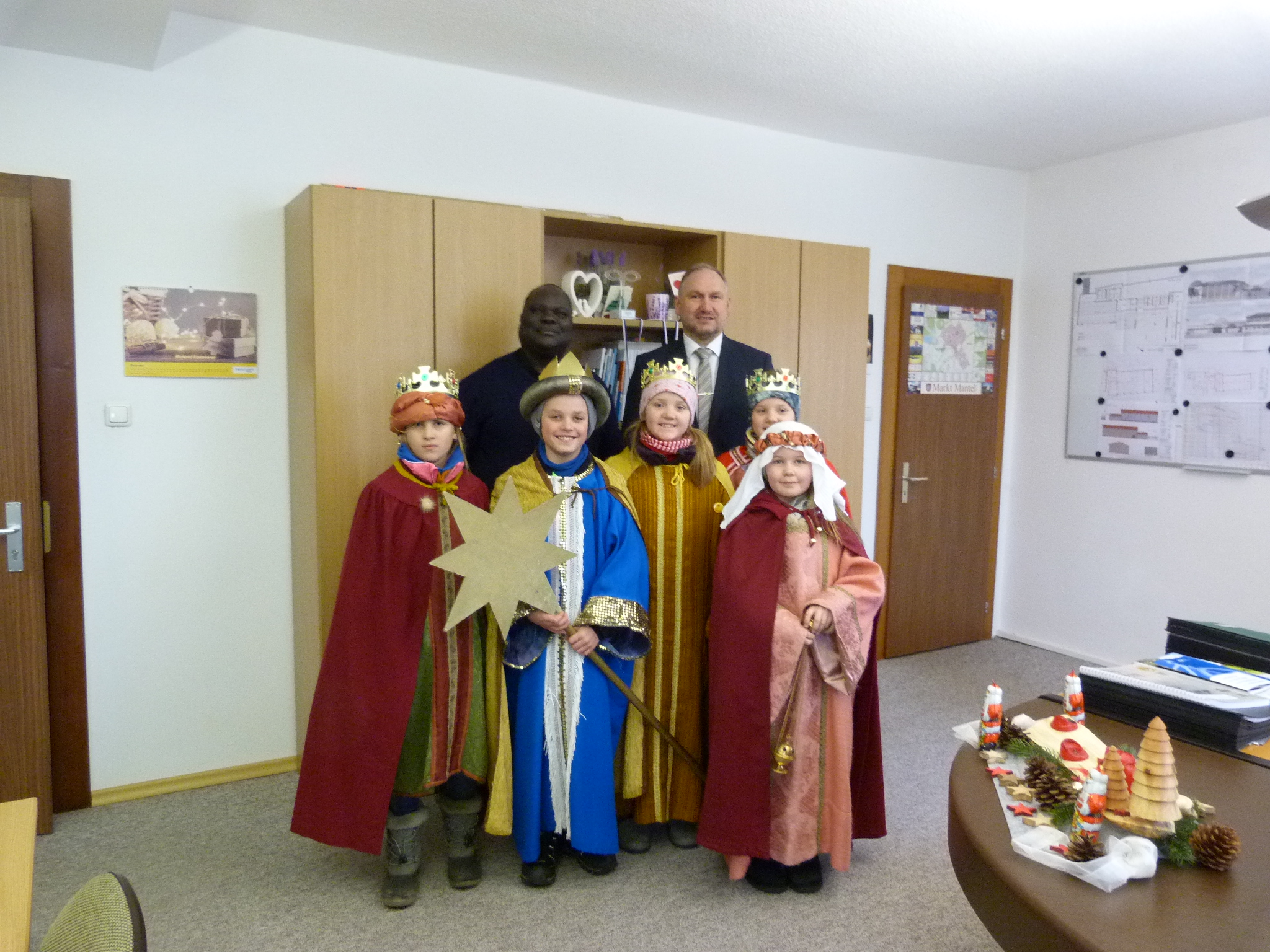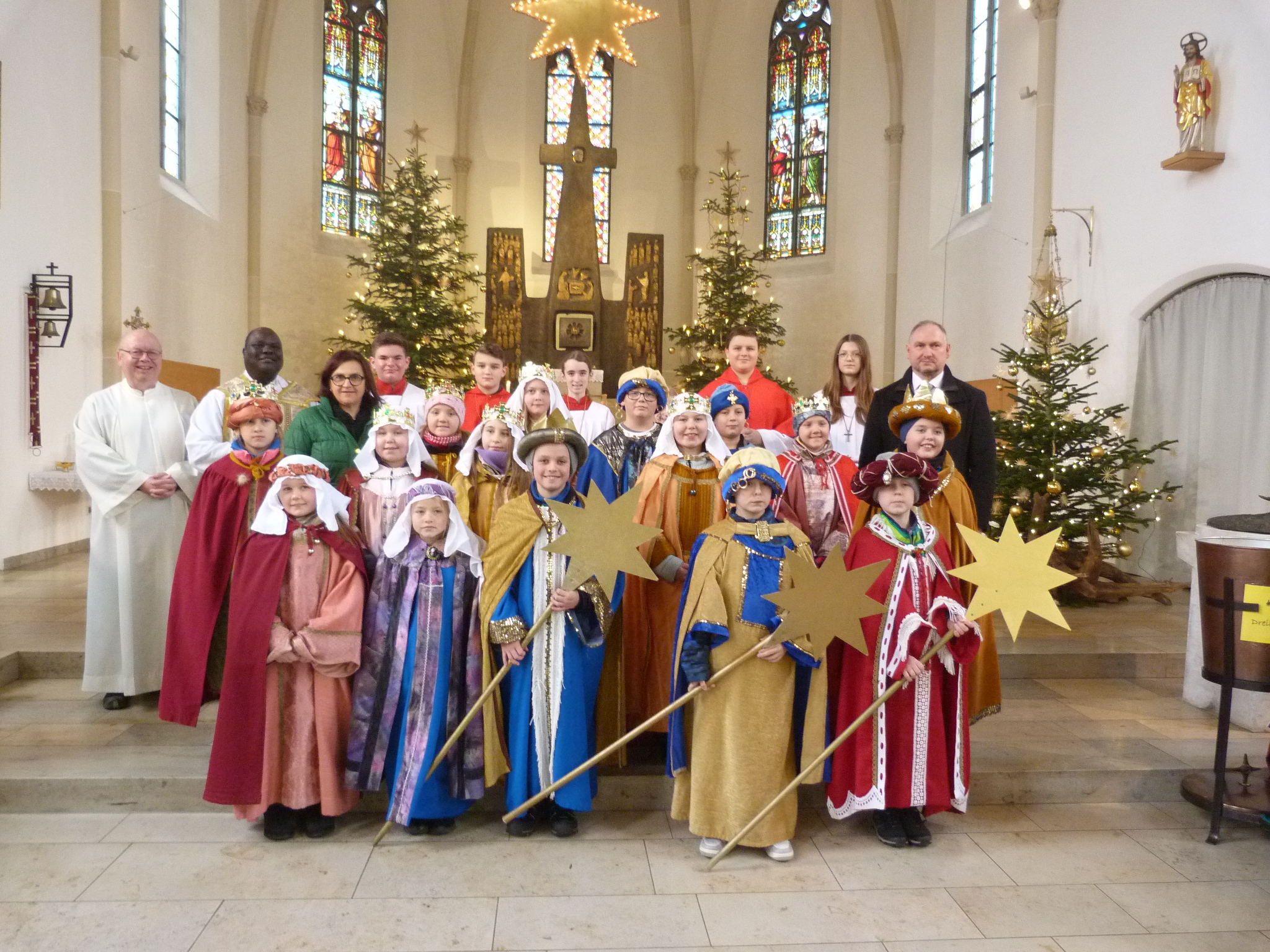 Im Verlauf des Gottesdienstes trugen die Sternsinger die Fürbitten vor um Bitte für alle Menschen, die große Veränderungen zum Schutz der Schöpfung ermöglichen können, für Politiker, für Verantwortliche in Wirtschaft und Handel, für Forscher, die neue Technologien entwickeln und auch für Menschen in unseren Pfarreien, die auf der Suche nach erfüllender Gemeinschaft im Glauben sind, oder auch für alle Kinder im Amazonien und weltweit, deren Heimat durch die Folgen von Umweltzerstörung bedroht sind, durch die Rodung des Regenwaldes, durch Kriege um Rohstoffe, durch Naturkatastrophen infolge des Klimawandels. Nach dem Segen des Weihwassers, Weihrauchs und Kreide/ Aufkleber bedankte sich der Geistliche am Ende des Gottesdienstes bei den 15 Königinnen und Königen für das dabei sein und bei den Verantwortlichen des Pfarrgemeinderates und des Teams für die Organisation. Erster Bürgermeister Richard Kammerer, der den Festgottesdienst mitfeierte, bedankte sich ebenfalls bei den Kindern mit einem kleinen Präsent. Die Heiligen Drei Könige besuchten an diesem Tag noch das Rathaus und die angemeldeten Gläubigen um den Segen mit „Christus mansionem bendicat“ dort an die Eingangstüre zu schreiben.