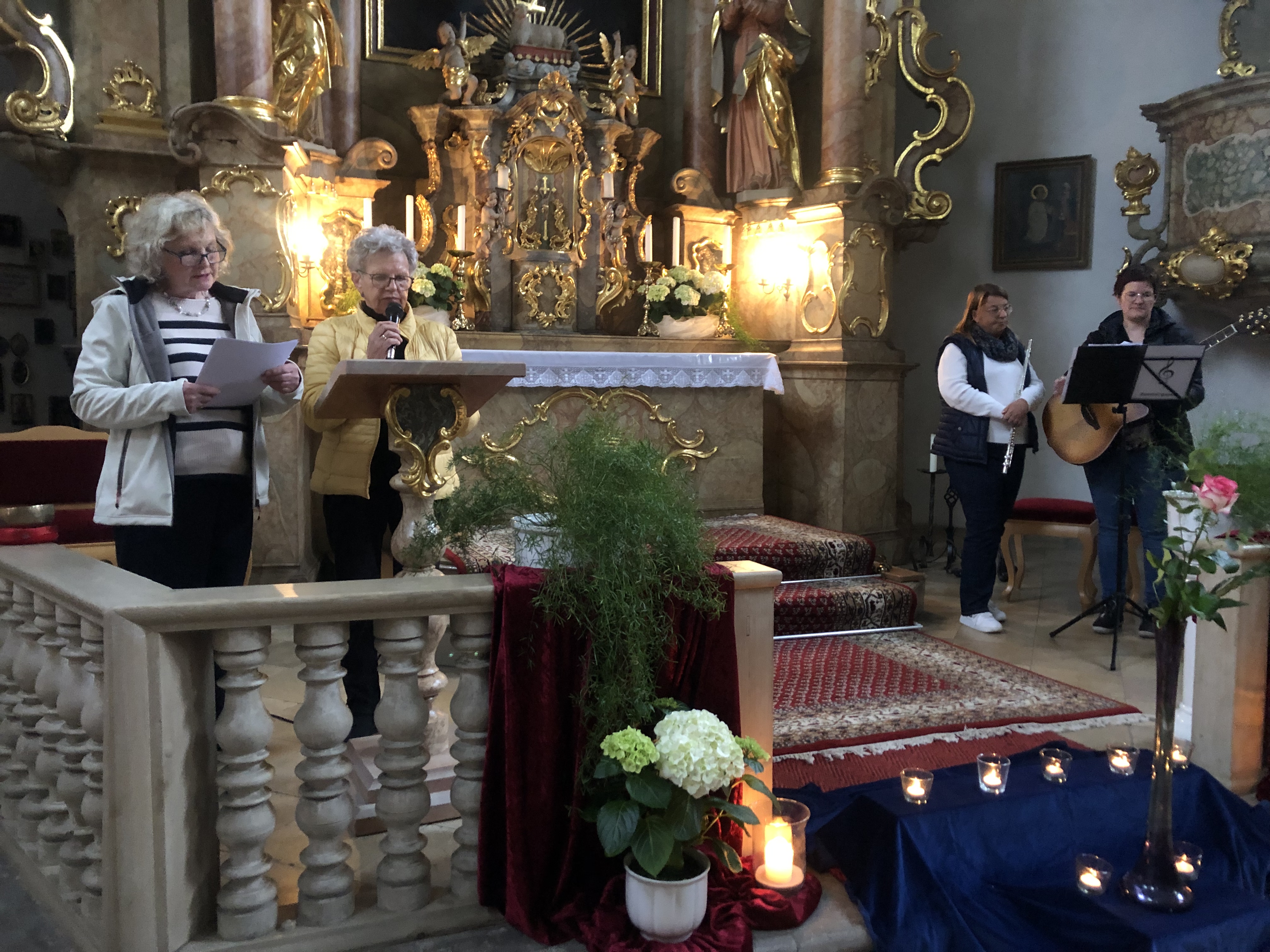 Die Atempause für die Seele in St. Moritz stand unter dem Thema: „Maria – Eine von uns“. Die Moritzkirche war gut besucht. Rita Bayer und Gerti Münche lasen passende Texte. „Wir wollen heute Maria in den Mittelpunkt stellen“. Ihr Weg ging durch dunkle Schluchten und über leuchtende Höhen, immer war es ein Weg zu Anderen und mit Anderen. „Maria du hast ihn als Kind in deinem Leib getragen obwohl es schwer für dich war. „Deine Begegnung mit Elisabeth hat dir gezeigt dass dieser Weg richtig, wenn auch steinig und schwer war. „Maria war Gefährtin, Freundin und Mutter. In Ungewissheit und Sorge vertraute sie auf Gott. Das ist etwa was uns schwer fällt. Bei einer Klangschalenmeditation wurden die Fragen gestellt: „Was berührt mich an Maria?, Hat mir Maria etwas über meinen Weg zu sagen?. „Maria, darf ich mit dir gehen?. Beim Friedensgebet wurde erinnert, dass auch Maria vertrieben wurde von einem König damaliger Zeit sie musst enach der Geburt von Jesus fliehen, der ja in die Welt kam um Frieden zu bringen. Es braucht Mut um „Ja“ zu sagen zur Begegnung und „Nein“ zu Feindseligkeit. Ja zum Dialog nein zur Gewalt. Für all das braucht es Mut und eine große Seelenstärke. Verschiedene Fürbitten wurden an die Mutter Gottes gerichtet. Im Segensgebet wurde gebeten, komm und segne uns, sei die Hand die sanft berührt, sei mein Gott, führe und leite mich, ich bin bereit deinen Weg zu gehen, dem Leben entgegen. Doris Bär und Theresa Uhl als Duo „Zsammg´spuit begleiteten die Atempause mit Gitarre, Querflöte und Gesang. Zu Herzen ging „Ave Maria!“ oder „Komm herein“ und auch „Maria unsre Königin“. Gemeinsam sangen alle dann Segne du Maria. Die Stimmung in der Moritzkirche passte zu, Abemd. Der Maialtar bei der Muttergottes war mit Hortensien geschmückt und vor dem Altar stand eine wundschöne Rose und viele Teelichter sorgten für warme Stimmung. Die nächste Atempause wird Ende Juli stattfinden.