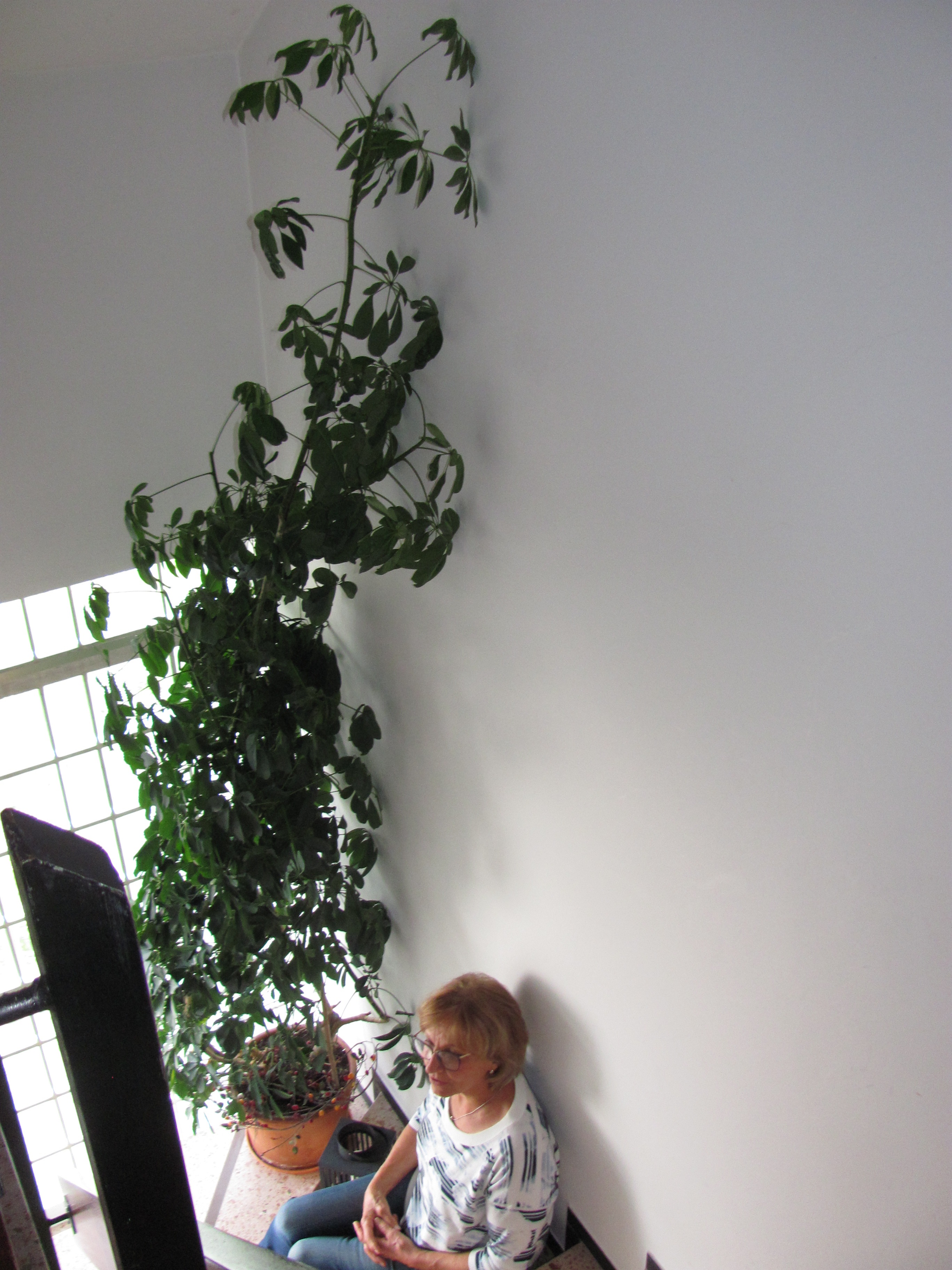 Als Zimmerpflanze ist die Schefflera oder Strahlenaralie praktisch in jeder Wohnung und jedem Büro zu finden. Die wüchsige Blattschmuckpflanze ist nämlich vor allem eins: robust. Das beweist die Pflanze im Hausflur von Maria Hartwig. Sie ist so in etwa 25 Jahre alt und rankt sich gute vier bis fünf Meter durch das Treppenhaus in die Höhe. Der Schwiegersohn von Maria hat sie kürzlich erst wieder an der Wand befestigt. Maria Hartwig freut sich, dass die Pflanze nun fast ohne Erde auskommt und im Topf fast nur noch Wurzeln zu finden sind, denn Umtopfen wäre äußerst schwierig. Mit Glück kann einen also die Schefflera ein ganzes Leben begleiten.