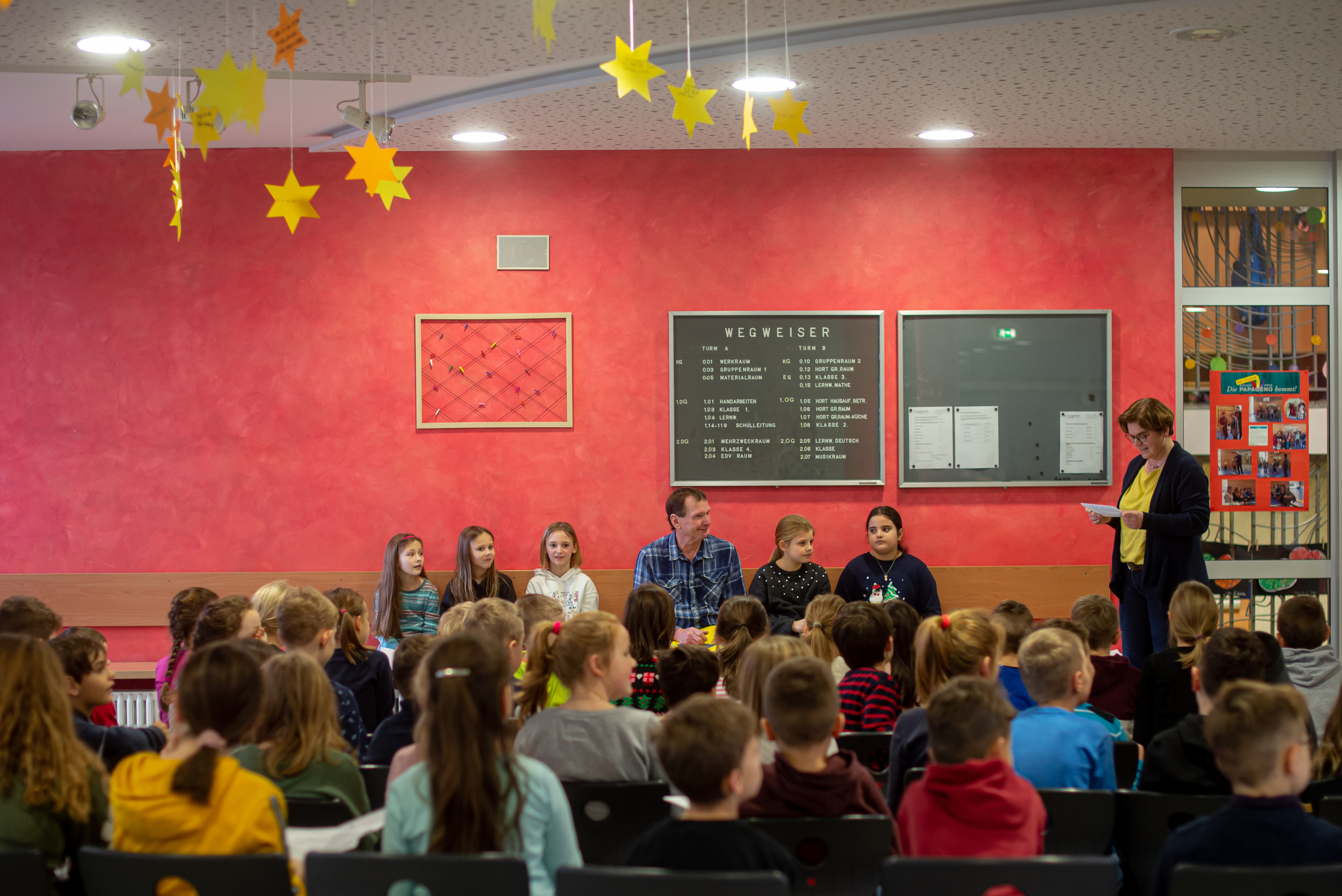Am Freitag, den 23.12.22 verabschiedeten die Schulkinder ihren „Hausi“ Hans Stubenvoll zusammen mit Rektorin Anja Kraus, den Lehrkräften, der Sekretärin, dem Hortpersonal, dem Elternbeirat und einigen Pensionisten in den wohlverdienten Ruhestand. In einer kleinen Aufführung stellte die vierte Klasse fest, dass ein Hausmeister ein richtiger Superheld sein muss, da er Arzt, Seelentröster, Elektriker, Gärtner und manchmal auch Geheimagent in einer Person ist. Die Kinder der übrigen Klassen berichteten noch einmal von den schönen Erlebnissen, die sie mit ihrem Hausmeister hatten. Dieser lauschte sichtlich gerührt deren Erzählungen. Den Höhepunkt fand die in der Aula der Grundschule abgehaltene Abschlussfeier in einer umgetexteten Version des Liedes „Ein Hoch auf dich“, mit dem sich alle Anwesenden im Chor noch einmal für die Arbeit der letzten Jahre bedankten. Als Erinnerung überreichten die Kinder dem scheidenden Hausmeister eine Superheldentasse sowie eine Superheldenkarte, auf der alle Schüler unterschrieben hatten. Rektorin Anja Kraus übergab im Namen „aller Großen“ eine Überraschung, mit der er sich den Ruhestand versüßen kann.