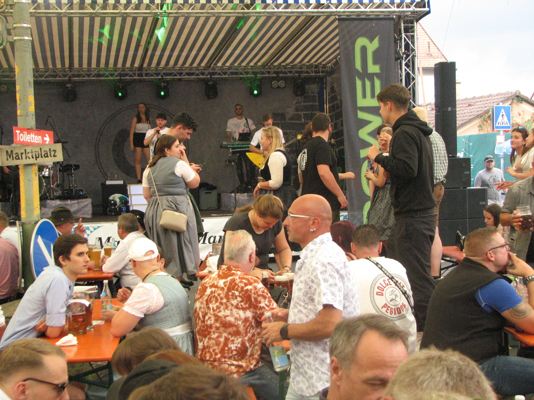 Am Spätnachmittag wechselte die Musik. Ab 17 Uhr spielte die Partyband Power. Sie sorgten mit den Klassikern der letzten Jahrzehnte für Stimmung, hatten die urigsten Kracher aus Bayern und Österreich im Gepäck und auch Partyhits zum Mitsingen. Während der Veranstaltung sorgte ein großer Seidenfallschirm auf der Fläche vor der Bühne für Sonnen- und Regenschutz. Gegen 1830 Uhr wurde der Nutzen dieser künstlichen Überdachung richtig spürbar, als ein Platzregen auf die Gäste niederprasselte. Die Band und auch die jungen Gäste ließen sich die gute Laune nicht vermiesen und feierten froh gelaunt weiter, ehe sie sich, bedingt durch den Abbau, auf das „Nachbürgerfest“ in den Posthof verdrängen ließen. Es verging noch ein gutes Stück an Zeit, ehe die Letzten nach Hause wollten.