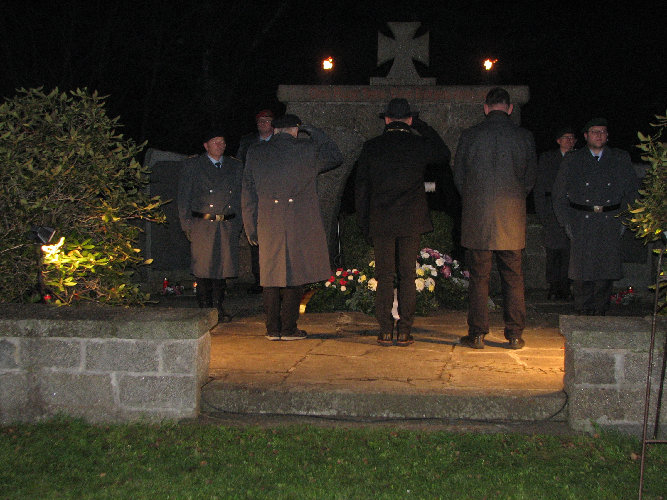 Zum Gedenken der gefallenen Soldaten aus den beiden Weltkriegen legten Richard Kammerer, Erhard Neubauer und VdK-Vertreter Gerhard Hamm vor dem Kriegerdenkmal Kränze nieder. Gemeinsam mit den Gläubigen und den Fahnenabordnungen der örtlichen Vereine gedachten sie der gefallenen Soldaten der beiden Weltkriege und der Gefallenen bei Bundeswehreinsätzen fern der Heimat. Der MGV Mantel und die Störnsteiner Blaskapelle beendeten die Veranstaltung mit der Deutschlandhymne.