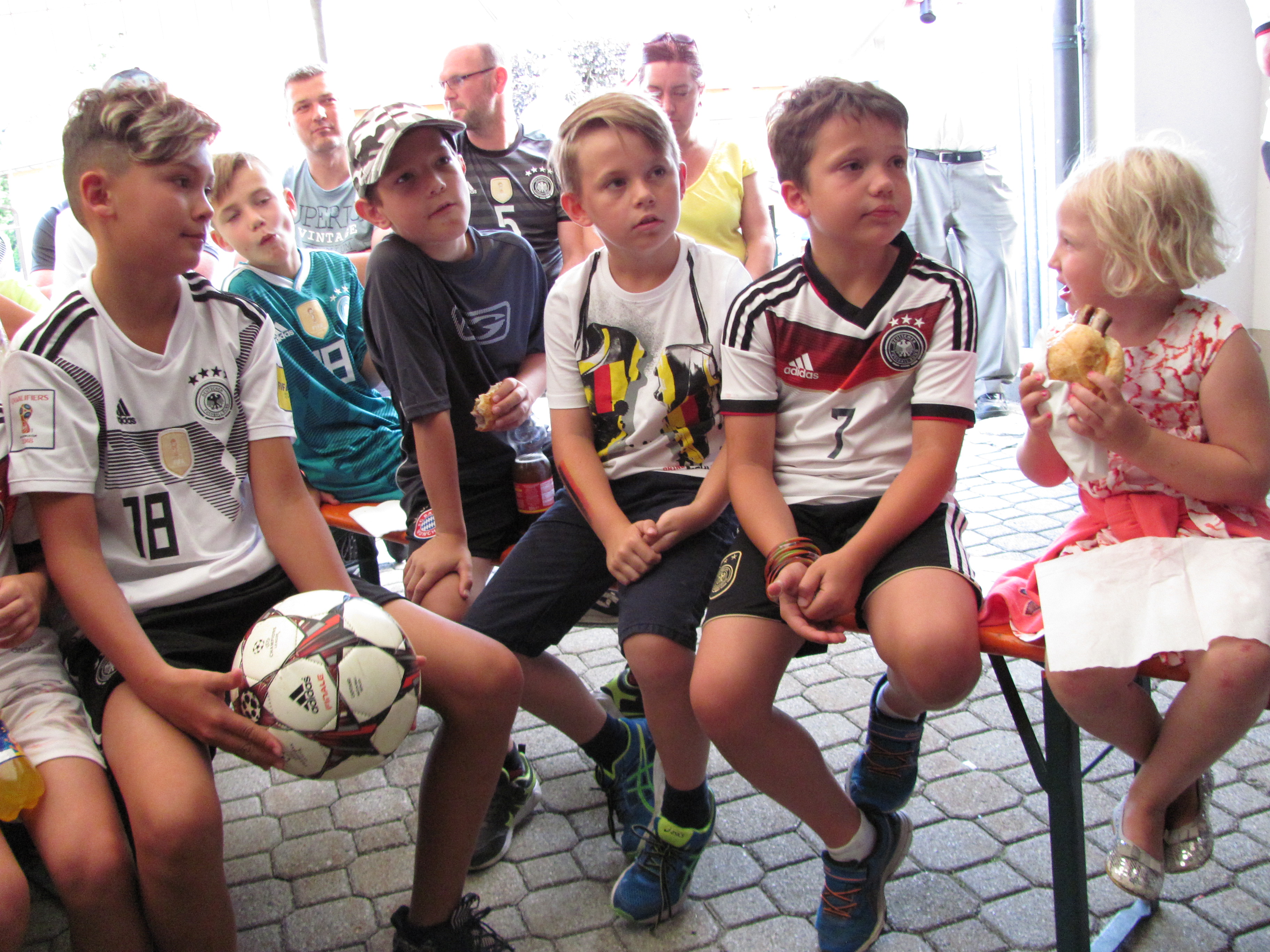 Bevor die Fußballbegeisterten Manteler zum Public-Viewing zur Feuerwehr kommen können, haben die Floriansjünger, allen voran Timo Krauß, Martin Göppl, Richard Kammerer, Harald Dobner, Andreas Fenzl und Matthias Ay viel Arbeit. Die Fahrzeuge müssen aus den Hallen gefahren werden, Tische und Bänke aufgebaut, ebenso die große Bar Theke. Dann wird mit Bauzaun und Planen noch ein weiterer Zuschauerraum mit zweiter Großbildleinwand geschaffen. Der Beamer muss an der Decke in seine Halterung montiert werden und vieles mehr. Die Mannen am Grill beginnen Steaks und Bratwürste zu brutzeln denn de Spezialitäten vom Holzkohlengrill sind eine Stunde vor dem Anpfiff schon heiß begehrt. Am Sonntag, 17. Juni strömten dann gut 250 Fußballfans, angefangen vom Baby im Kinderwagen, Juniorkicker, Mütter, Väter und auch Omas und Opas zum Feuerwehrhaus. Wer spät kam musste mit einem Stehplatz Vorlieb nehmen. Richard Kammerer begrüßte die Gäste und forderte sie auf, wie auch im Stadion bei der Nationalhymne aufzustehen, was alle sofort befolgten und Stadionstimmung herrschte von Anfang an im Feuerwehrhaus. An der Theke gab es kühle Löschzwerge, Erfrischungsgetränke und Schnäpse. So mancher wird nach dem enttäuschenden Ergebnis dann etwas Hochprozentiges gebraucht haben und es hieß dann „Geteiltes Leid ist halbes Leid“ denn die Fans waren ja alle in bester Gesellschaft. Auch Bürgermeister Dr. Stephan Oetzinger war mit von der Partie. An die Kinder wurden Tütchen mit Popcorn verteilt und viele Gäste hatten sich schon selbst mit Keksen und Knabberzeug versorgt. Vor vier Jahren bei der WM und vor zwei Jahren bei der EM war schon eine ständige Fangemeinde beim gemeinsamen Fußball-Gucken bei der Feuerwehr zusammengewachsen und die Stammgäste haben sich wieder eingefunden und es kamen noch neue Fußballfans dazu.