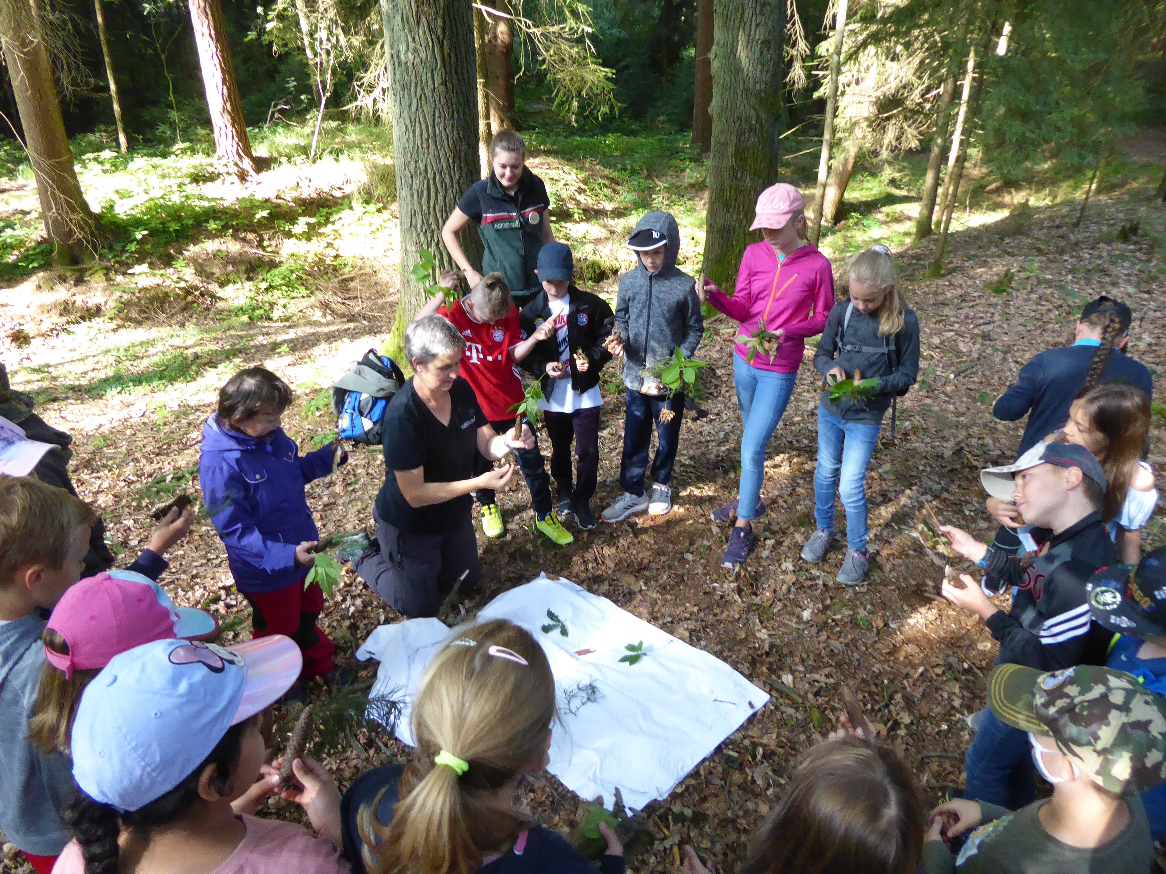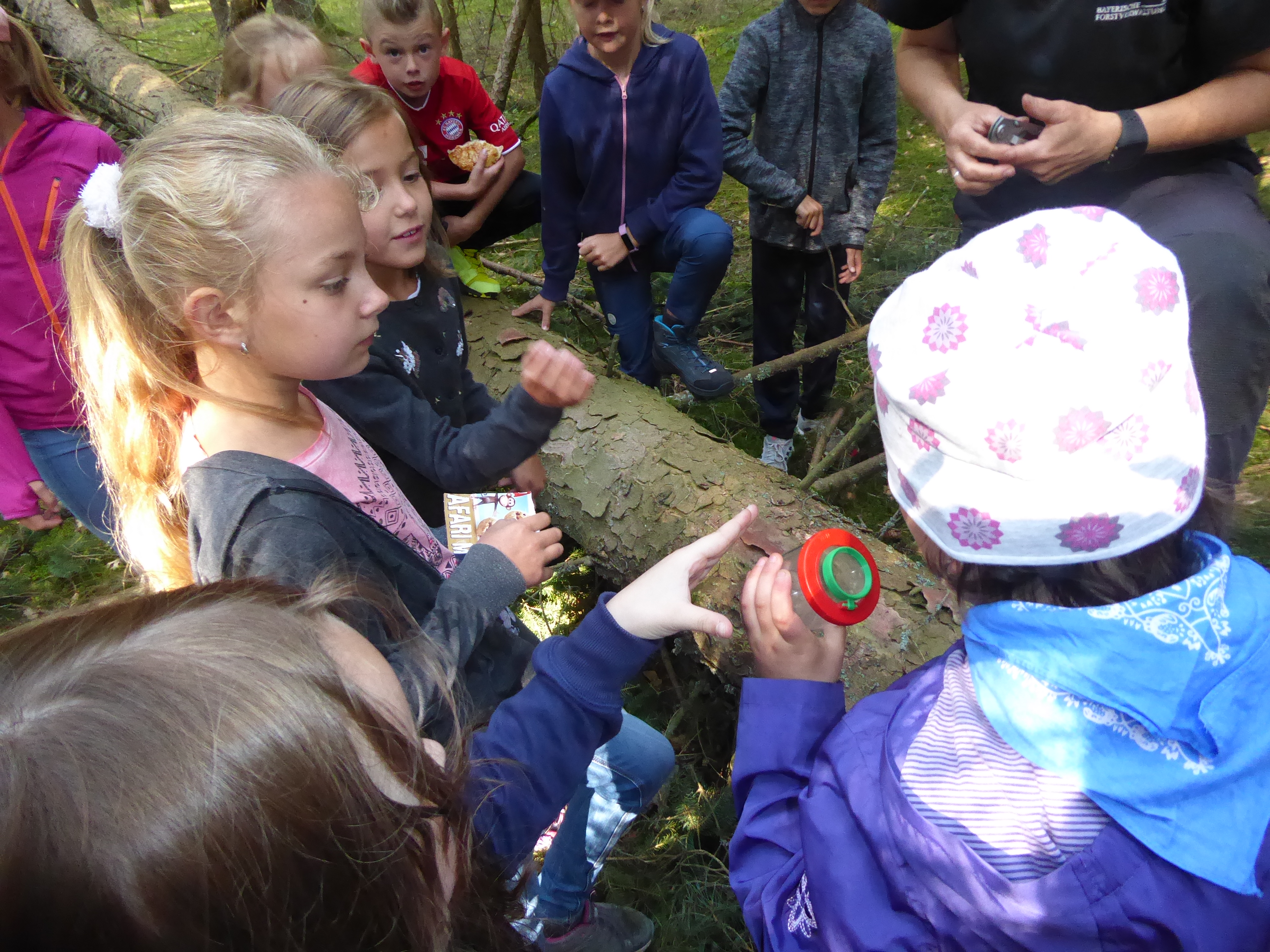 Die Klassen 3 und 4 machten sich mit ihren Klassenlehrerinnen Frau Kreuzer und Frau Liebl auf den Weg zum Bienenstock am Rande des Waldes. Frau Sauer und Frau Hauke mit ihrer Hündin führten die beiden Klassen in den Wald und hatten interessante Spiele vorbereitet. Beim Suchspiel durfte jedes Kind etwas Leichtes, Schweres, Hartes, Großes, Angeknabbertes, Essbares oder Duftendes suchen und tatsächlich wurde auch jeder fündig. So konnten alle auf beeindruckende Weise entdecken, welche wertvollen Schätze im Wald versteckt sind.