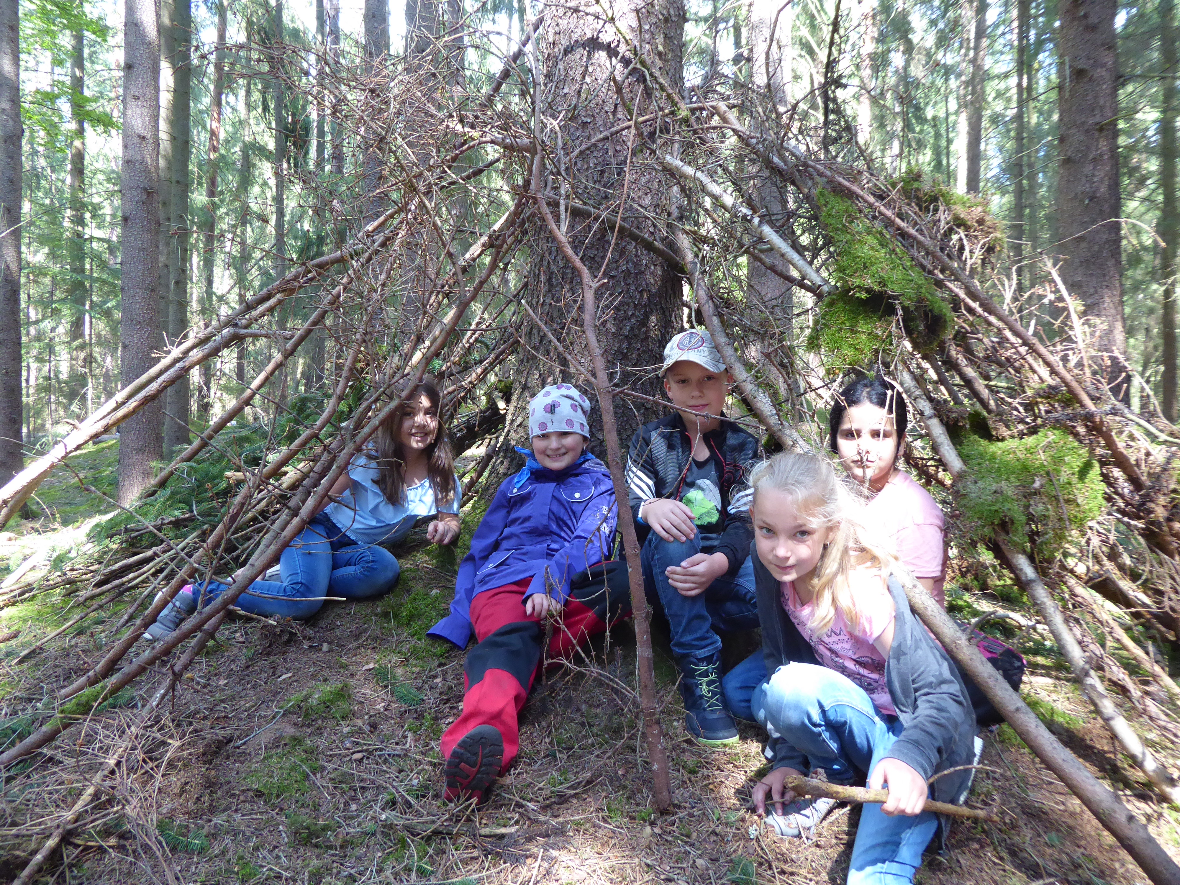 Während einer kurzen Brotzeitpause entdeckten die Kinder Borkenkäfer, Spinnennetze und sogar Vogeleier. Verzaubert von dem Wald bauten die Kinder in Gruppen ihre eigenen Höhlen, Mauern und Tipis. Sogar am Nachmittag bauten einige fleißige Kinder an ihren Kunstwerken weiter.