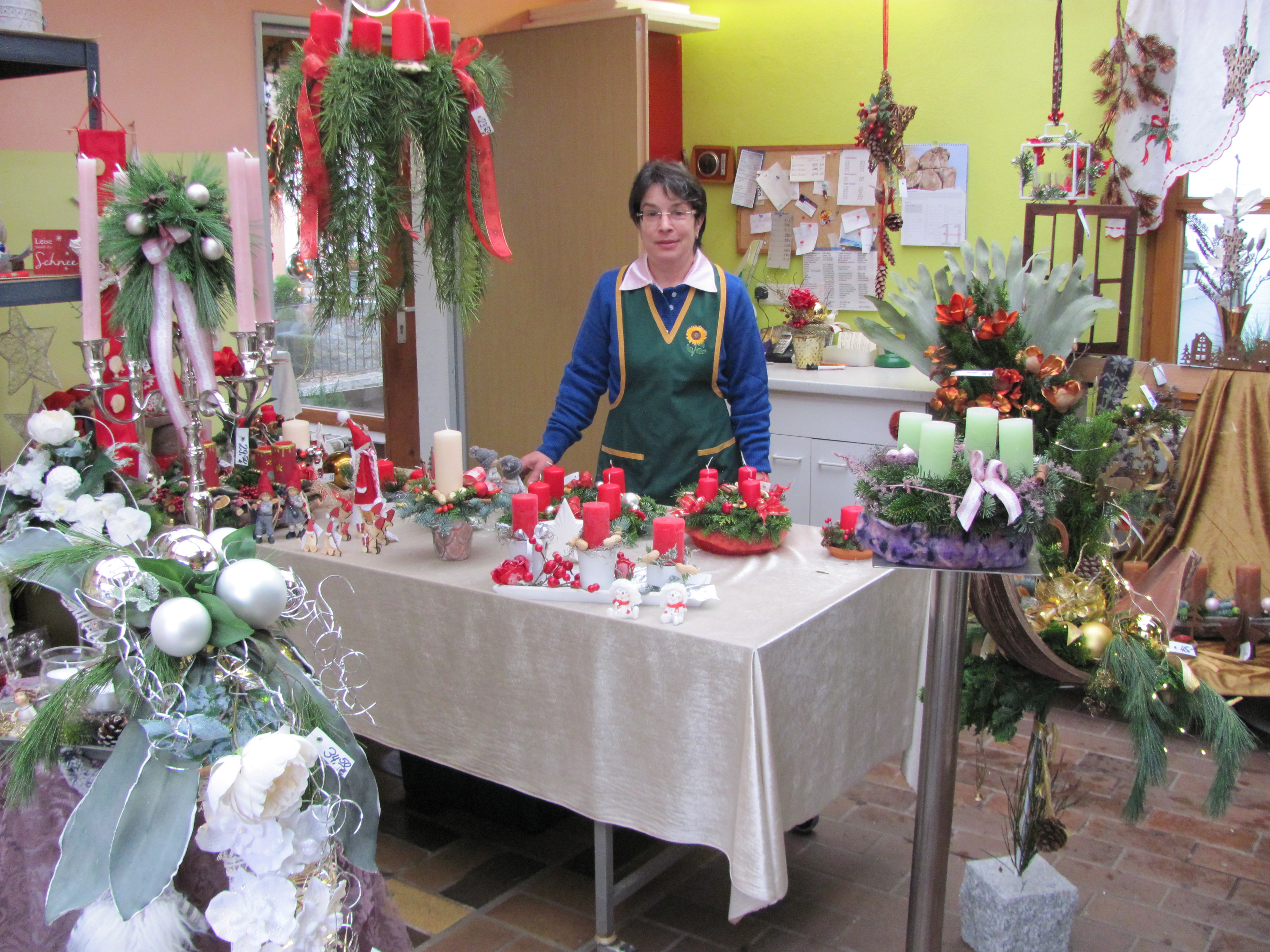 Während am Samstag 25. November strömender Regen niederfiel, konnten die Kunden bei Blumen-Wolfinger bei der Weihnachts-Ausstellung in die richtige Stimmung kommen. Adventskränze und Gestecke in allen möglichen Farbkombinationen wie rosa und Silber, rostfarben, Gold oder auch Rot und aus verschiedensten Materialien wie Wolle oder mit Seidenblumen und Kerzen erfreuten das Auge und verlockten auch zum Kauf. Im Laden gab es noch frische Blumen oder Weihnachtssterne und Elke Hackbarth und ihr Team servierten Glühwein, Plätzchen und Lebkuchen.
