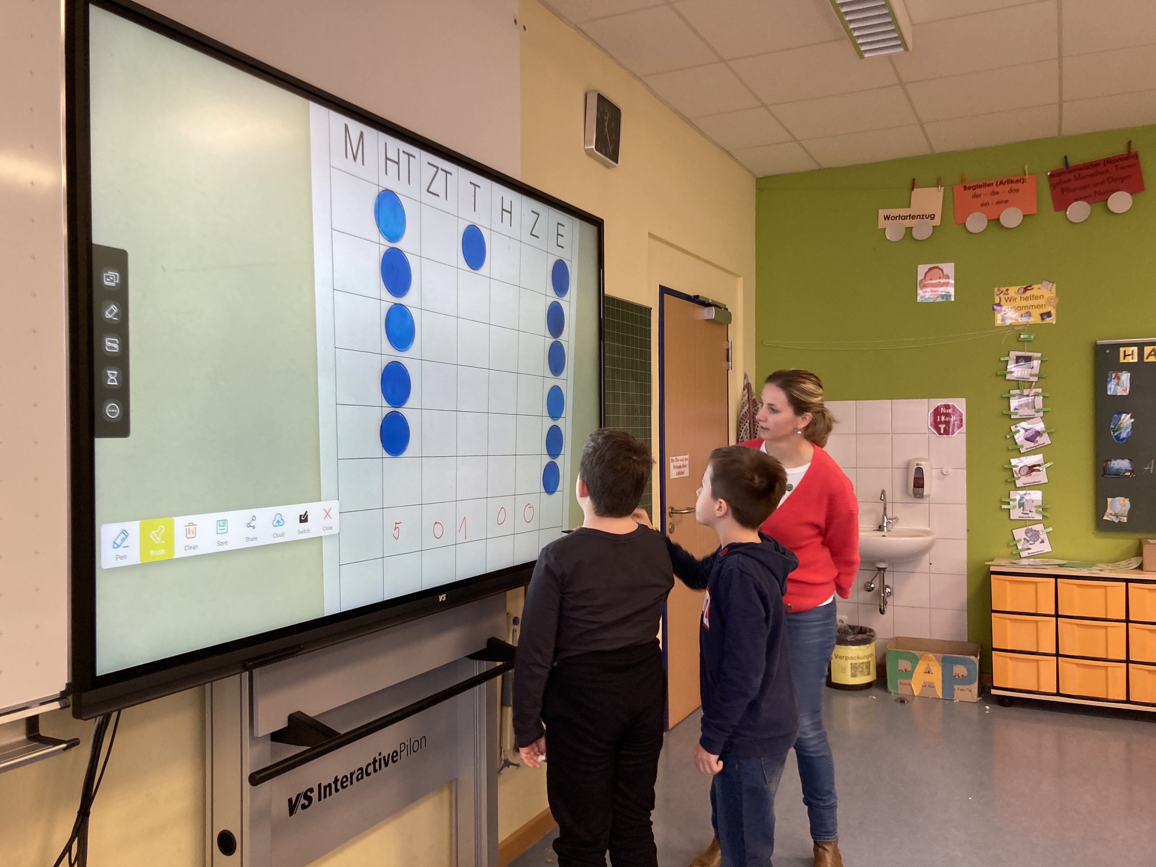 Im Rahmen der fortschreitenden Digitalisierung wurde nun das Klassenzimmer der vierten Klasse mit einer neuen digitalen Tafel und einer modernen Dokumentenkamera ausgestattet. Lehrerin Daniela Kreuzer und ihre SchülerInnen freuten sich sehr über diese Anschaffung und lernen seitdem eifrig mit den neuen Medien. Im Fach Mathematik können beispielsweise Ergebnisse an der Stellenwerttabelle übersichtlich präsentiert werden. So ist es keine Seltenheit, dass sich viele Kinder melden, um an der neuen Tafel zu arbeiten.