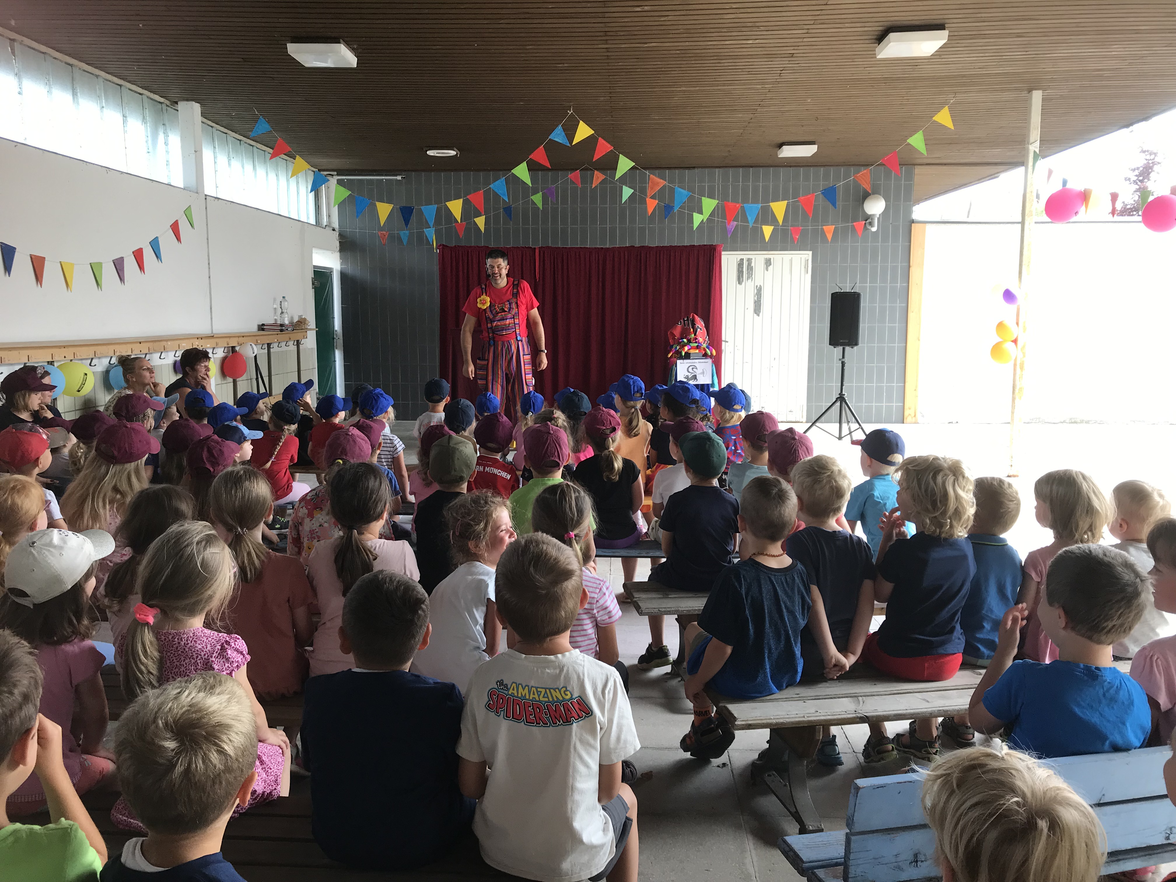 „Hallihallo Zaubermeister vom Hexenberg“. So begrüßten mehr als 100 Kinder lautstark den Zauberer vom Hexenberg, der mit seiner einstündigen Show für beste Unterhaltung sorgte. Mit flotten Sprüchen und lustigen Versprechern brachte er die Kinder zum Lachen und versetzte sie mit Zaubertricks - wie beispielsweise einem schwebenden Tischchen – in Staunen. Der Elternbeirat hatte am Tag zuvor die Halle im Garten mit Luftballons und selbst bemalten Wimpelketten der Kindergartenkinder dekoriert und auch die Sitzbänke aufgebaut. Ein herzliches Dankeschön geht an den Mitarbeiter der Firma GöSta, der die Vorstellung des Zauberers mit einem Gutschein aus einem Preisausschreiben spendiert hat.