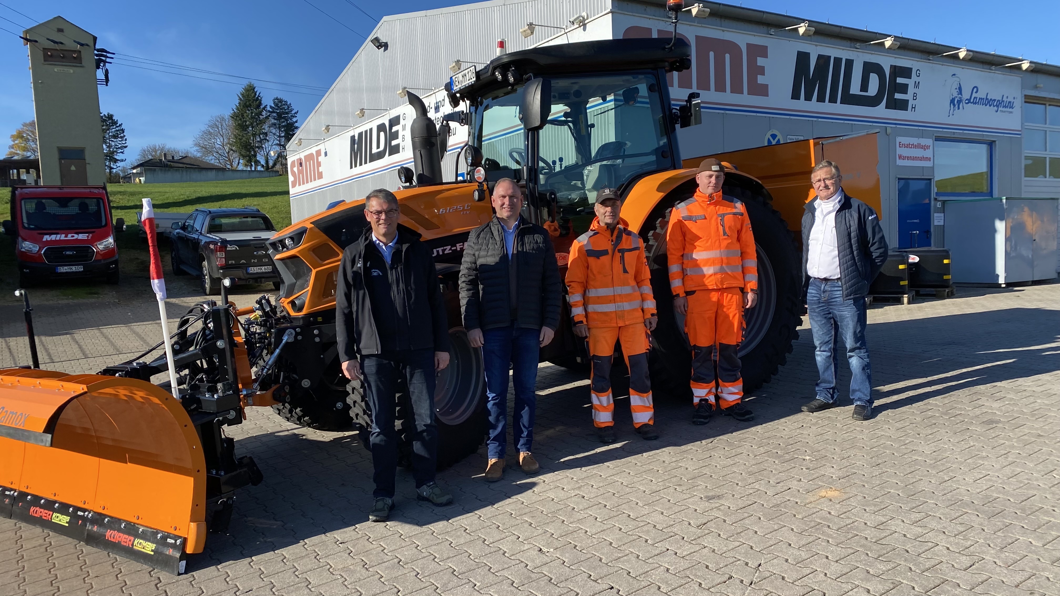 Der Brandneue Deutz-Fahr Kommunalschlepper 6125 C TTV mit angebauten Schneepflug in Front und fahrgeschwindigkeitsgeregelten Winterdienststreuer im Heck, konnte von dem Geschäftsführer Kurt Milde von der Milde GmbH aus Gebenbach an Bürgermeister Richard Kammerer sowie seinen Bauhofmitarbeitern Werner Blendel sowie Philip Würdinger übergeben werden. Der Deutz-Schlepper 6125 C Kommunal mit stufenlosen Getriebe, Klimaanlage, Druckluft und angebauter Fronthydraulik mit Frontzapfwelle soll ganzjährig zum Einsatz kommen. Er soll bei Mäh- und Mulcharbeiten, Transportarbeiten im Sommer sowie für den Räum- und Streudienst im Winter eingesetzt werden. Der Marktrat aus Mantel hatte sich in Sicht auf den Kommunalschlepper die Entscheidung nicht leichtgemacht, verschiedene Fahrzeuge ließ man sich anbieten und Diskussionen wurden geführt, bevor man sich für den Deutz-Fahr 6125 C TTV Kommunal hinsichtlich der überzeugenden Technik und dem guten Preisleistungsverhältnis entschied. In Verbindung mit der Übergabe an dem Markt Mantel stellvertretend durch Herrn Bürgermeister Richard Kammerer und seinen Bauhofmitarbeitern Werner Blendl und Philip Würdinger wünschten Kurt Milde und Verkaufsmitarbeiter Wolfgang Würth allzeit gute Fahrt.