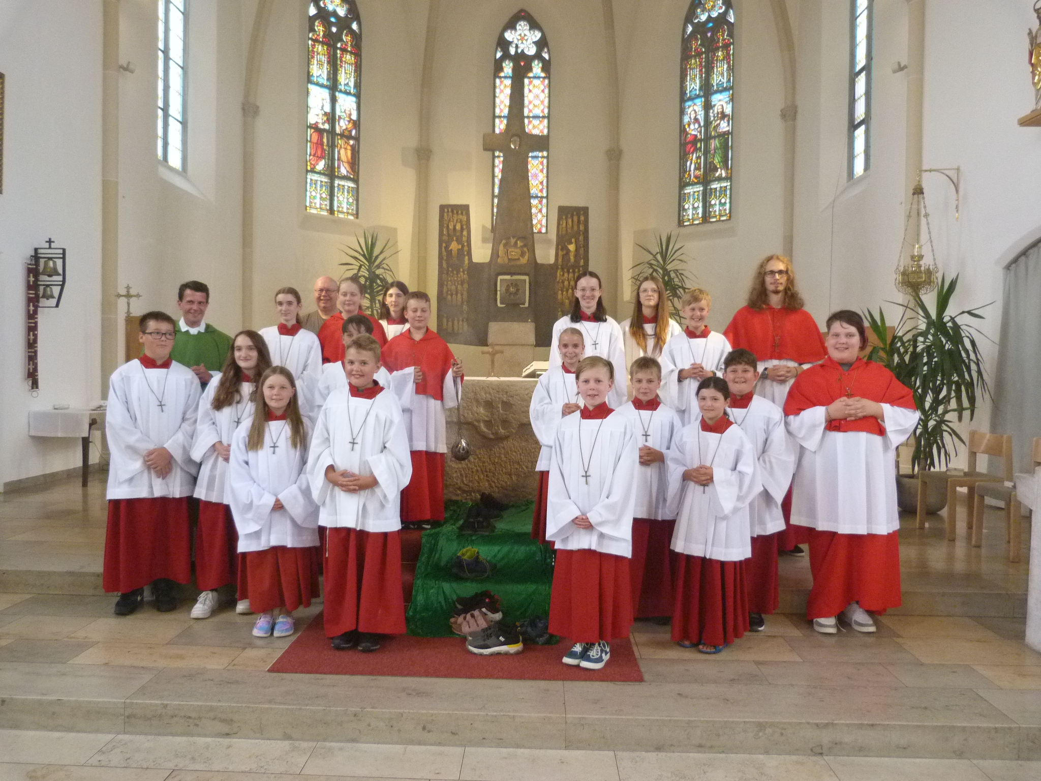 „Am heutigen Gottesdienst beginnen zwei Jungen aus unserer katholischen Pfarrgemeinde ihren Dienst als Ministranten“, so Pfarrer Thomas Kohlhepp in seiner Begrüßung am Samstagabend 21. Juli. Ebenso werden zwei „Alte Hasen“ der Ministranten Maximilian und Milena verabschiedet, so der Geistliche weiter. Wir erleben heute ein Kommen und Gehen vieler Füße in ganz unterschiedlichen Schuhen. In der Regel, wenn wir zum Gottesdienst gehen, tragen wir Schuhe. Auf das Thema Schuhe bauen die Verantwortlichen weiter auf. So einige Minis: einer trägt Schuhe mit Absatz, für besondere Anlässe; ein Anderer hat Turnschuhe, für Spiel und Spaß bei Ausflügen in der Gruppe; ein Weiterer hat Arbeitsschuhe dabei, die Arbeit für unser Gemeindeleben nachzugehen; ein Ministrantin zeigt Wanderschuhe, denn das Profil gibt Halt und Sicherheit im Leben, auch in Verbindung auf Gott; ein weiterer Ministrant zeigt dreckige Schuhe, den es gibt Wege als Ministrant die oft bewältigt werden müssen, wie lange Prozessionen mit Tragen von Fahne oder Vortragekreuz; und es gibt Hausschuhe, denn als Ministrant kenn ich mich in dieser, einen Kirche gut aus, ich bin bei Jesus genauso geborgen, wie daheim bei meiner Familie. Die Schuhe, vor dem Altar platziert, zeigen die Vielfalt der unterschiedlichen Schuhe. So unterschiedlich wir Menschen sind, so unterschiedlich sind unsere Schuhe, erklärte Pfarrer Kohlhepp. Große, kleine, für Jungs, für Mädels, Männer und Frauen, sportlich, elegant, bequem, wasserdicht, nagelneu oder gebraucht, die Bandbreite ist groß, so der Geistliche weiter. Aber alle haben den gleichen Weg, haben dasselbe Ziel im Blick: den Spuren Jesu folgen. An den Schuhen, die unter den Gewand der Ministranten hervorblitzen, kann man erkennen, was für ein Kind, was für ein Jugendlicher in dem Gewand steckt: sportlich, stylisch, bunt, bequem, funktional und vieles mehr. So durften die beiden Neuen Felix und Leo nach dem Aufnahmegebet und Segen durch den Geistlichen symbolisch ihre mitgebrachten Schuhe mit zu den Anderen aufgereihten stellen. Nach Umhängen des Ministrantenkreuzes sind sie nun offiziell in die Gruppe der Diener Gottes aufgenommen und übernahmen während der Messe den Dienst zur Gabenbereitung.